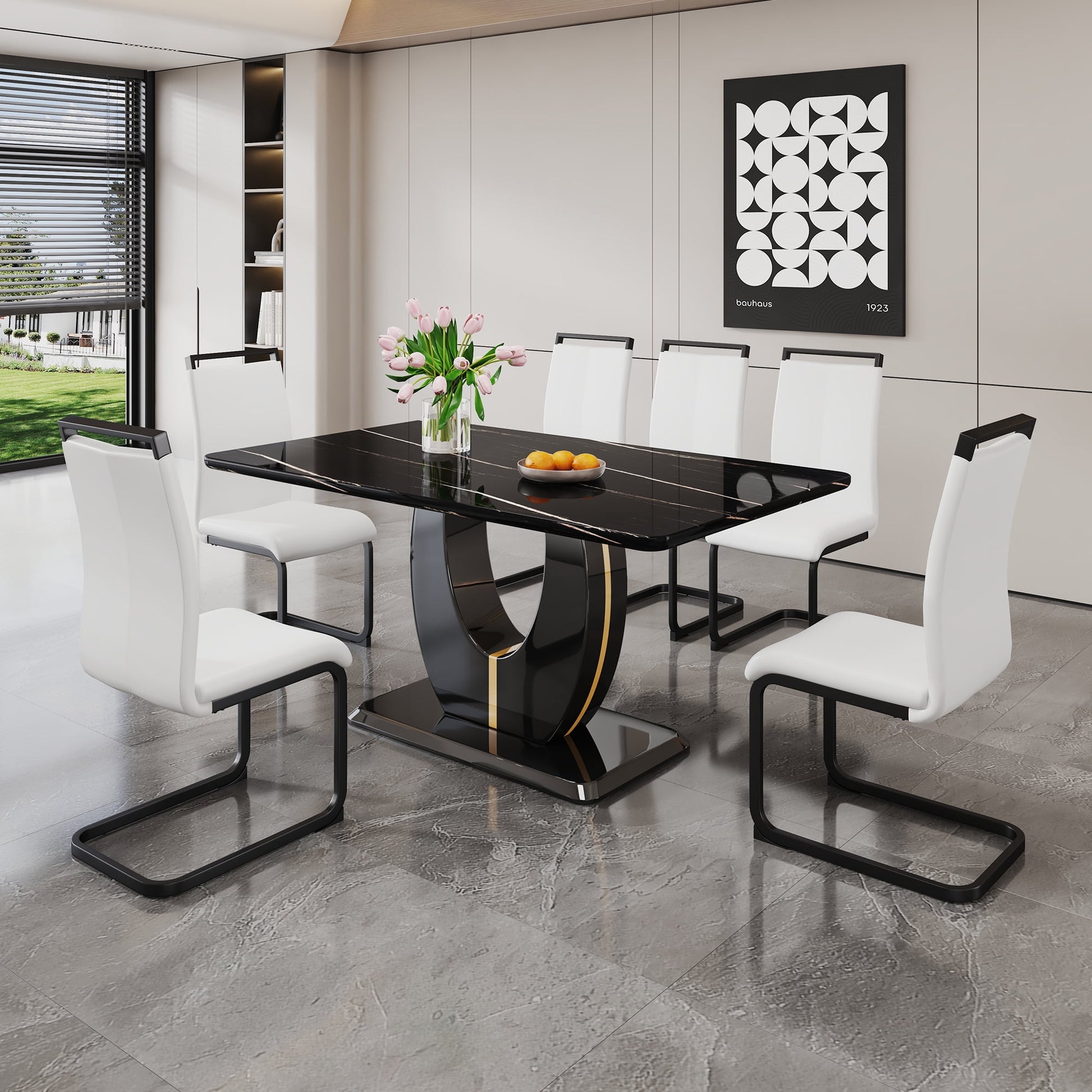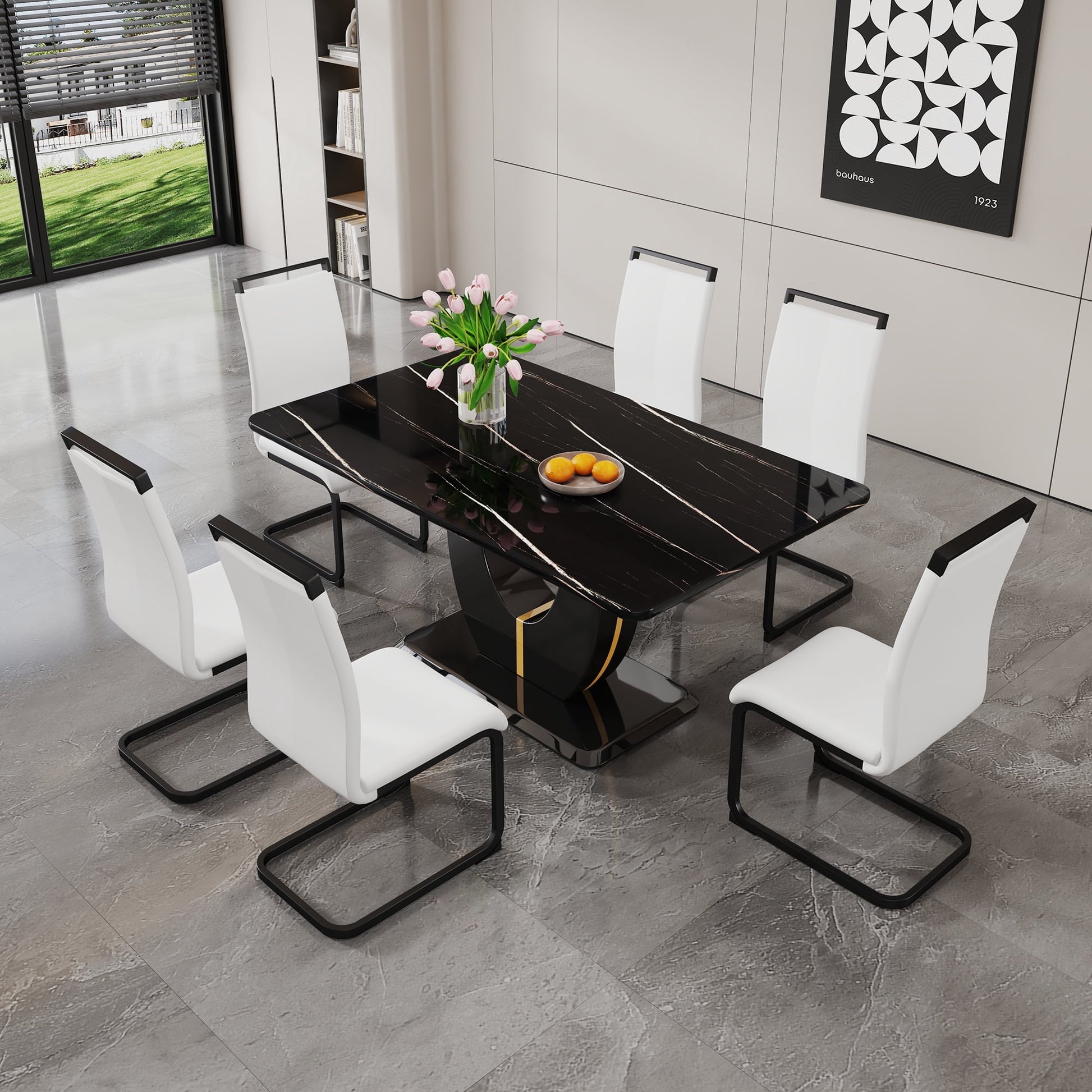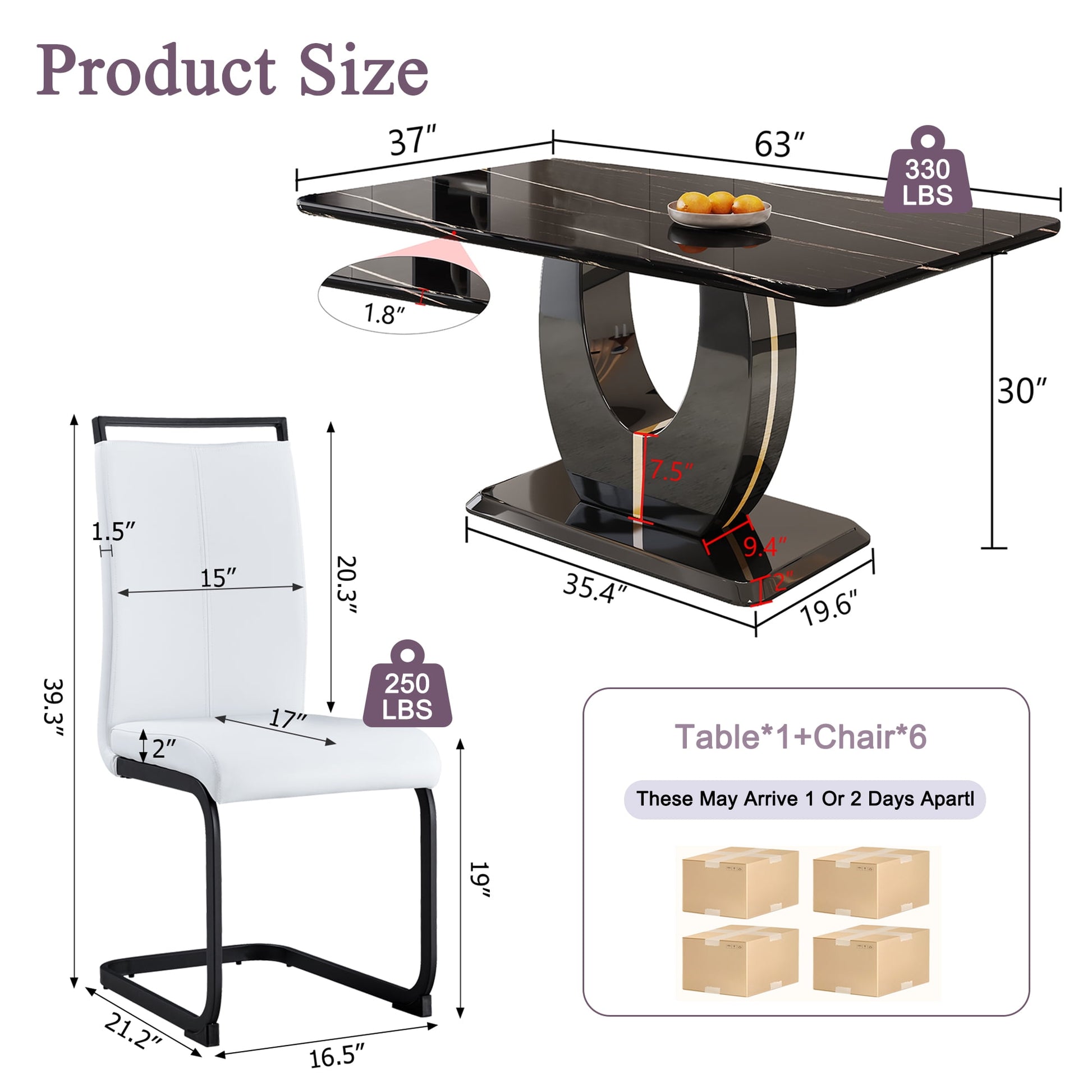 63" Dining Table Set for 6, Modern Black Faux Marble Rctangular Table with 6 Upholstered PU Leather Kitchen Chairs, White