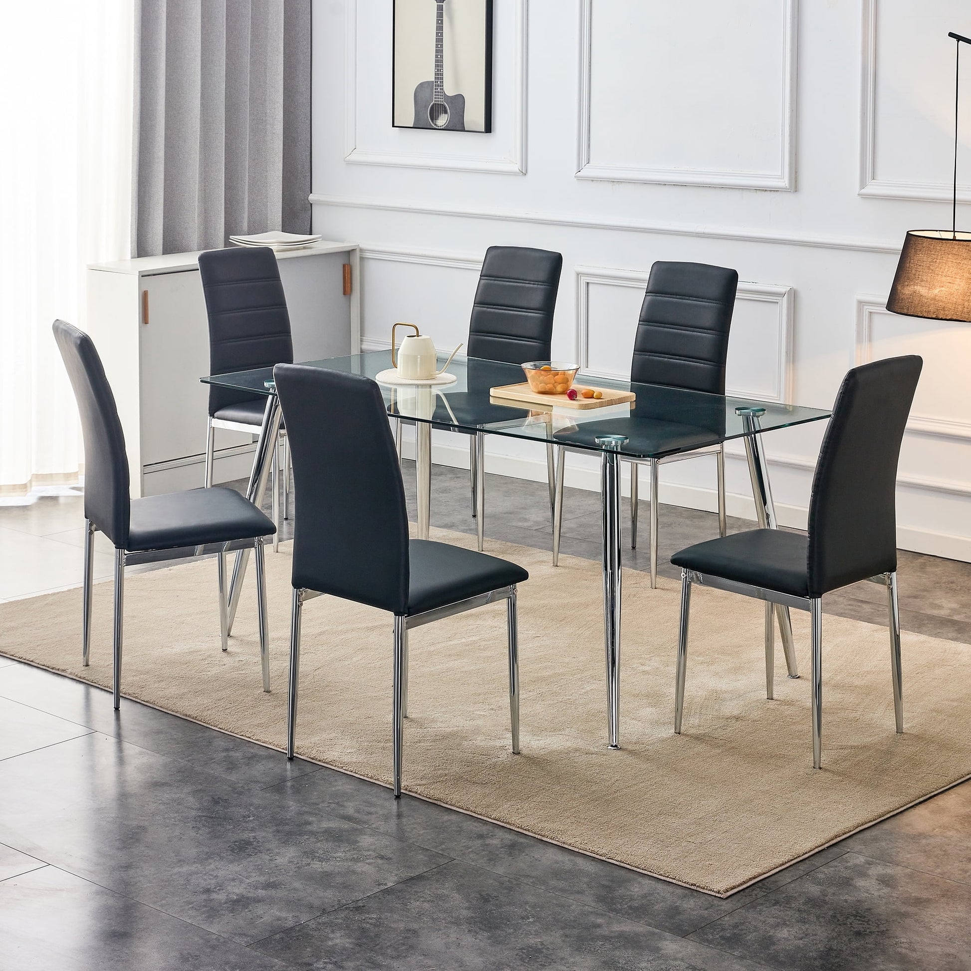 A compact glass dining table paired with PU leather dining chairs is a perfect choice for stylish and practical dining spaces. The transparent glass table adds a modern and spacious feel to any room, while the soft kitchen chairs provide comfort and elegance. The combination of the two creates a visually stunning contrast. The dining table set is versatile and suits various interior styles, from modern to traditional. With easy-to-clean leather upholstery and a compact size, this dining room set is ideal for small spaces. Don't compromise on style or functionality when you can have both with this beautiful and practical dining set.