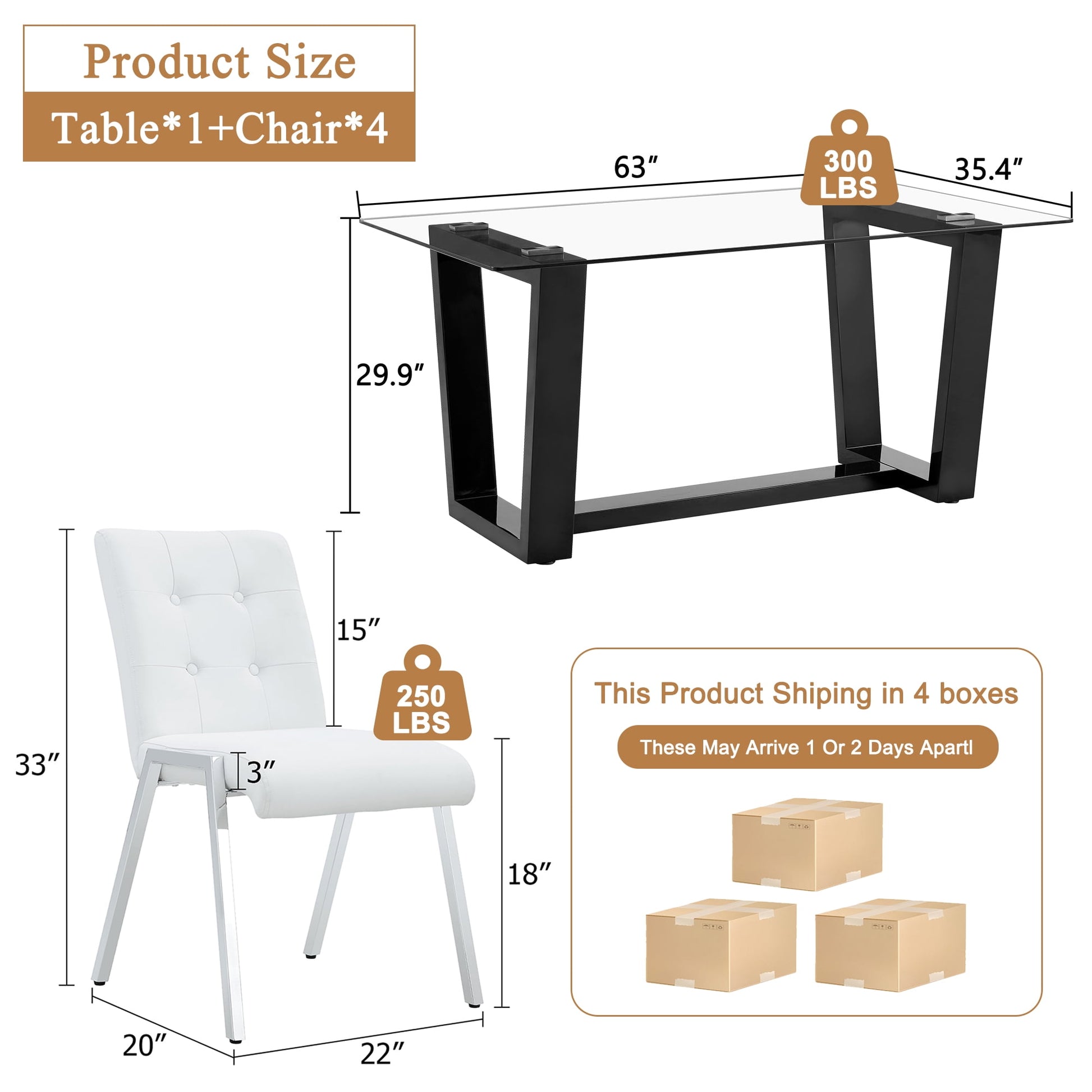 63" Glass Dining Table Set for 4, Sudica Black Legs Kitchen Table Set with Upholstered Faux Leather Dining Room Chairs, White