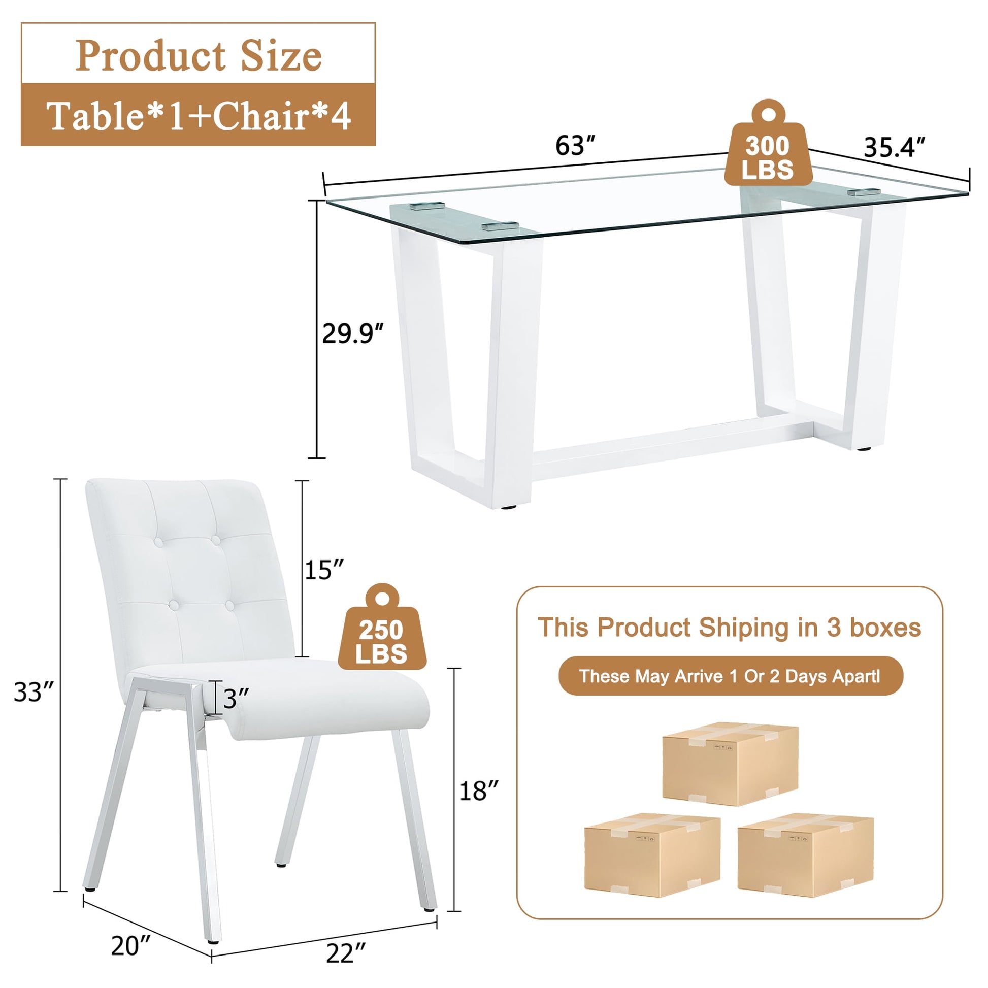63" Glass Dining Table Set for 4, Sudica White Legs Kitchen Table Set with Upholstered Faux Leather Dining Room Chairs, White