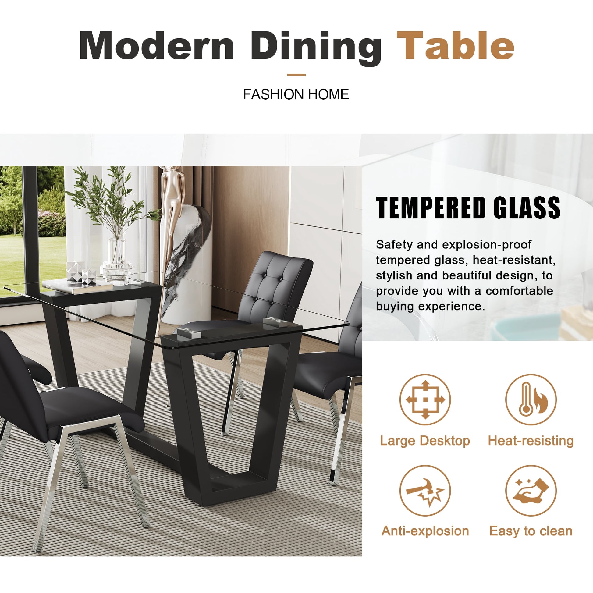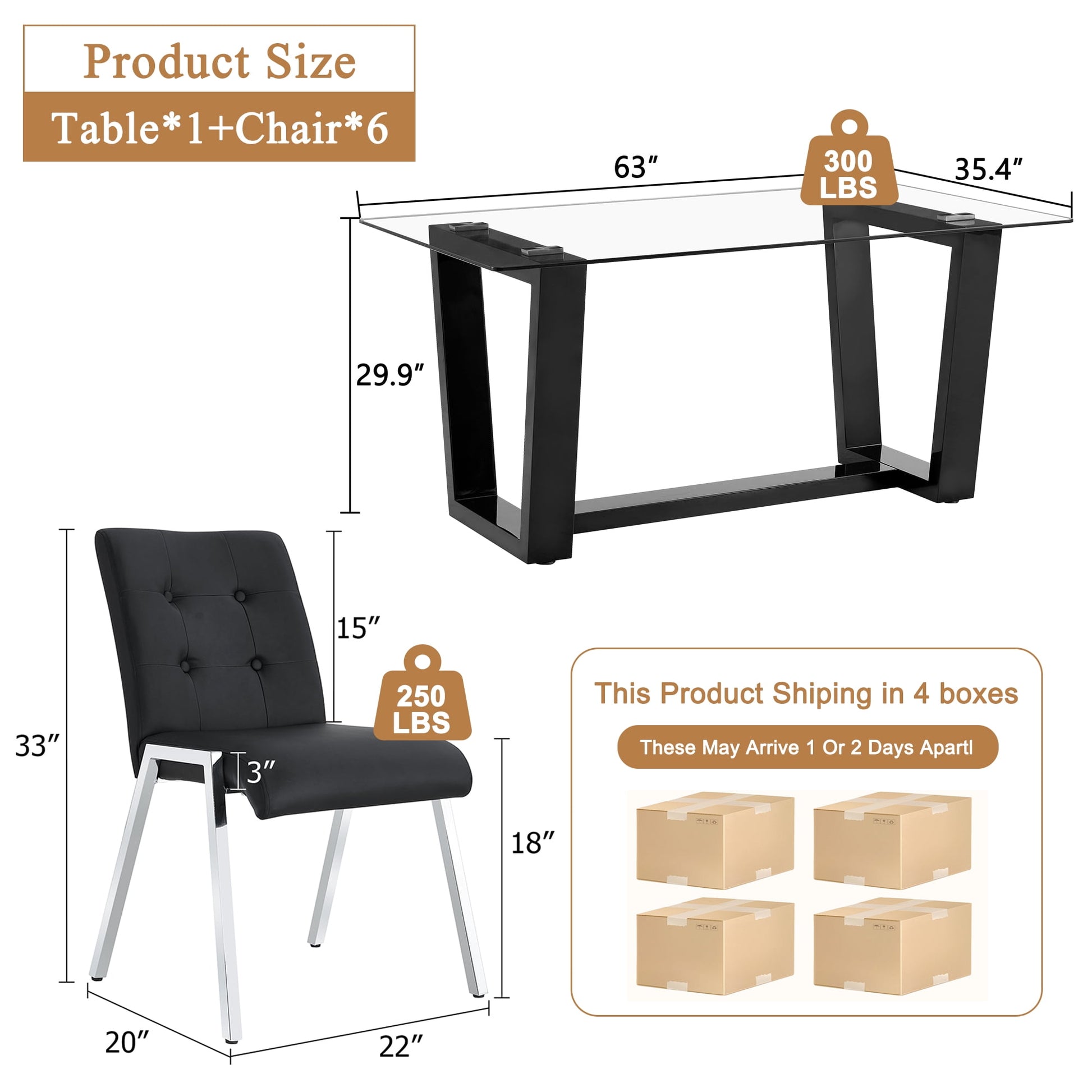 63" Glass Dining Table Set for 6, Sudica Black Legs Kitchen Table Set with Upholstered Faux Leather Dining Room Chairs, Black