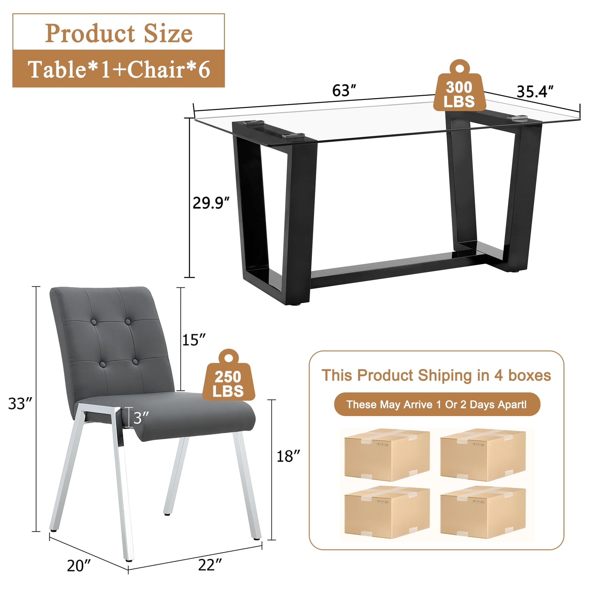 63" Glass Dining Table Set for 6, Sudica Black Legs Kitchen Table Set with Upholstered Faux Leather Dining Room Chairs, Gray