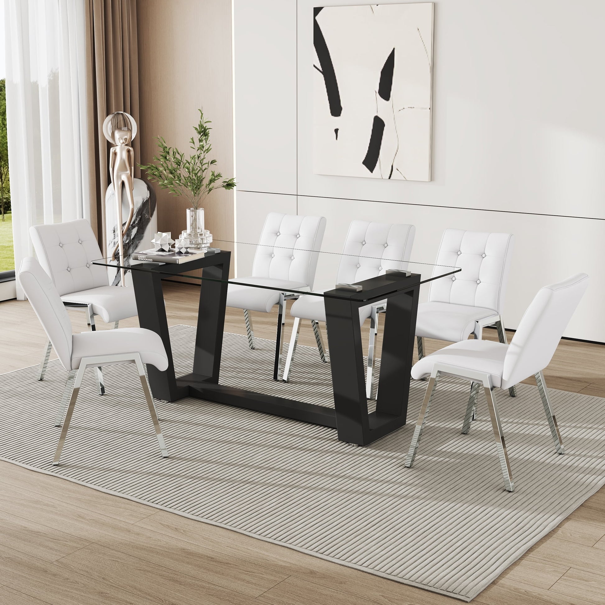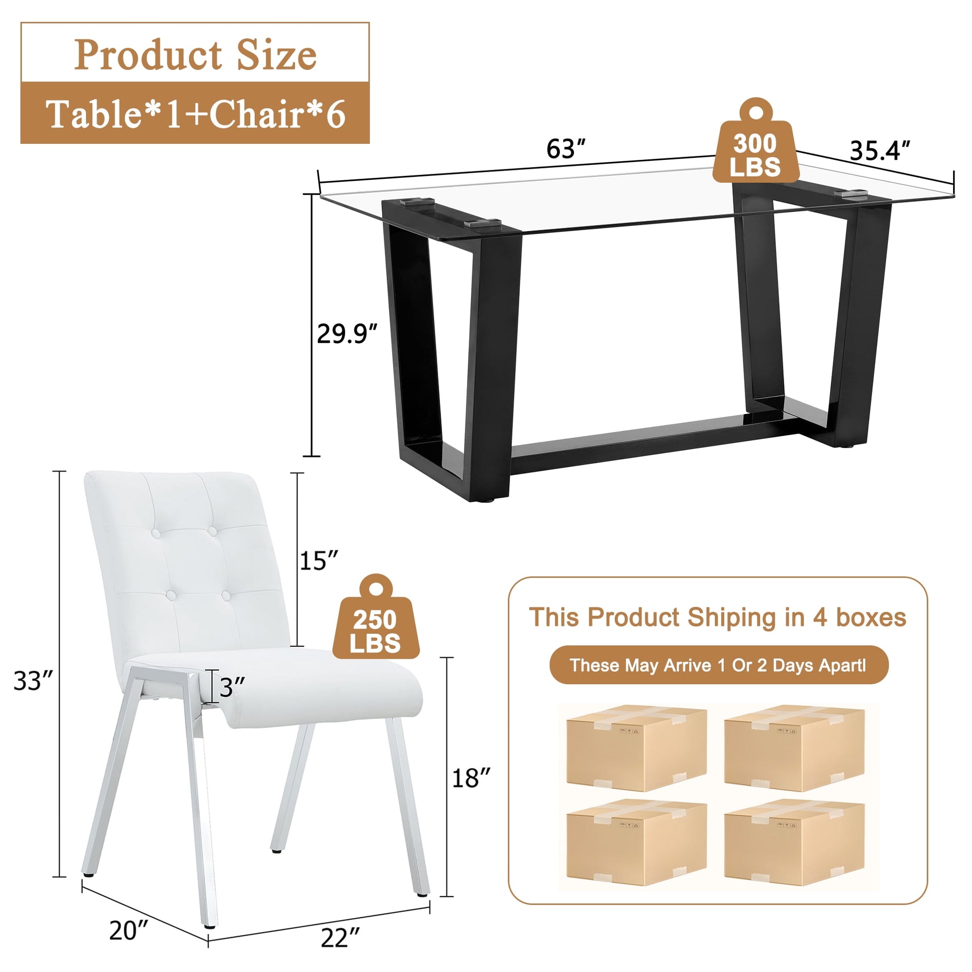 63" Glass Dining Table Set for 6, Sudica Black Legs Kitchen Table Set with Upholstered Faux Leather Dining Room Chairs, White