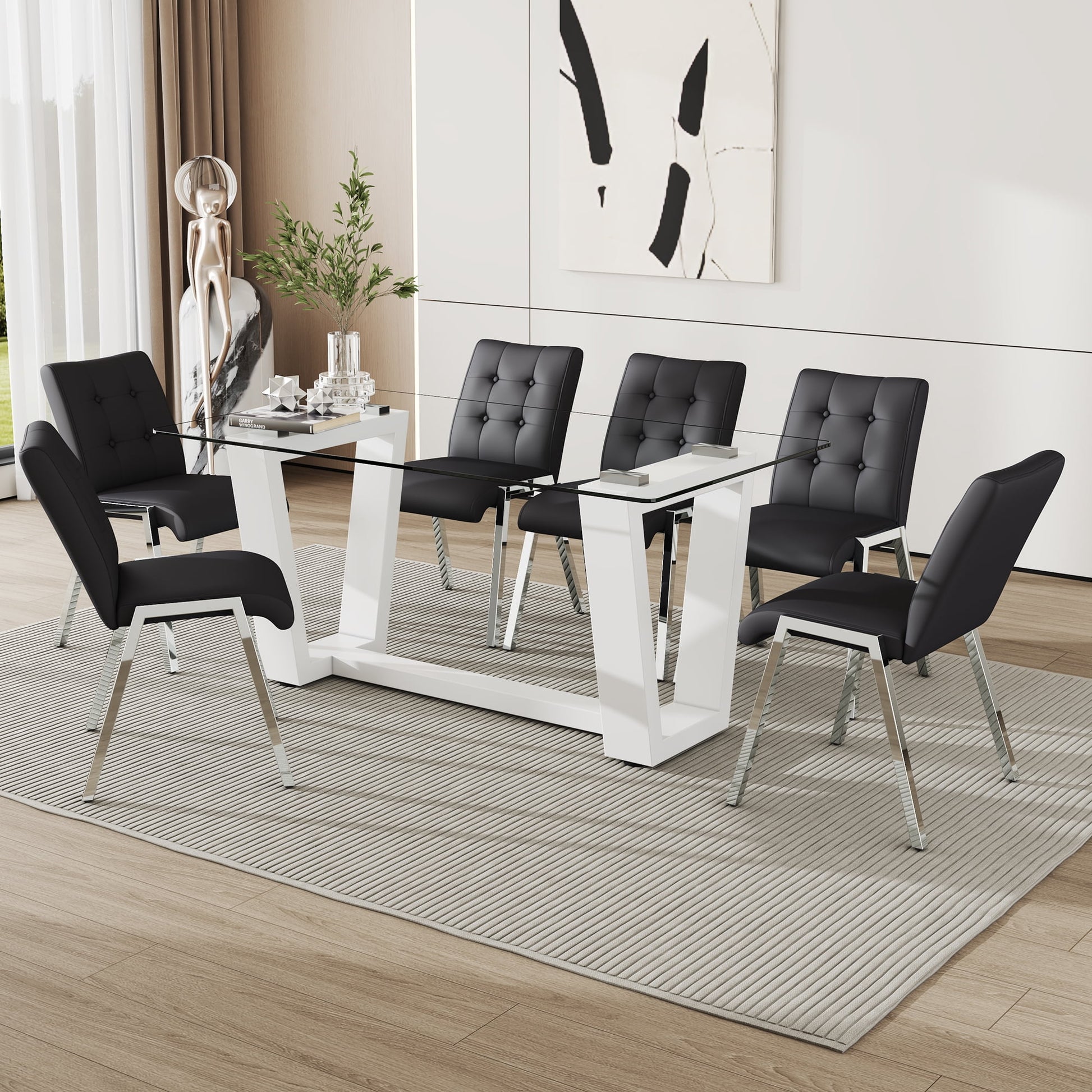 63" Glass Dining Table Set for 6, Sudica White Legs Kitchen Table Set with Upholstered Faux Leather Dining Room Chairs, Black