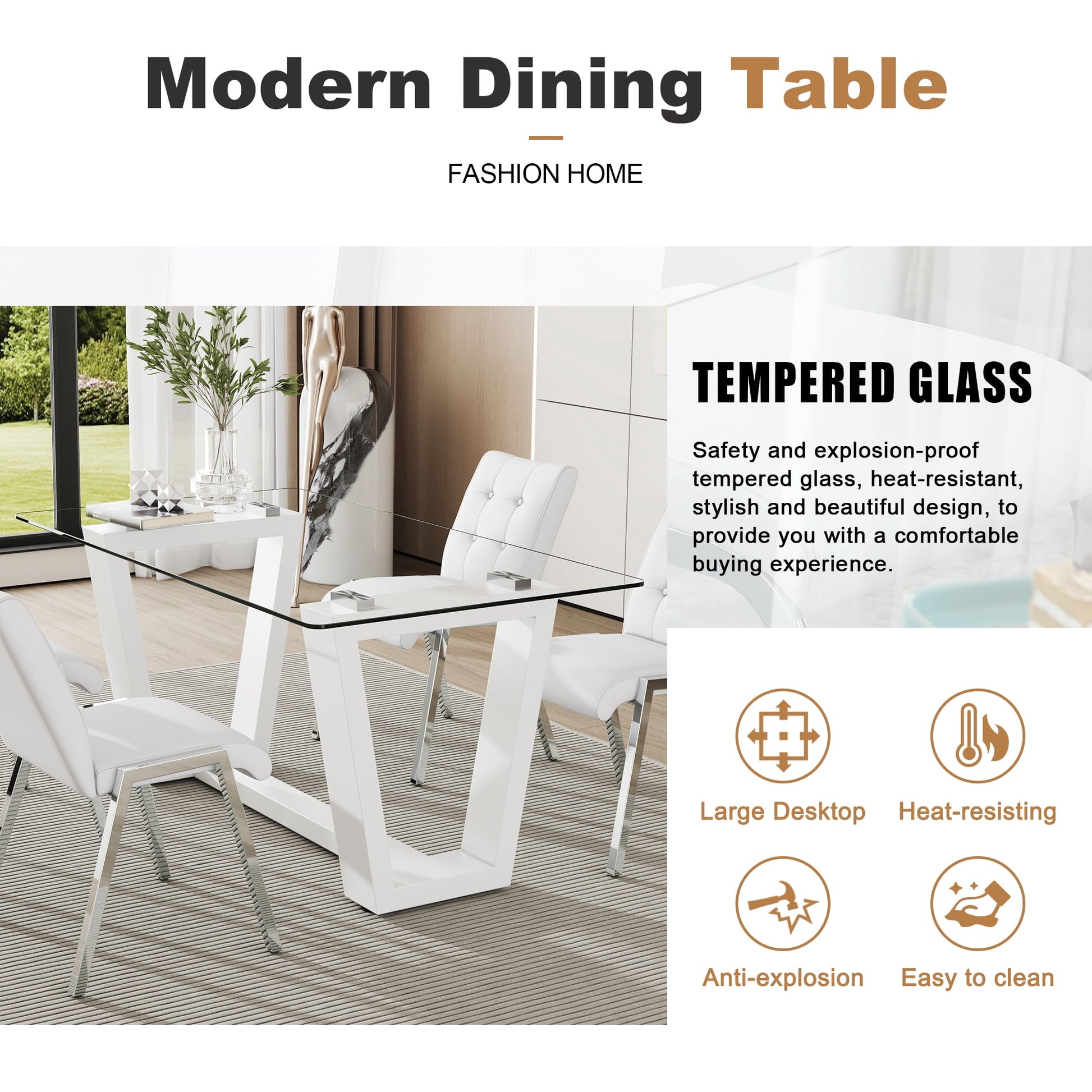 - ¡¾Durable Glass Dining Table¡¿Crafted with a 0.39 inch thick tempered glass top, this table exudes reliability and elegance. The durable MDF base adds a touch of sophistication and ensures stability and long-term durability. With an load-bearing capacity of over 300 pounds, you can confidently gather around this table for countless meals and memorable moments.
