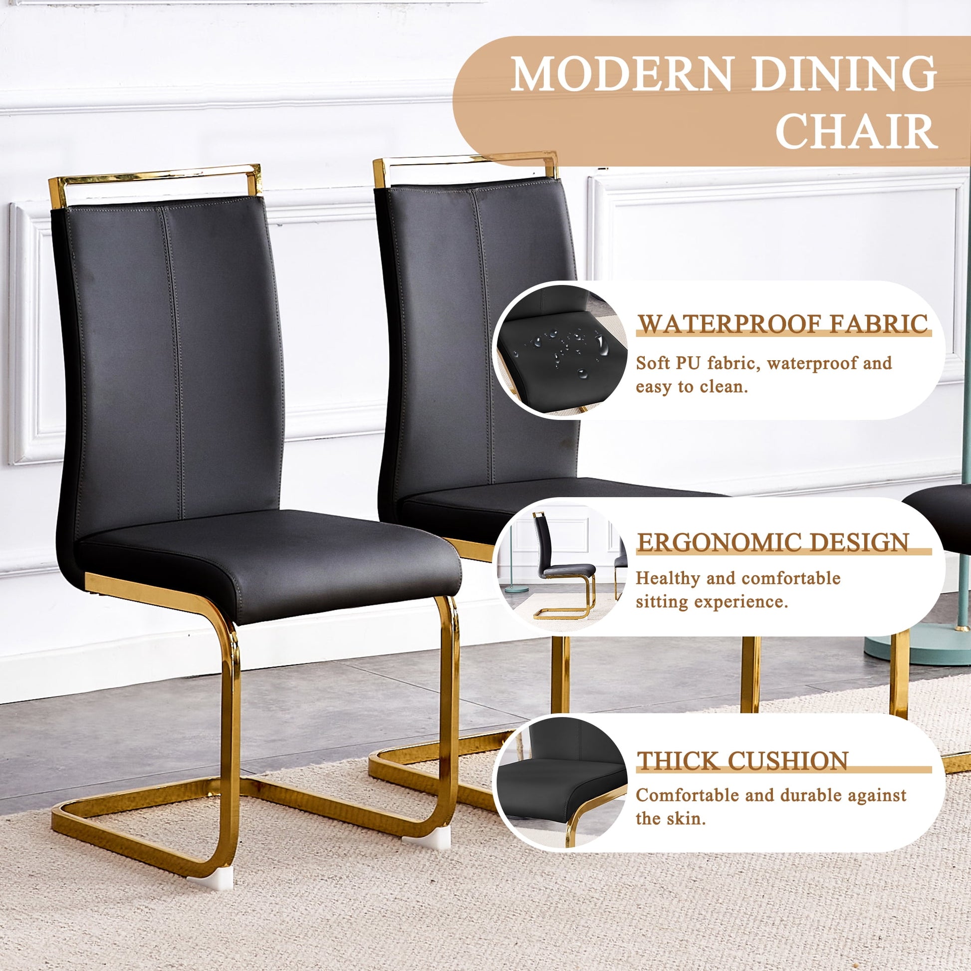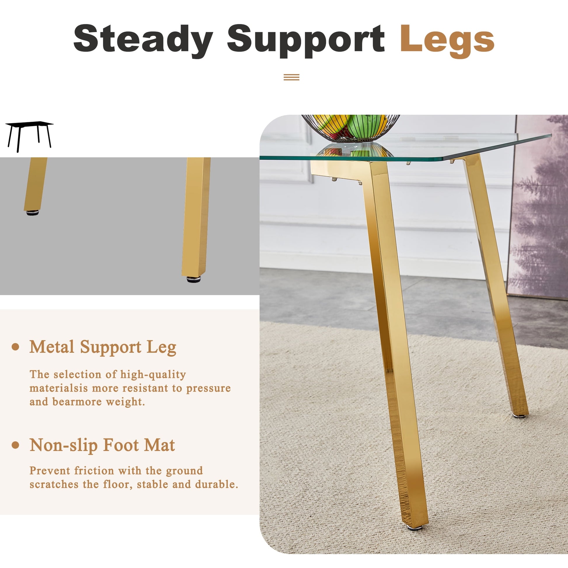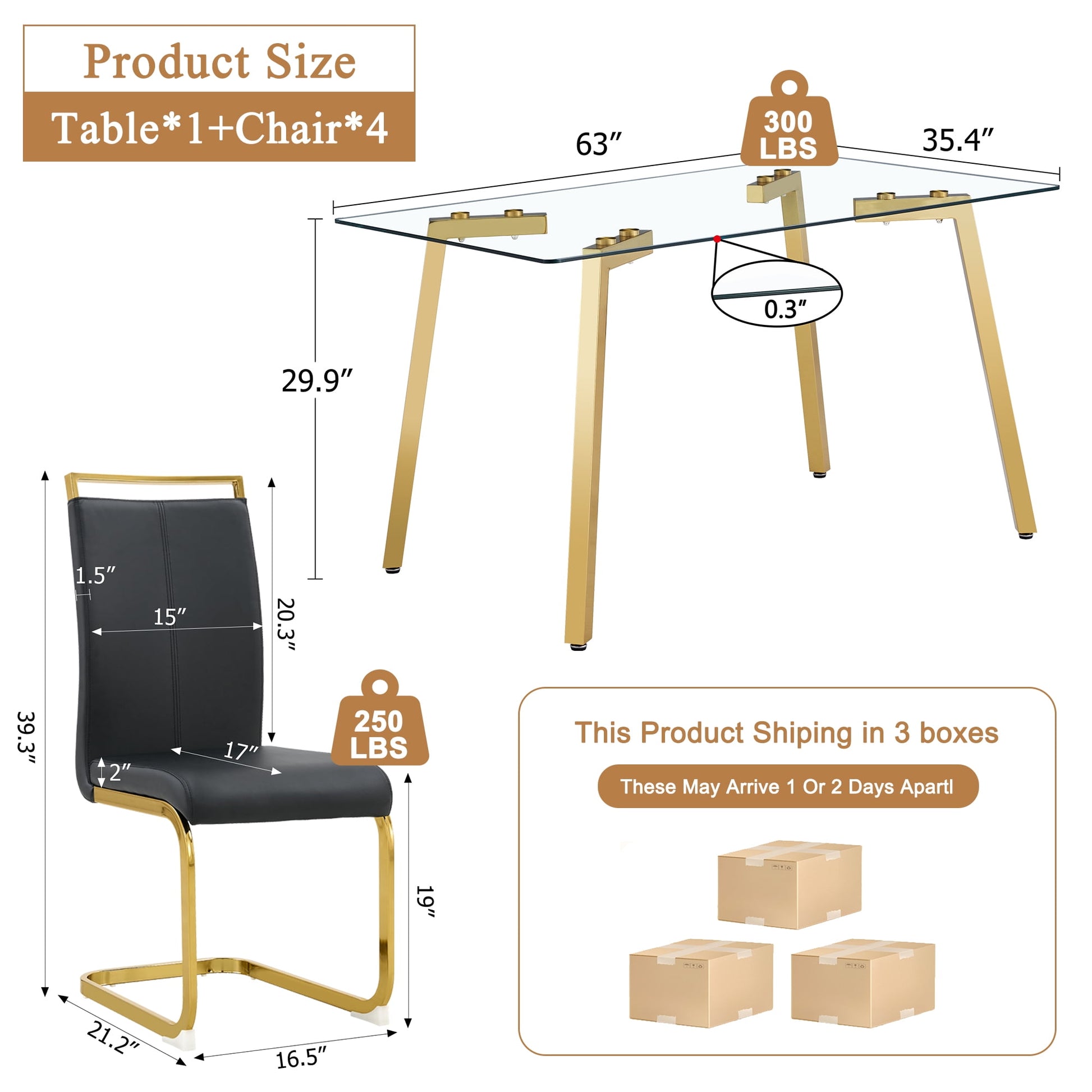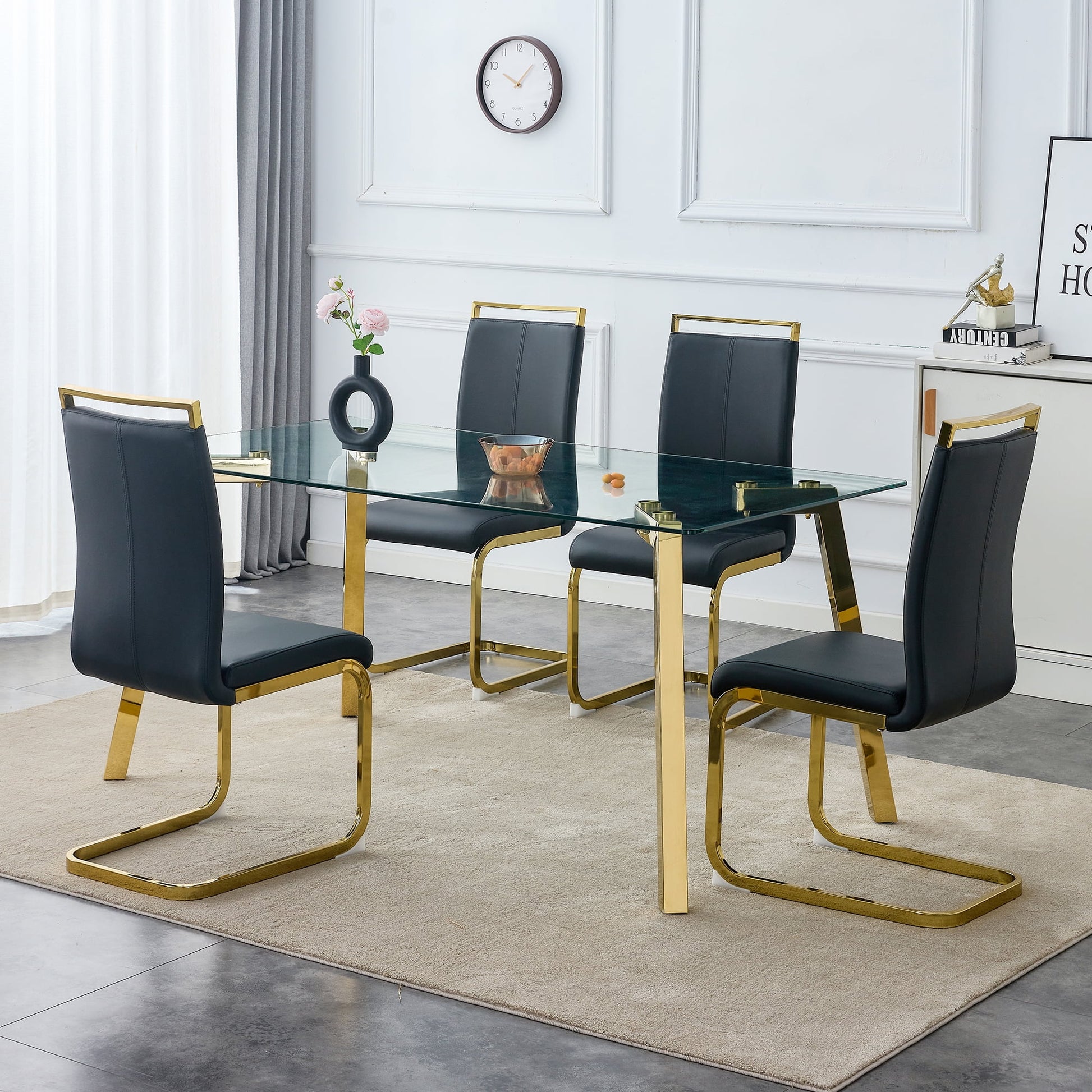 63" Large Glass Dining Table Set for 4, Sudica Gold Legs Kitchen Table with Faux Leather Dining Chairs,Black