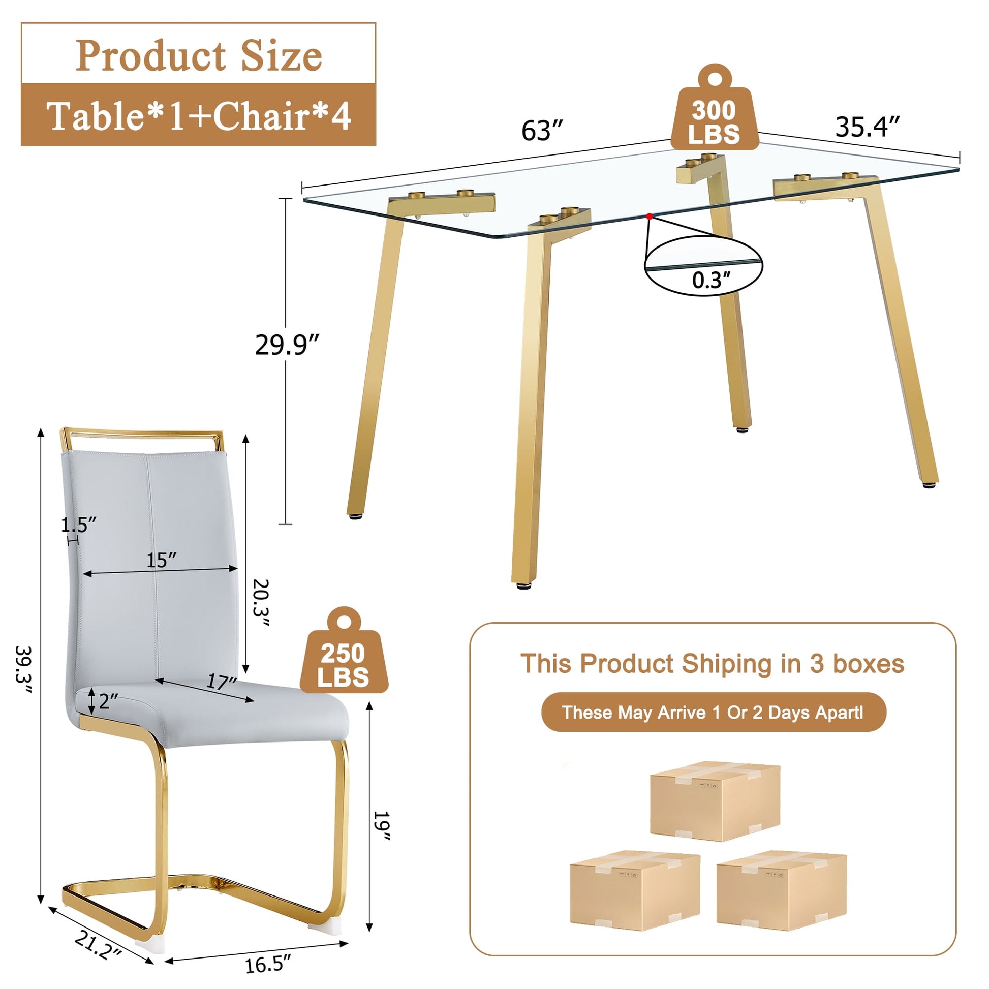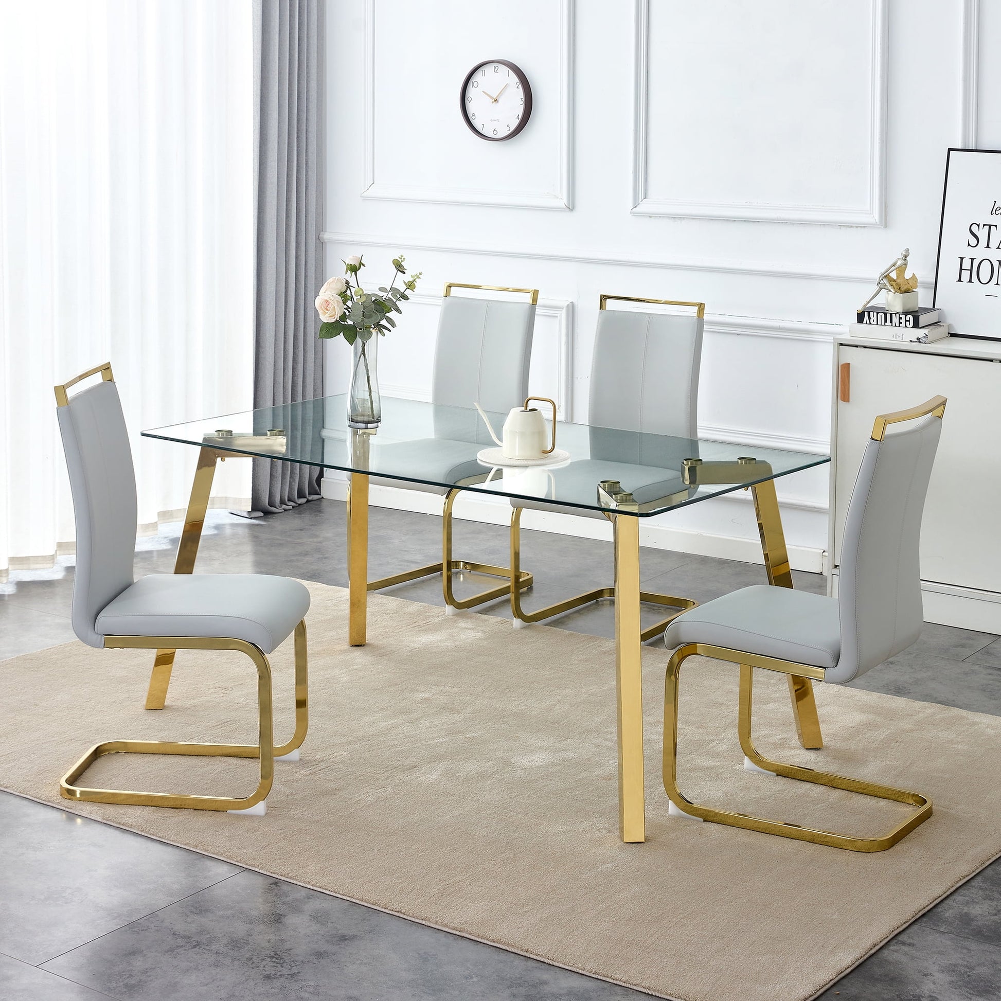 63" Large Glass Dining Table Set for 4, Sudica Gold Legs Kitchen Table with Faux Leather Dining Chairs,Light Gray