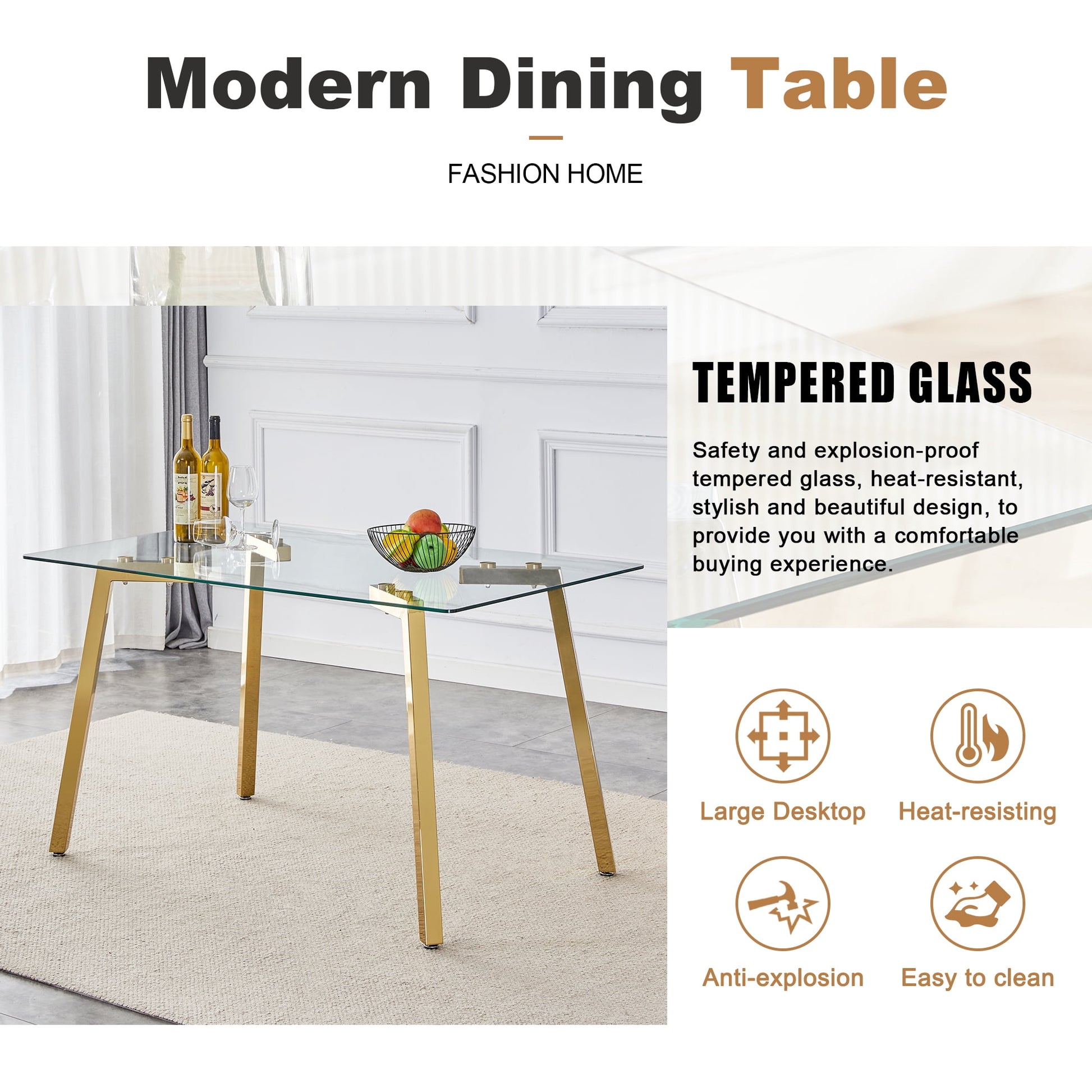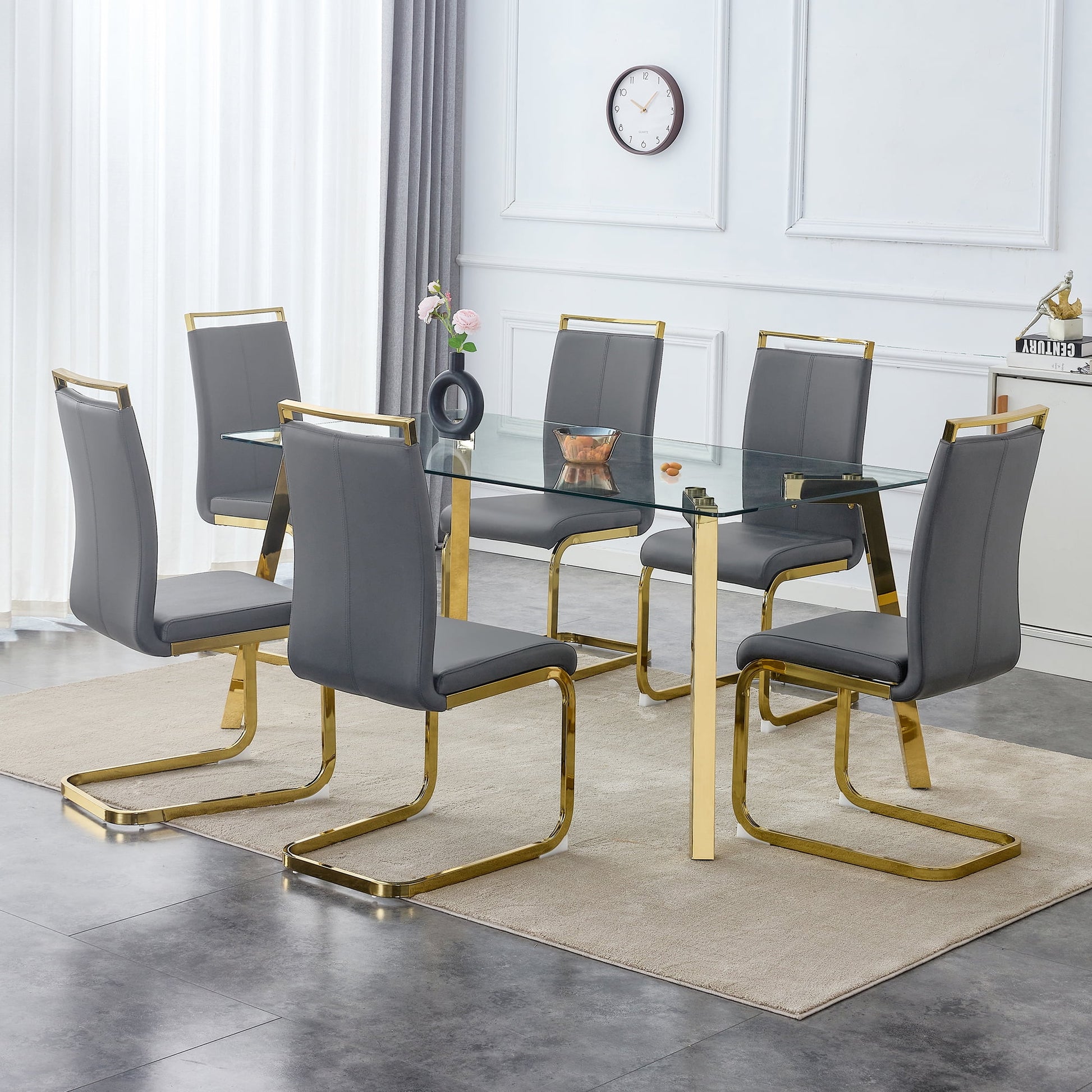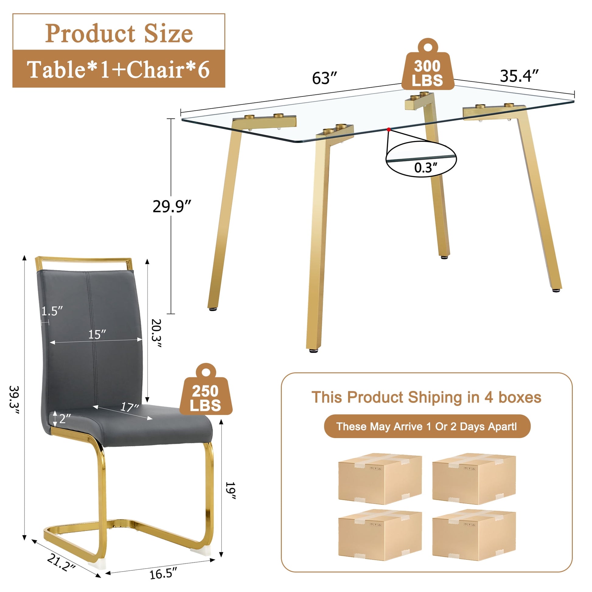 63" Large Glass Dining Table Set for 6, Sudica Gold Legs Kitchen Table with Faux Leather Dining Chairs,Gray