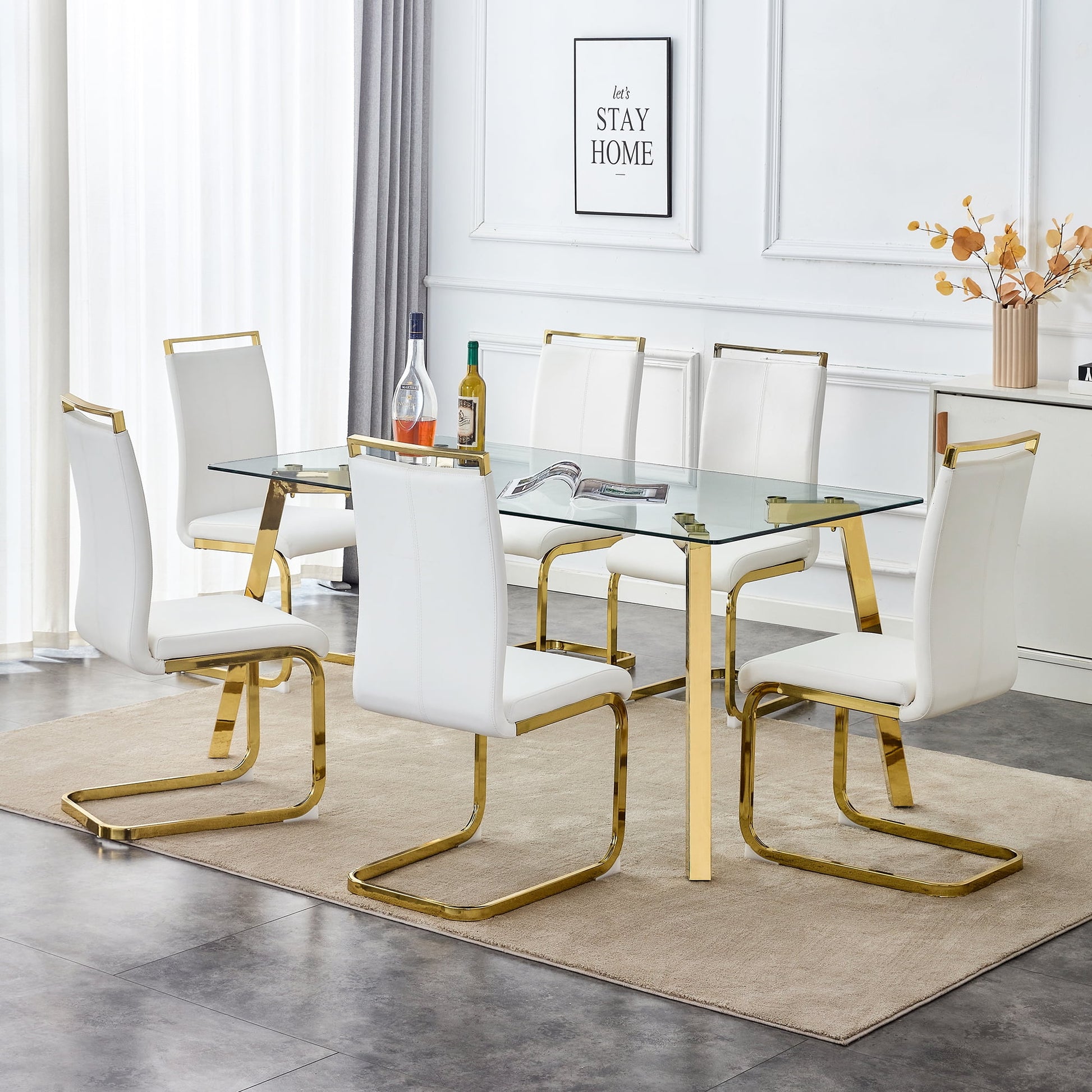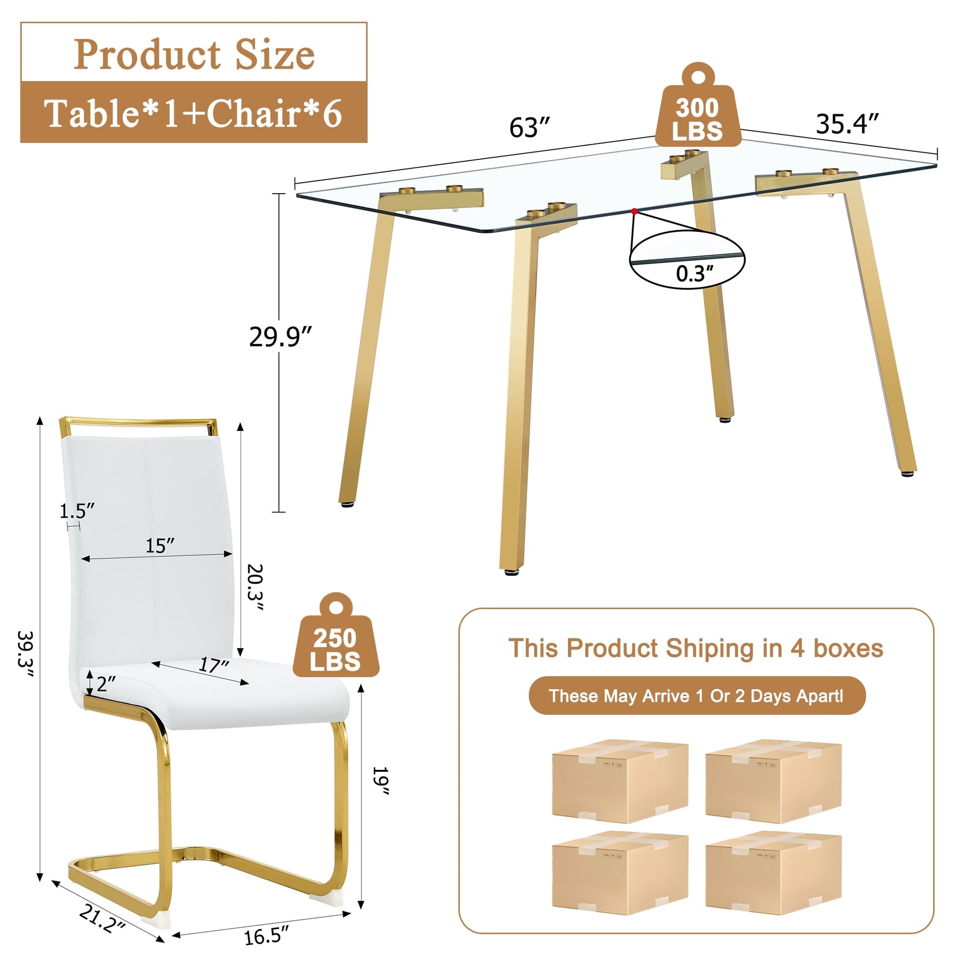 63" Large Glass Dining Table Set for 6, Sudica Gold Legs Kitchen Table with Faux Leather Dining Chairs,White