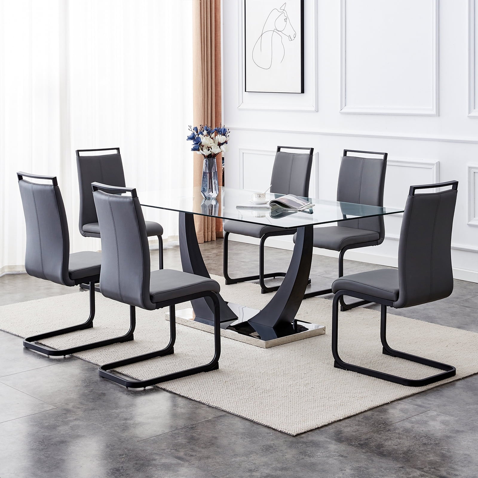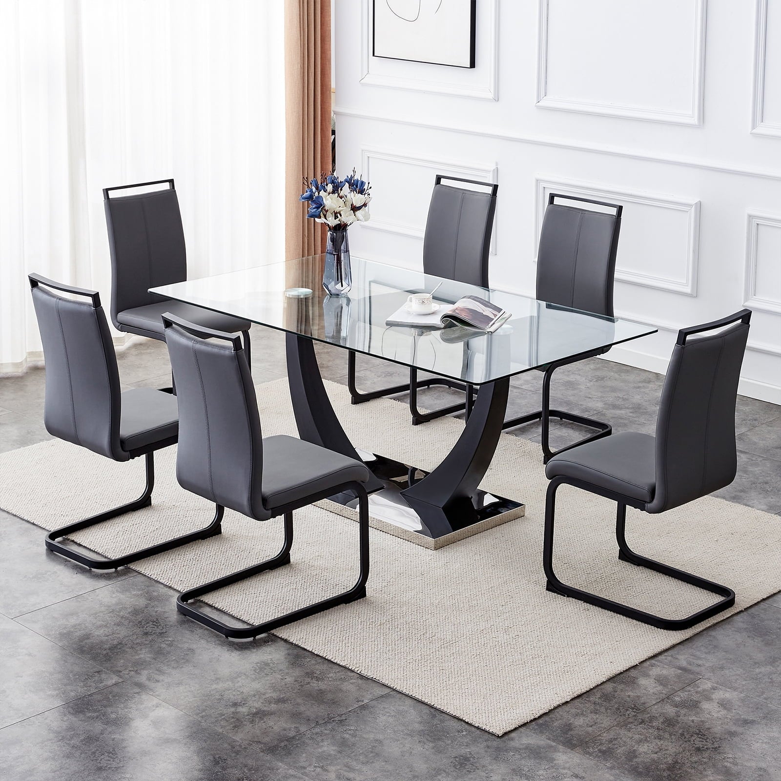 7-Piece 67"Glass Dining Table Set, Sudica Modern Table & Chair Set with 6 PU Leather Padded Dining Chairs, Gray