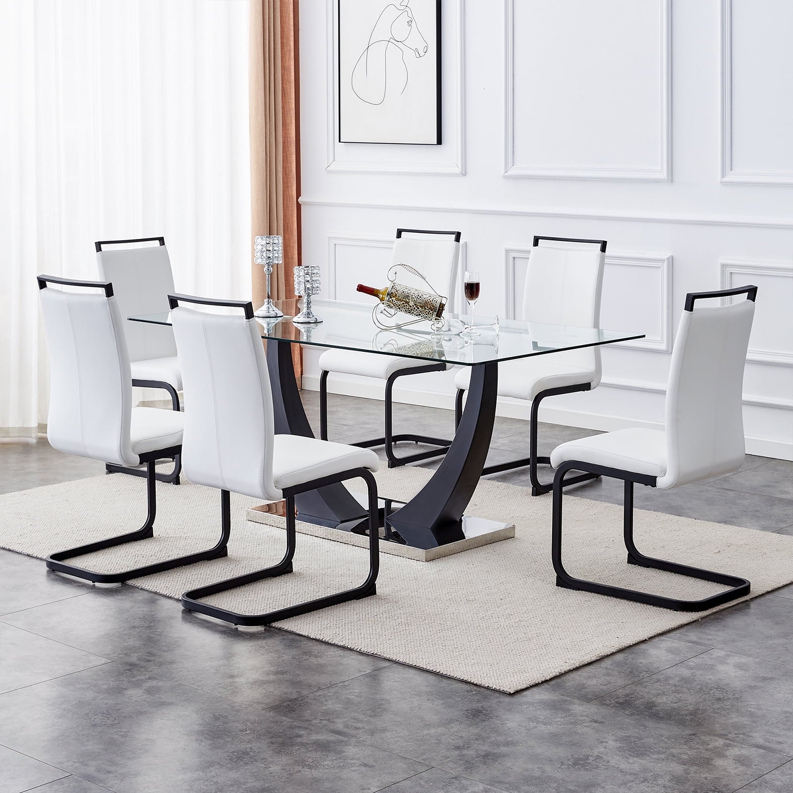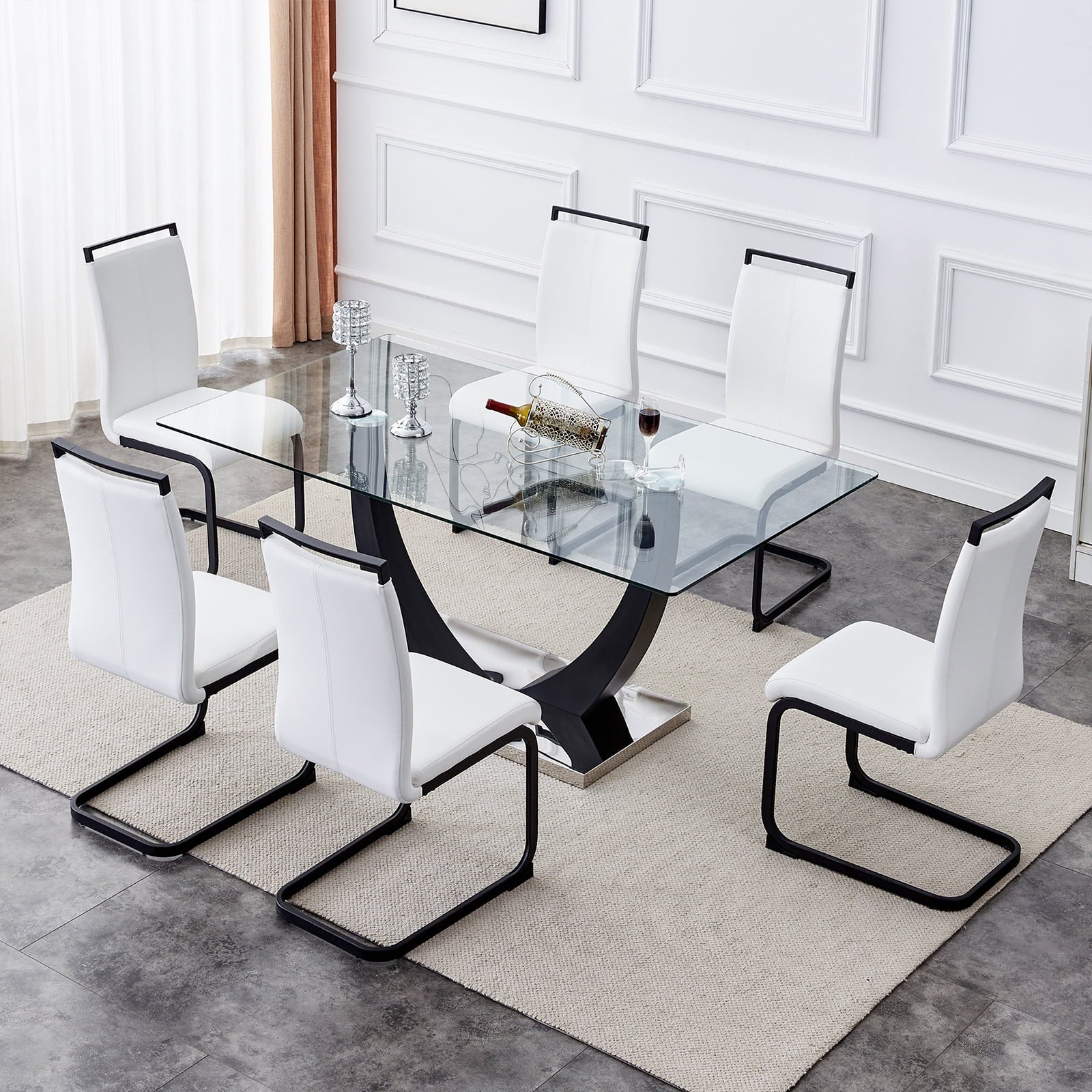 - ¡¾Versatile 7-Piece Dining Set¡¿: This modern 67" glass dining table comes with 6 PU leather dining chairs, making it ideal for any interior - big houses or small apartments. The set comfortably accommodates 6-8 people and the chairs are crafted with durable PU leather seats and silver metal frames for long-lasting use. ¡¾Rectangular Tempered Glass Dining Table¡¿: This modern dining table features a high-quality, heat-resistant, and scratch-resistant, clear glass tabletop. The 0.39-inch thickness of the table top ensures durability and long-lasting use. The stylish U-shaped black metal legs provide excellent stability and support for the dining table. ¡¾Set of 6 High Back Dining Chairs¡¿: Ergonomically designed with a comfortable and elegant high backrest. Waterproof PU leather upholstery for easy cleaning. Soft sponge filling for added comfort. Sturdy metal frame ensures stability. ¡¾Versatile Table Set¡¿: This 67-inch rectangular dining table is perfect for any room in your home. It serves as a dinner table and doubles as a workspace or gaming area for friends and family. Suitable for houses or apartments, it offers endless possibilities. ¡¾Easy Assembly¡¿: Our versatile table set comes with all parts and tools required for setup, conveniently labeled for hassle-free assembly. Simply follow the step-by-step instructions, and you'll have your table ready in no time. To ensure safe shipment, the large size of the product necessitates separate packaging, resulting in 5 parcels that will be delivered to you.