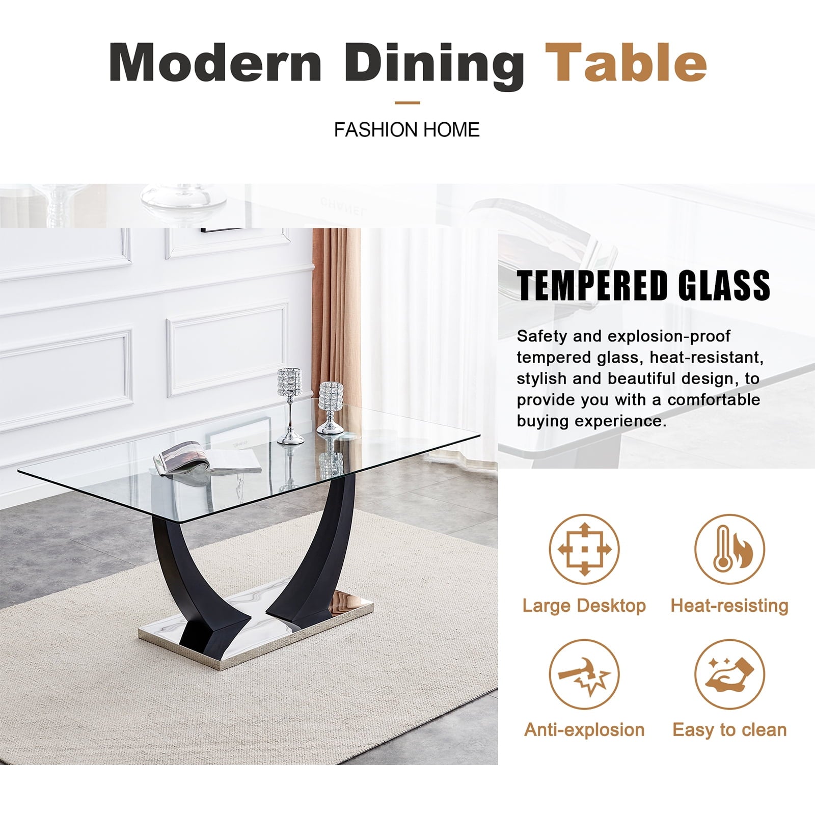- ¡¾Rectangular Tempered Glass Dining Table¡¿: This modern dining table features a high-quality, heat-resistant, and scratch-resistant, clear glass tabletop. The 0.39-inch thickness of the table top ensures durability and long-lasting use. The stylish U-shaped black metal legs provide excellent stability and support for the dining table.