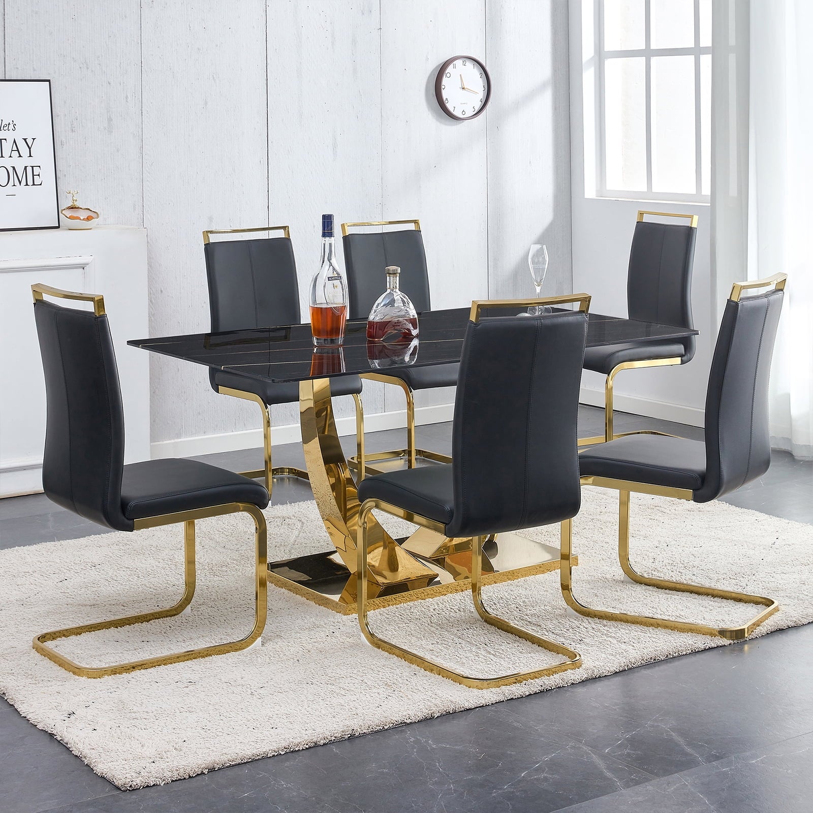 7-Piece Dining Table Set, Sudica Rectangular Faux Marble Kitchen Table with 6 Leather Gold Legs Dining Chairs, Black