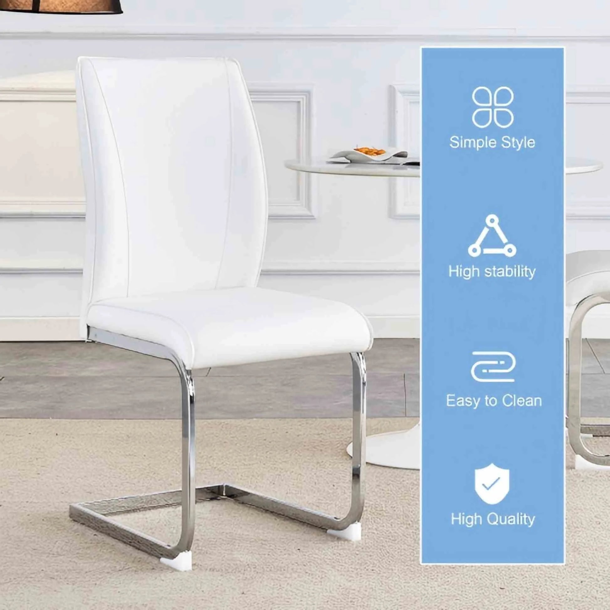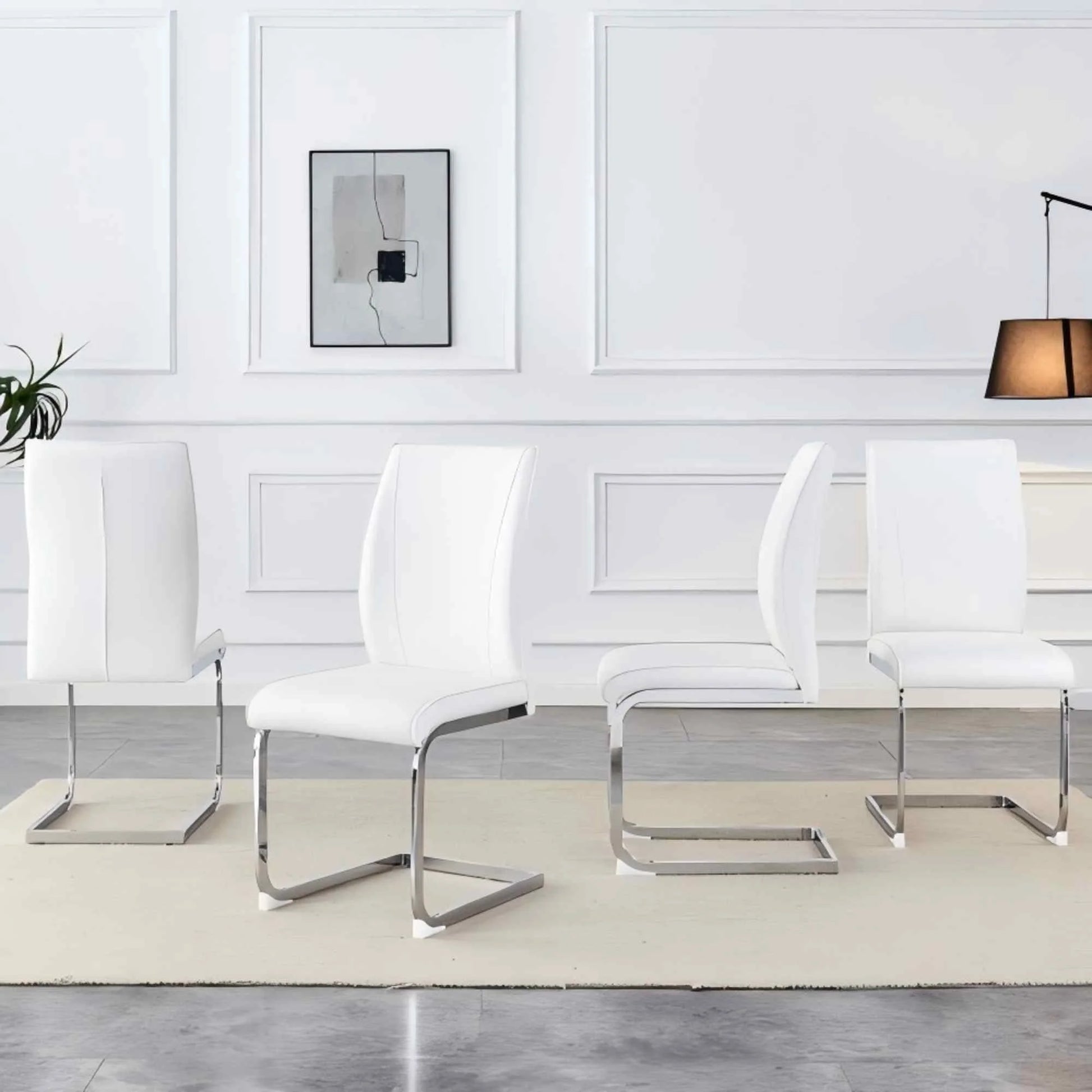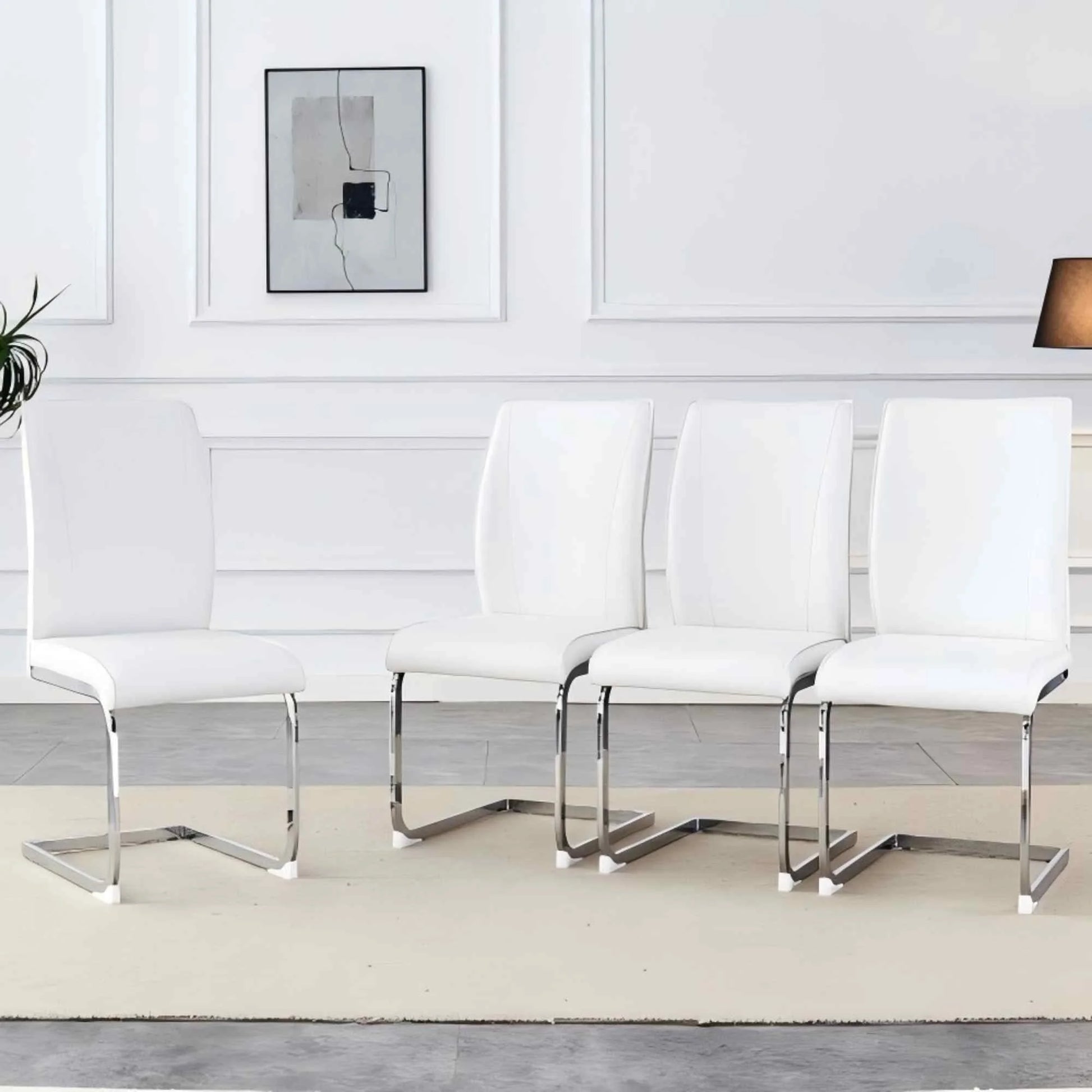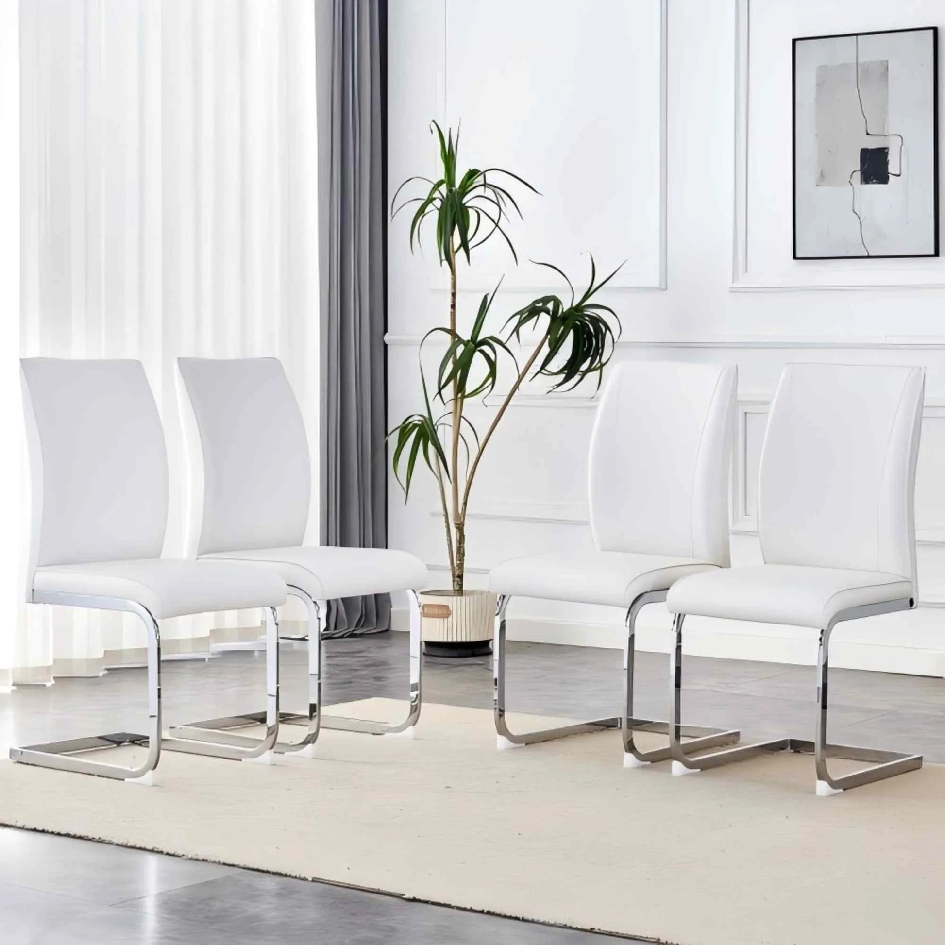 Upgrade your dining space with the SUDICA PU Upholstered Dining Chairs Set of 4. Featuring a modern armless design, each chair is constructed with a durable metal frame and soft, breathable PU material for both backrest and seat. The high-back design provides ergonomic support, while sponge filling offers enhanced comfort for long periods of sitting. Measuring 17.3 inches deep, 21.6 inches wide, and 39 inches high, these chairs fit a variety of table styles and are perfect for dining rooms, kitchens, or living rooms. The white finish blends seamlessly with most décor, and the scratch-resistant plastic feet help protect your floors. With a weight capacity up to 300 lbs and simple assembly in under 20 minutes, these chairs combine durability, comfort, and contemporary style for your home.