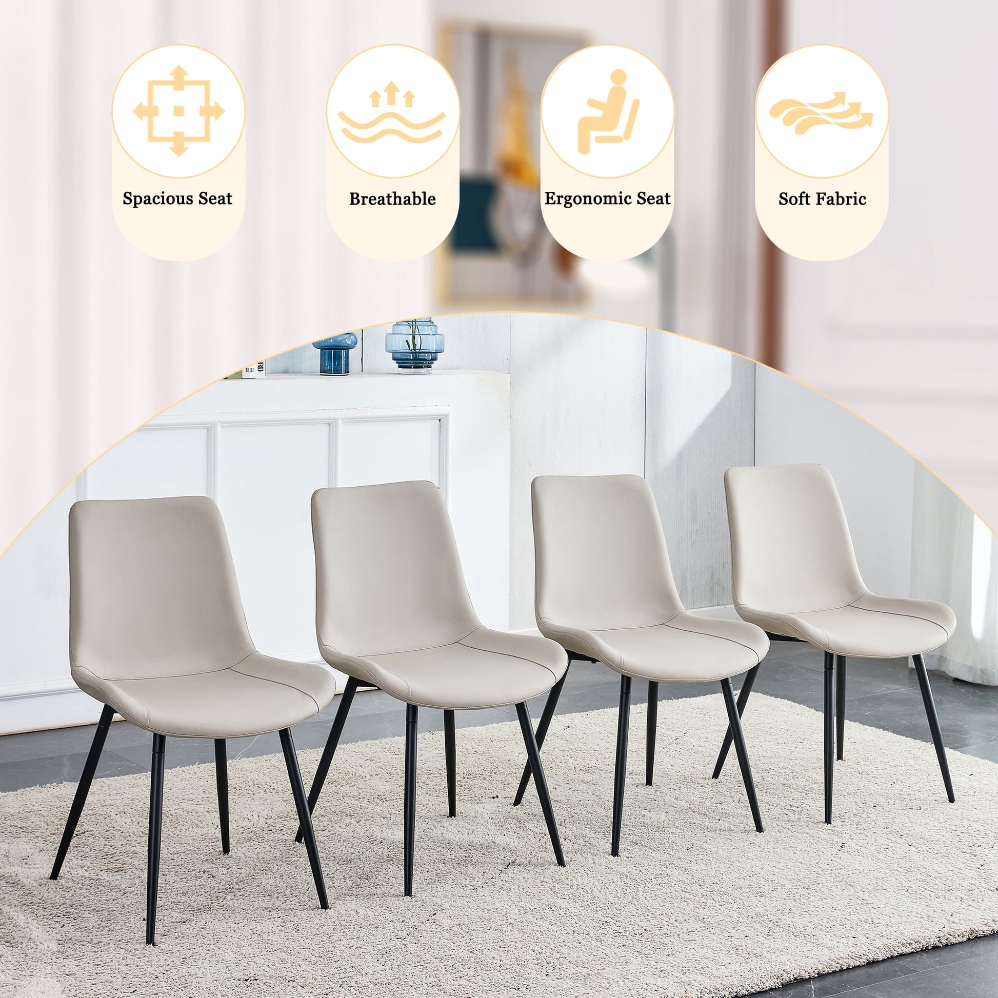 Crafted with care, these dining chairs feature seats made of breathable faux leather that is both cozy and classy. The black metal legs add a modern flair to the overall design. Cover with faux leatherm our kitchen are easy to maintance and stylish. The tall and thick foam backrest offers superior support for your back, ensuring maximum comfort. The upholstered cushion and wide seat guarantees a soft and comfortable seating experience. Finished in timeless design, these dining room chairs effortlessly blend with various decorating styles, making them a perfect fit for any living room, kitchen, or dining area.