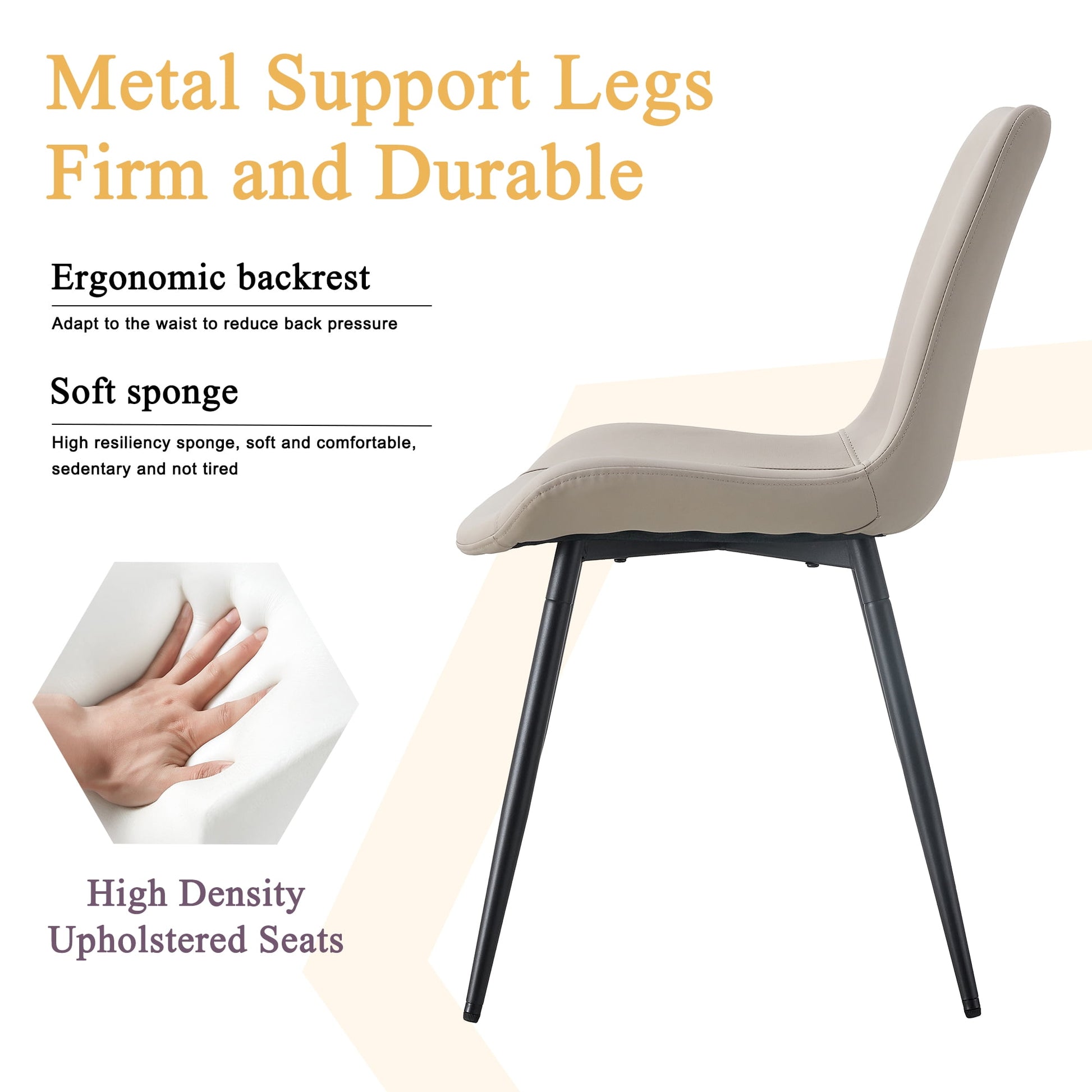 - ¡¾Ergonomic Back Design¡¿Enjoy the perfect combination of elegance and modernity with our dining chair. Featuring a soft faux leather cushion seat and back, this chair offers both comfort and style. The backrest is thoughtfully designed based on ergonomic standards and the natural contours of the human body, ensuring a comfortable and elegant seating experience.