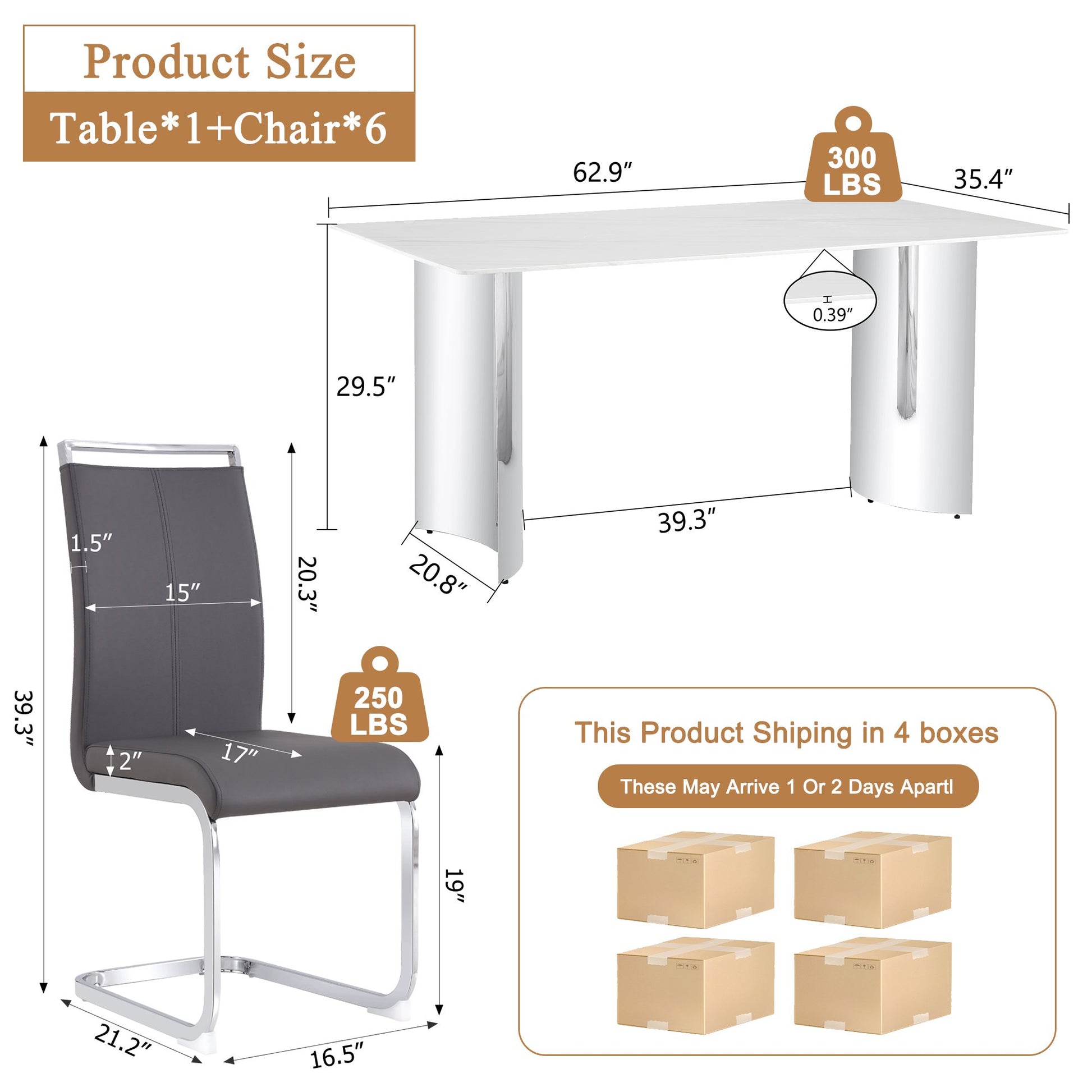 Dining Table Set for 6£¬Sudica 63" Faux Marble White Rectangular Dining Table and Upholstered PU Leather Dining Room Chairs for Kitchen,Gray