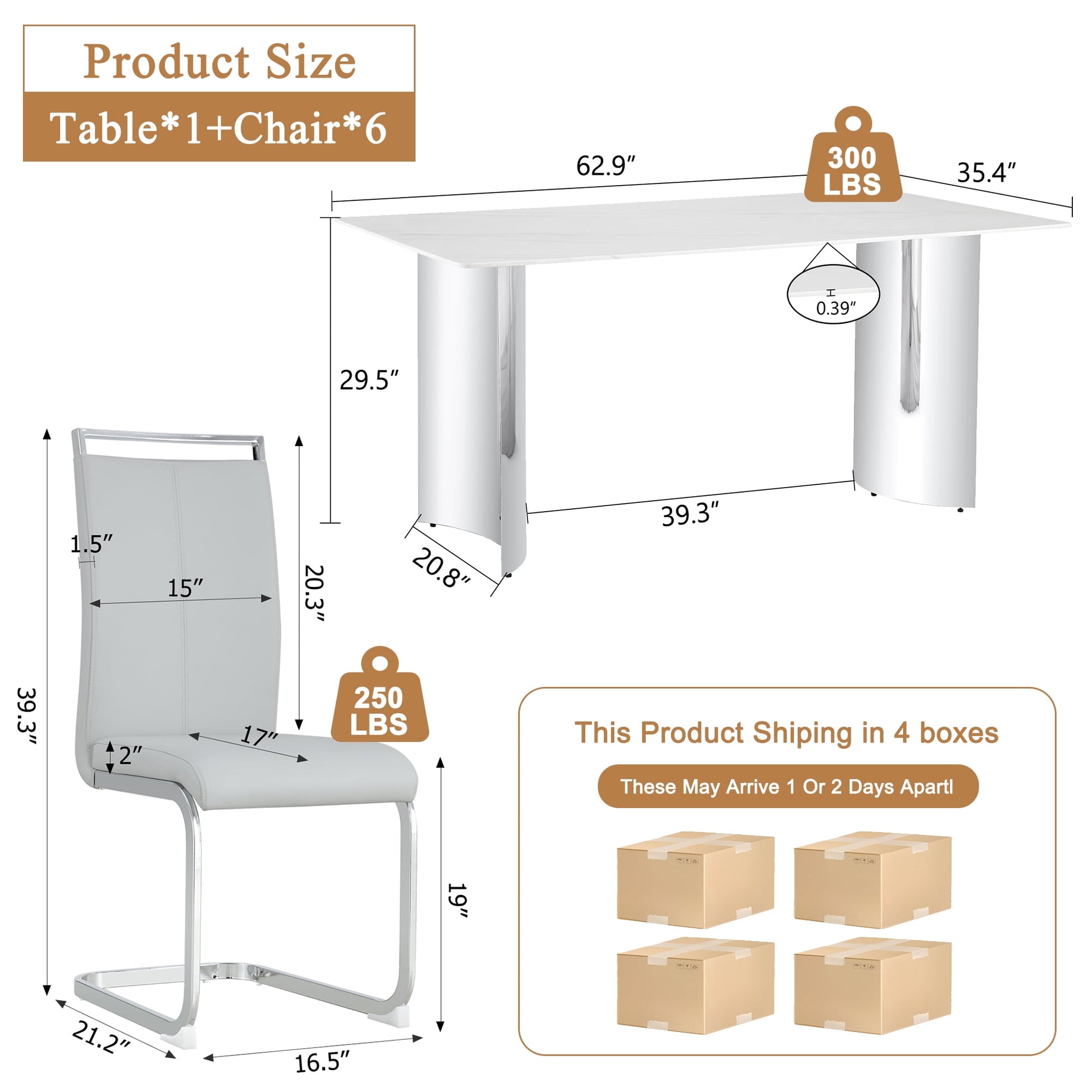 Dining Table Set for 6£¬Sudica 63" Faux Marble White Rectangular Dining Table and Upholstered PU Leather Dining Room Chairs for Kitchen,Light Gray