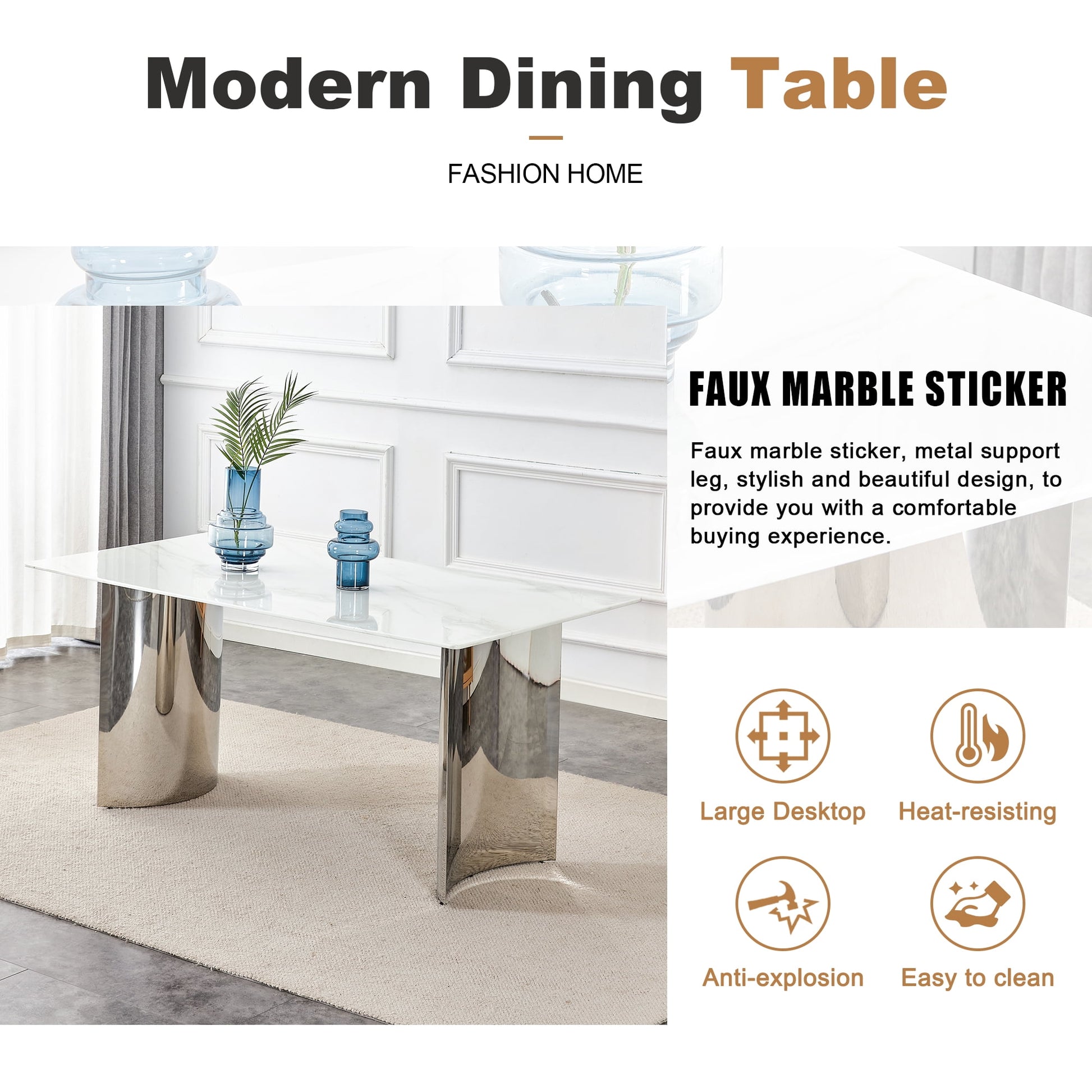 A large faux marble dining table paired with PU leather dining chairs is a perfect choice for stylish and practical dining spaces. The white marble grain dinner table adds a modern and spacious feel to any room, while the soft kitchen chairs provide comfort and elegance. The combination of the two creates a visually stunning contrast. The dining table set is versatile and suits various interior styles, from modern to traditional. With easy-to-clean leather upholstery and a compact size, this dining room set is ideal for small spaces. Don't compromise on style or functionality when you can have both with this beautiful and practical dining set.