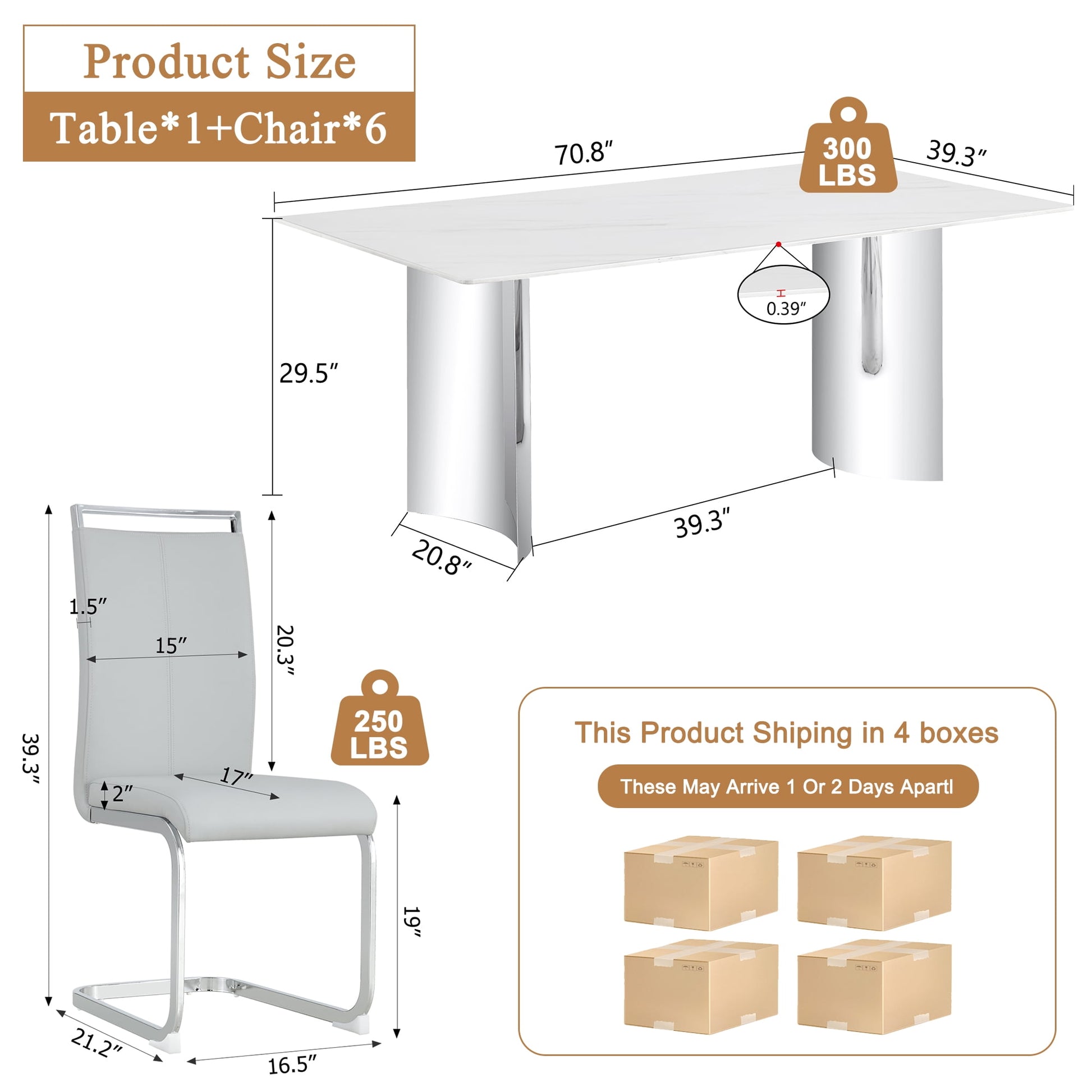 - ¡¾Elegant and Versatile Dining Experience¡¿Our 7-piece kitchen dining table set, consisting of 1 table and 6 chairs. The spacious dining table comfortably accommodates 4-6 people, promoting enjoyable gatherings and cherished moments with your loved ones. Inspired by modern aesthetics, this exquisite dining set features a stylish white marble grain with golden chromo legs, exuding a sense of luxury and sophistication.