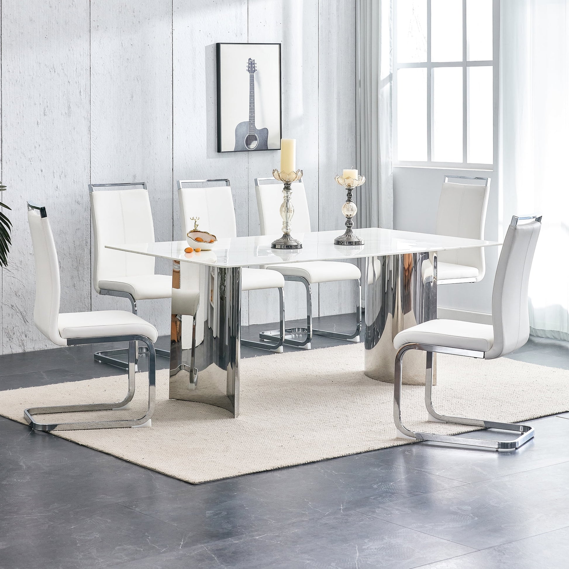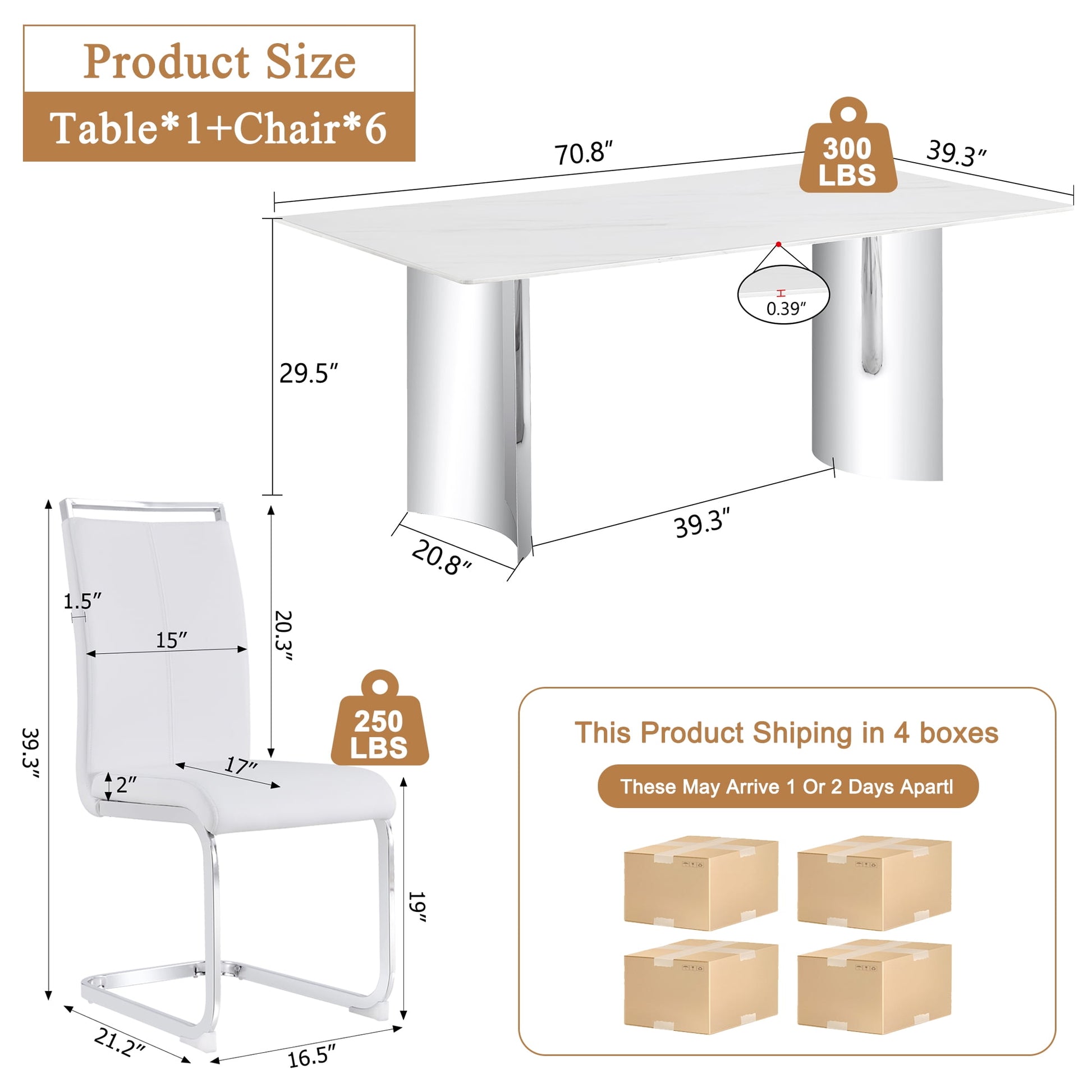 - ¡¾Elegant and Versatile Dining Experience¡¿Our 7-piece kitchen dining table set, consisting of 1 table and 6 chairs. The spacious dining table comfortably accommodates 4-6 people, promoting enjoyable gatherings and cherished moments with your loved ones. Inspired by modern aesthetics, this exquisite dining set features a stylish white marble grain with golden chromo legs, exuding a sense of luxury and sophistication.