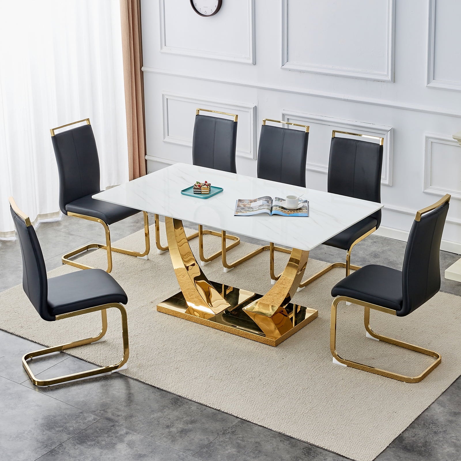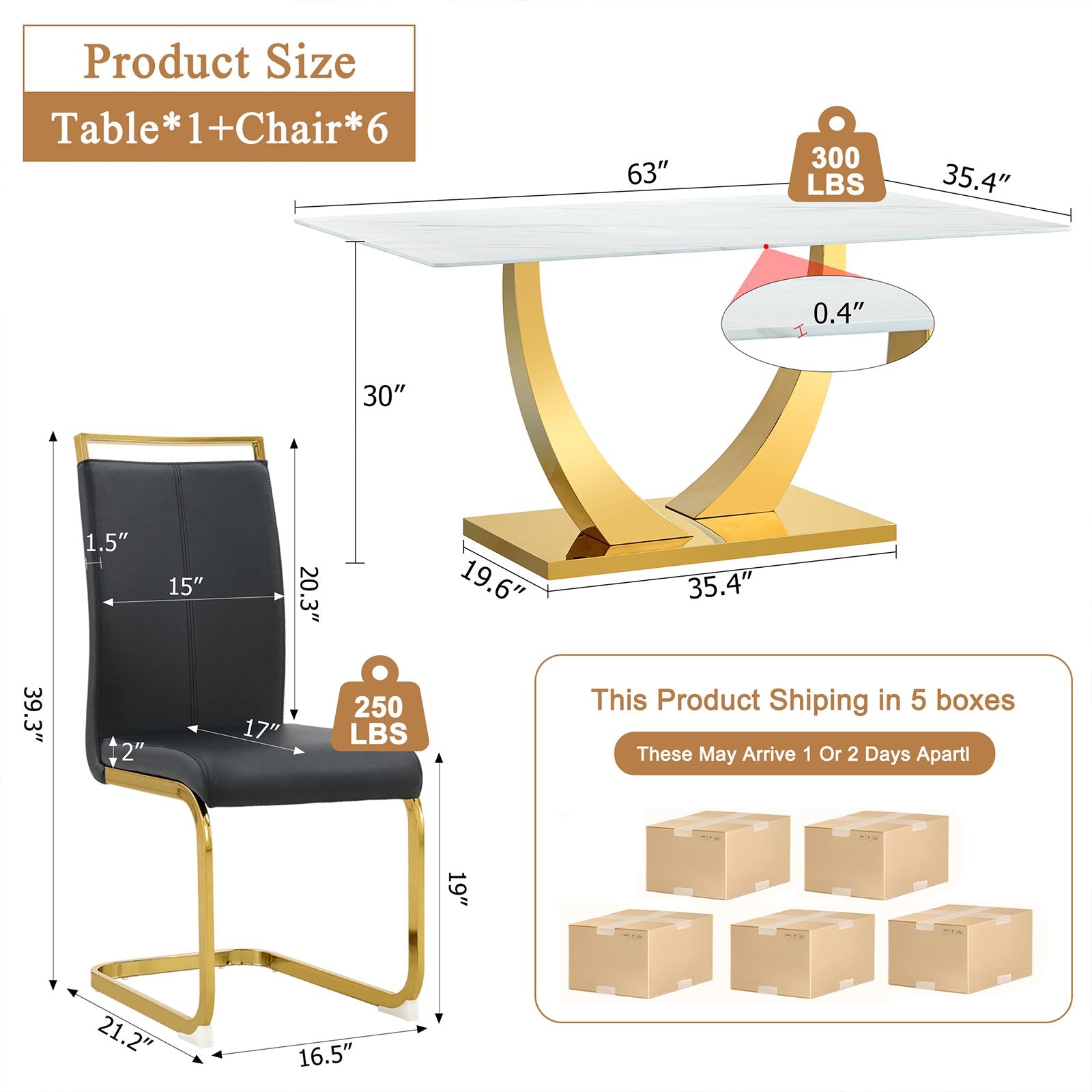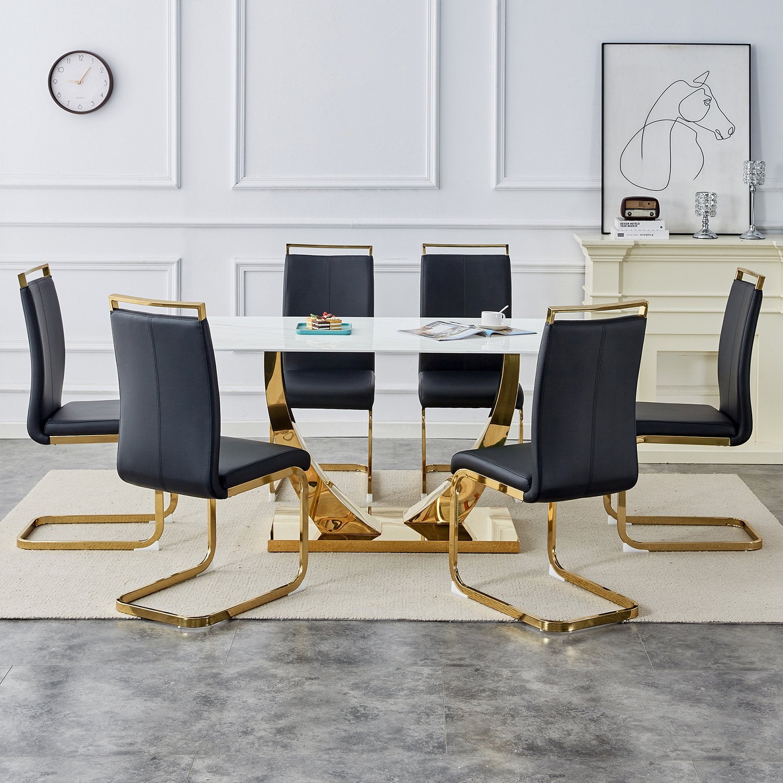 Dining Table Set for 6, Sudica Rectangular Faux Marble Kitchen Table with 4 Leather Gold Legs Dining Chairs,Black