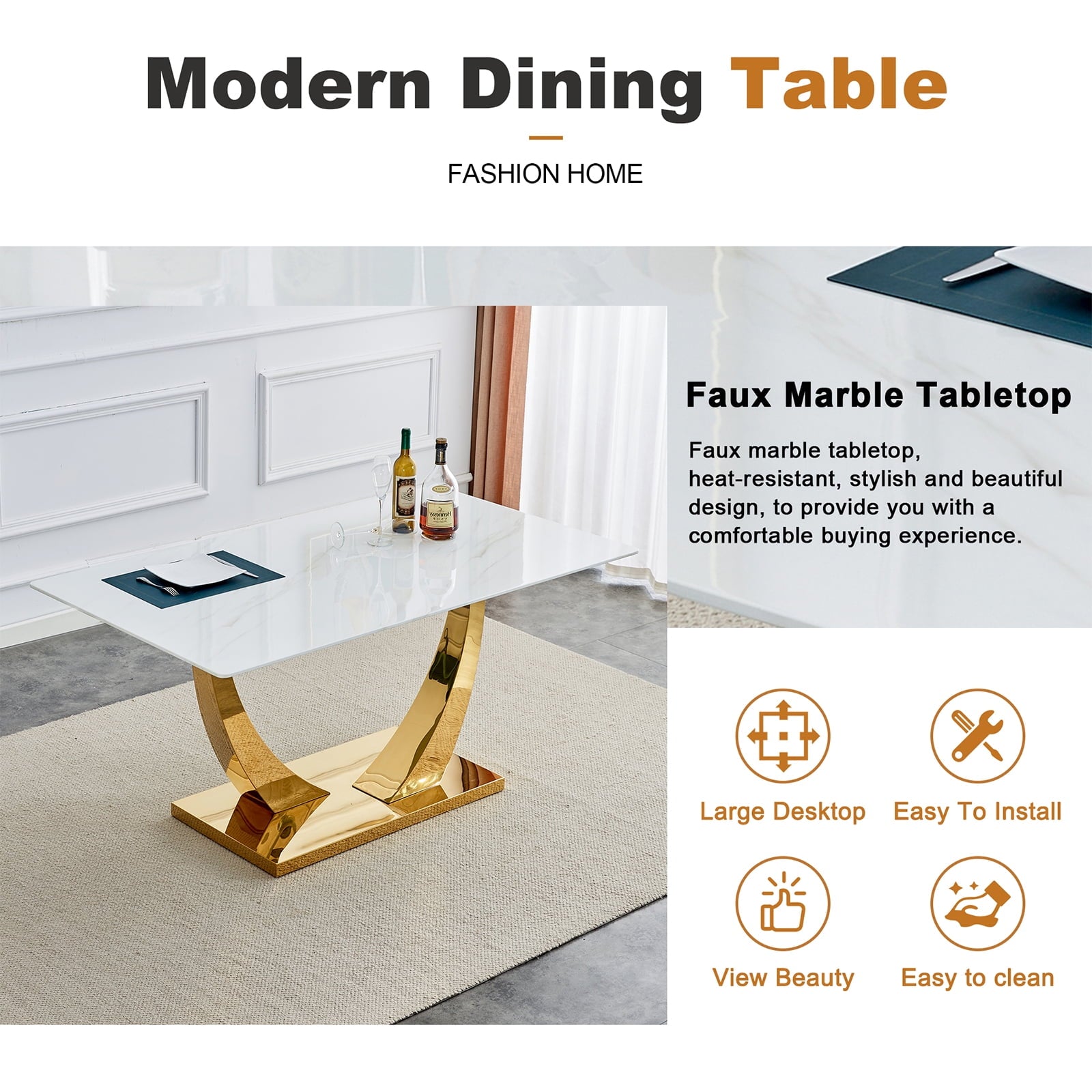 - ¡¾63" White Faux Marble Kitchen Table for 4-6¡¿This generously sized dining table features a large faux marble tabletop, adding a visual boost to any dining space. Its simple yet elegant design makes it a perfect choice for a variety of settings. The white gold table allows for convenient use, whether for studying, working, or enjoying meals. The smooth, thickened faux marble top provides sturdy support and helps prevent accidental scratches.