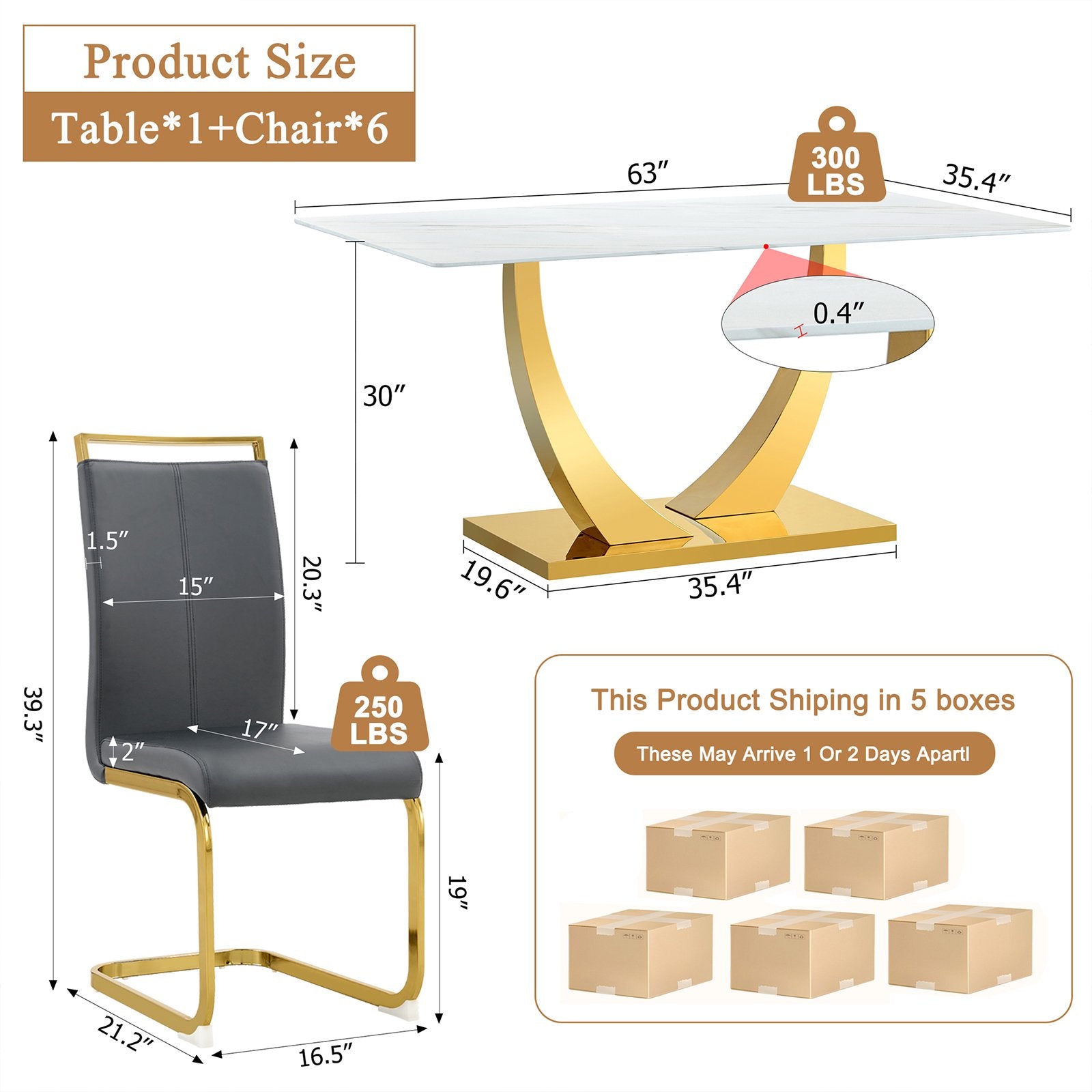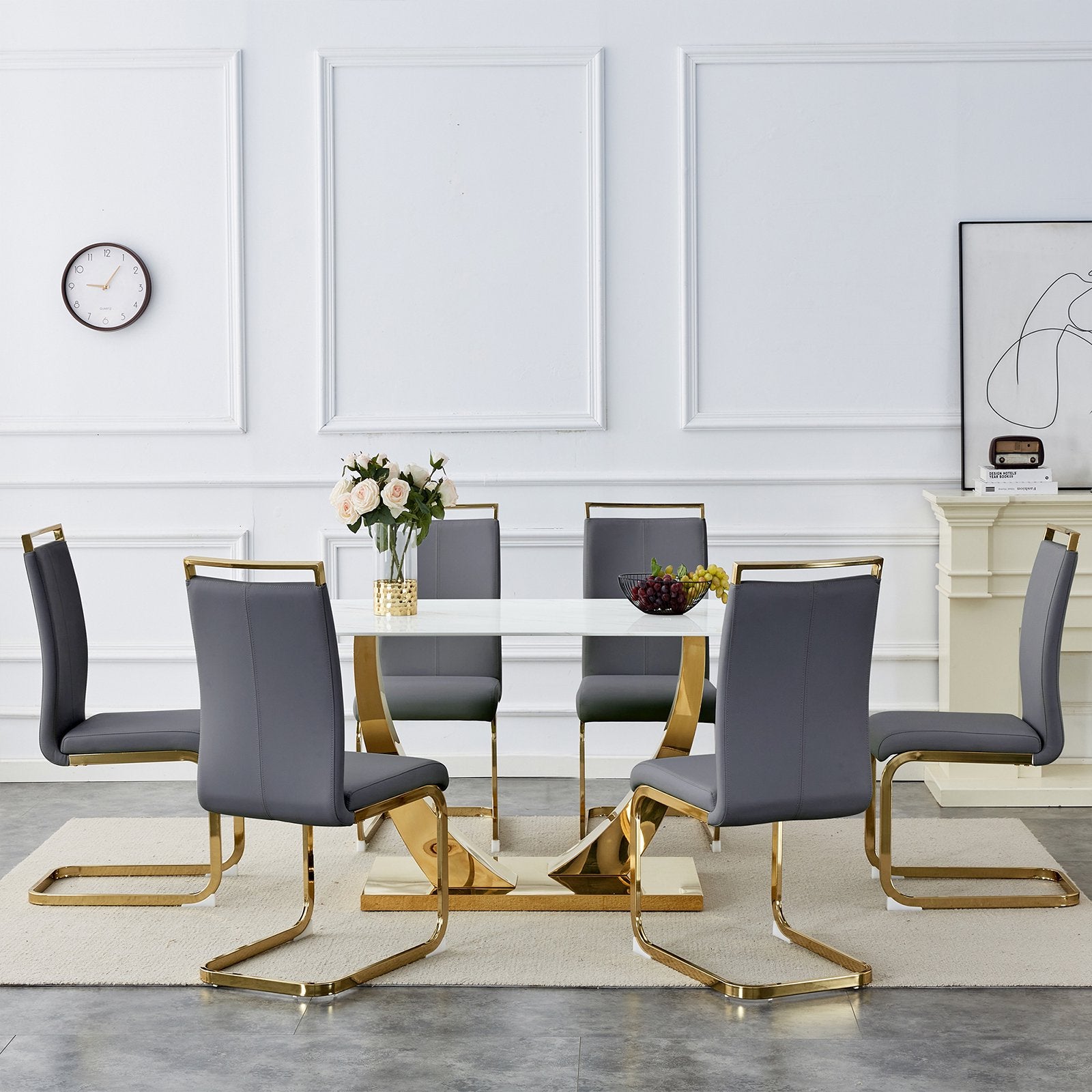 Dining Table Set for 6, Sudica Rectangular Faux Marble Kitchen Table with 4 Leather Gold Legs Dining Chairs,Dark Gray