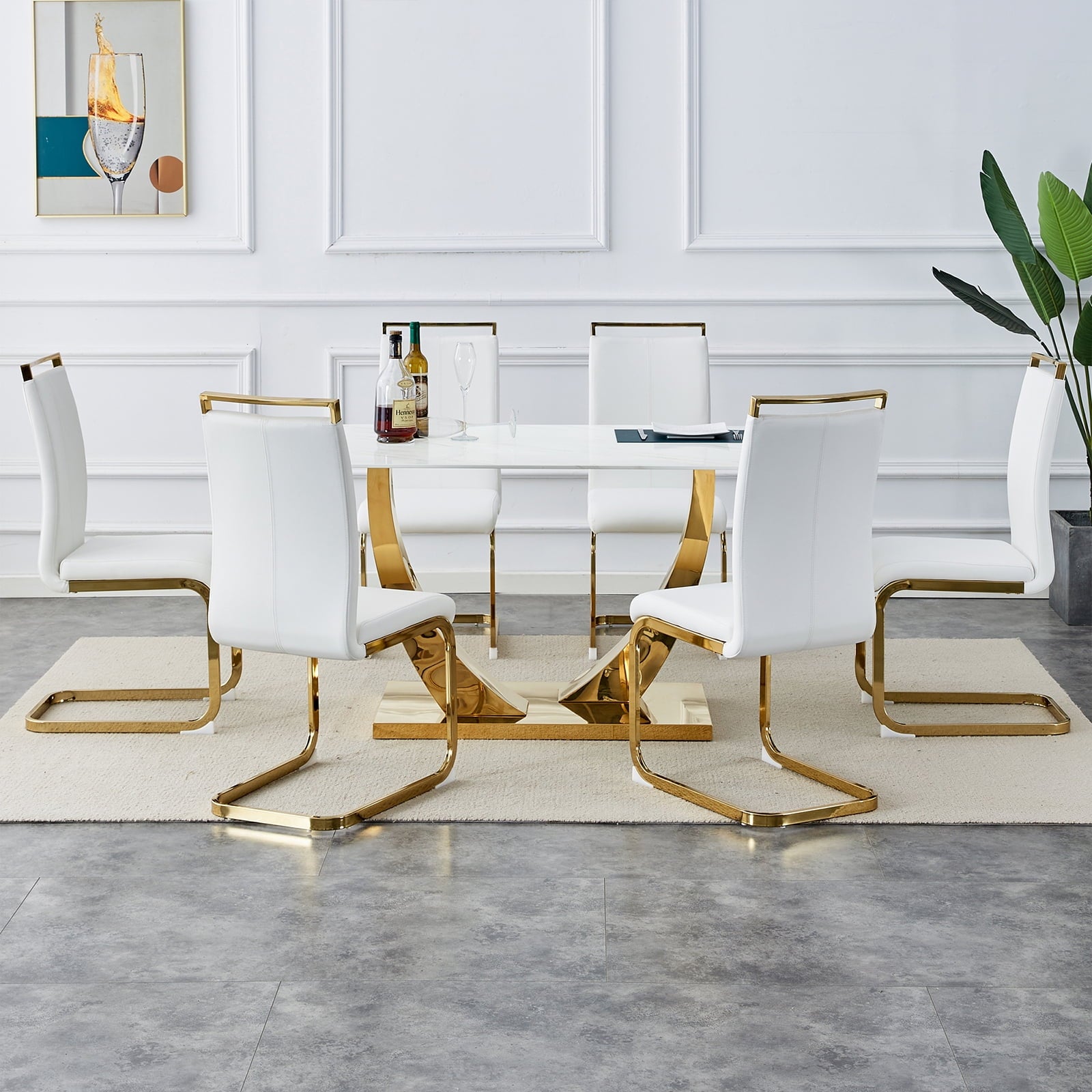 Dining Table Set for 6, Sudica Rectangular Faux Marble Kitchen Table with 4 Leather Gold Legs Dining Chairs,White