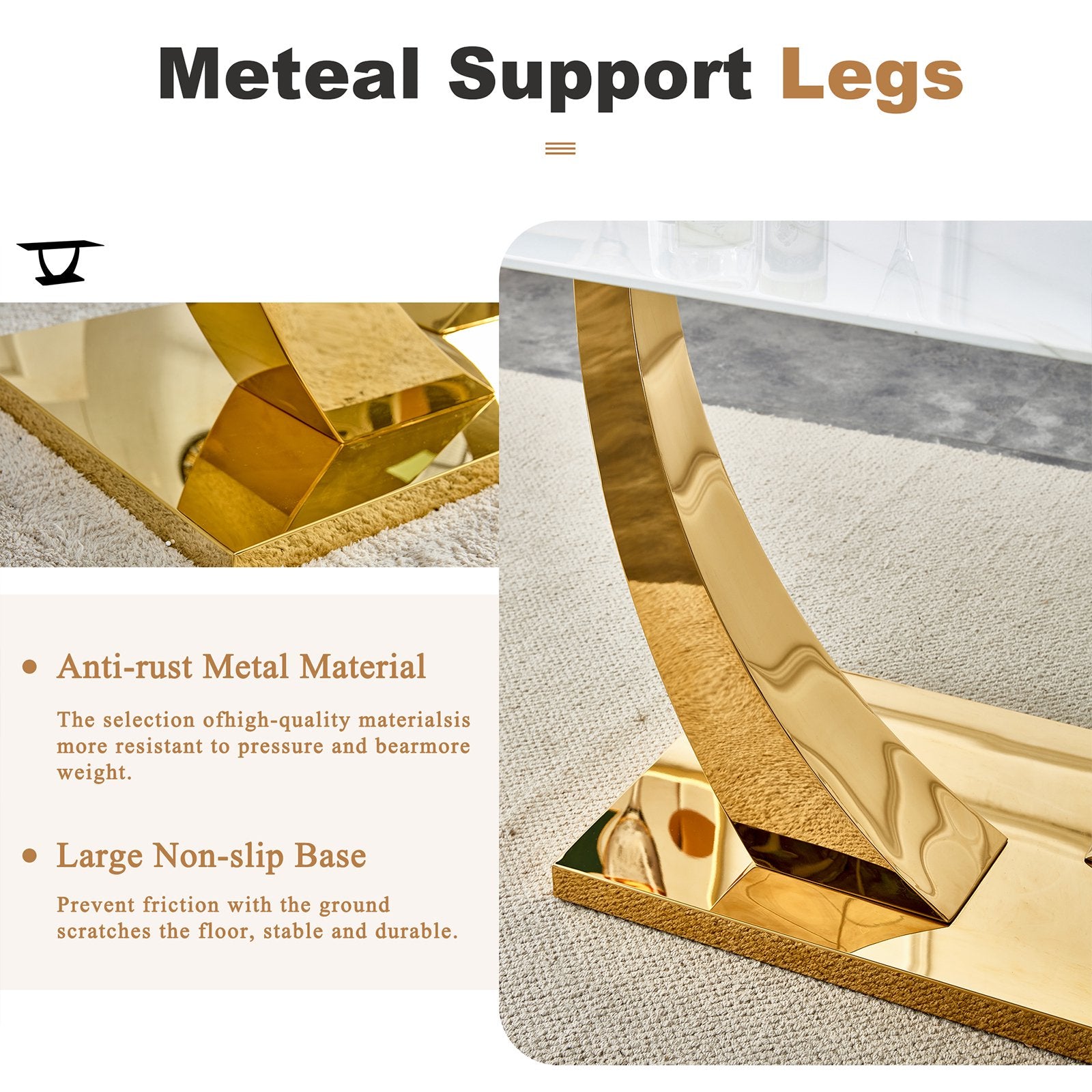 - ¡¾Gold Polished Pedestal Base Dining Table¡¿In contrast to standard iron legs on the market, the legs and frame of our table are polished to a mirror-like finish. This unique treatment imbues the dining table set with a brilliant and captivating presence in any room.