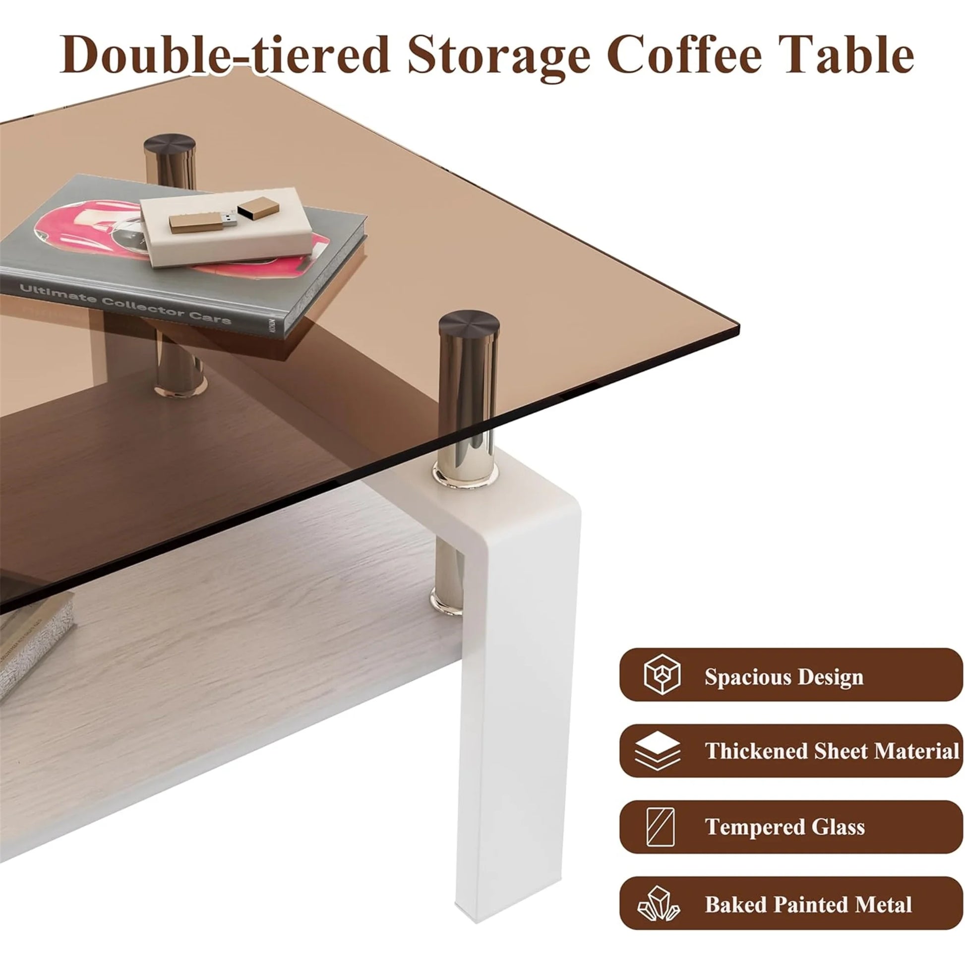Glass Coffee Table Rectangle Living Room Center Table with Storage, Clear Tempered Glass Tabletop and Smoke Grey Leg,for Living Room and Office (Clear Smoke),Brown white