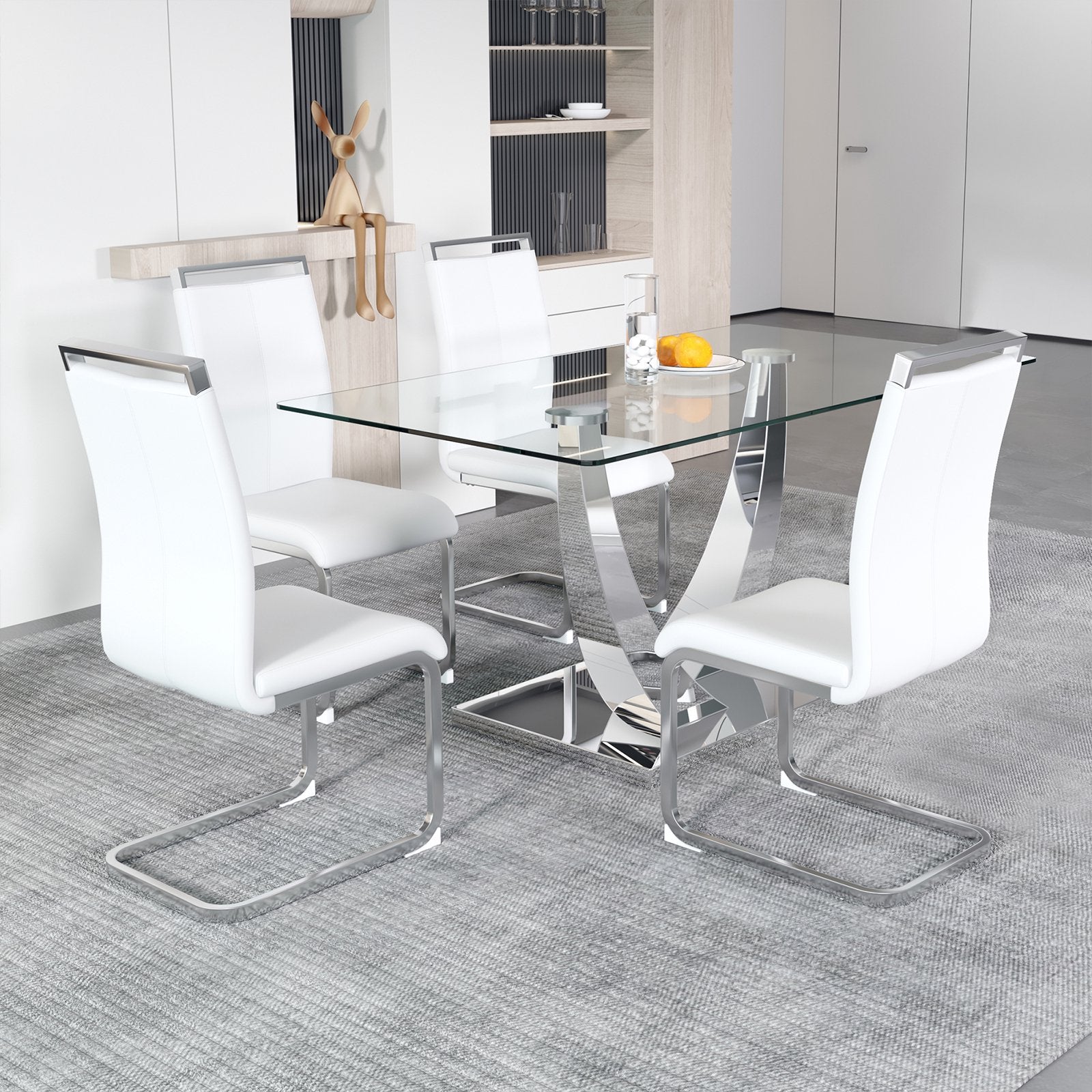 Glass Dining Room Table Set for 4, Sudica 63"Modern Kitchen Glass Dinner Table Set with 4 Upholstered Dining Chairs, White