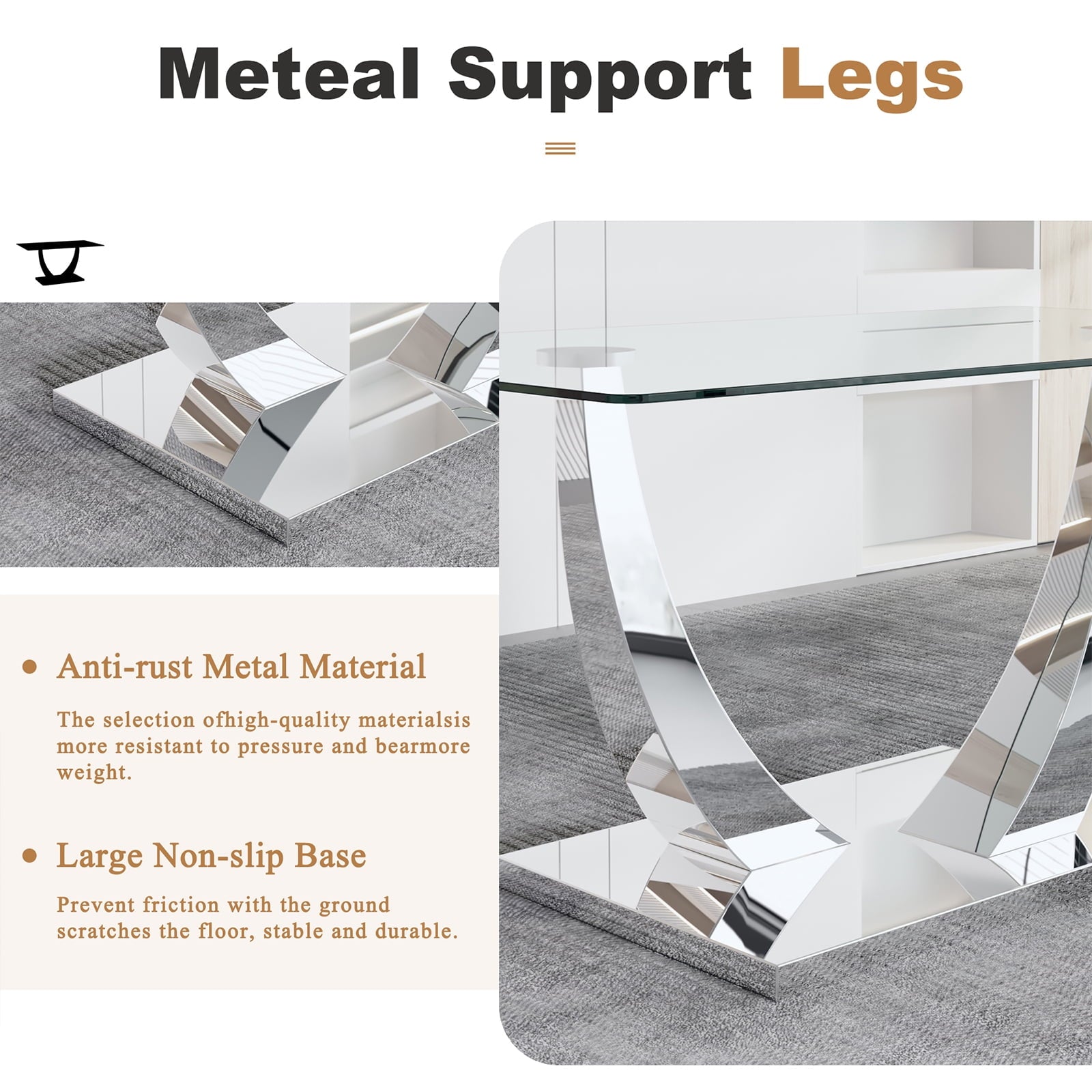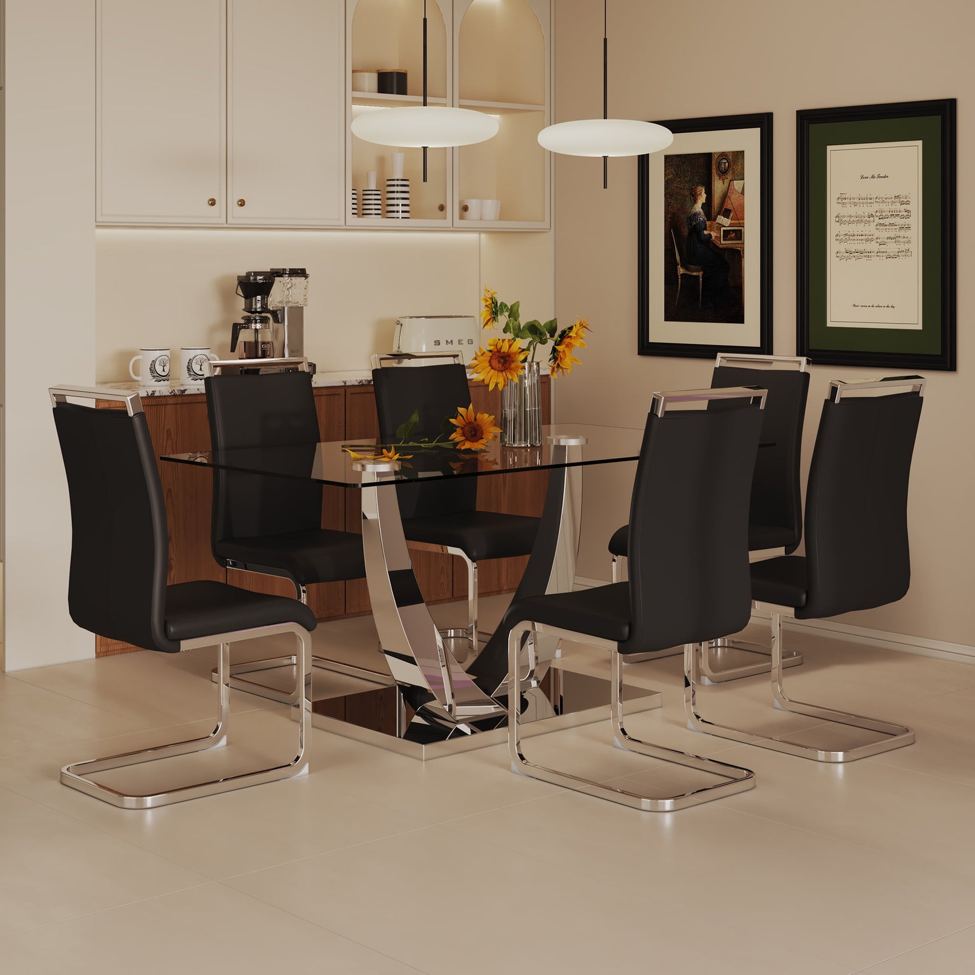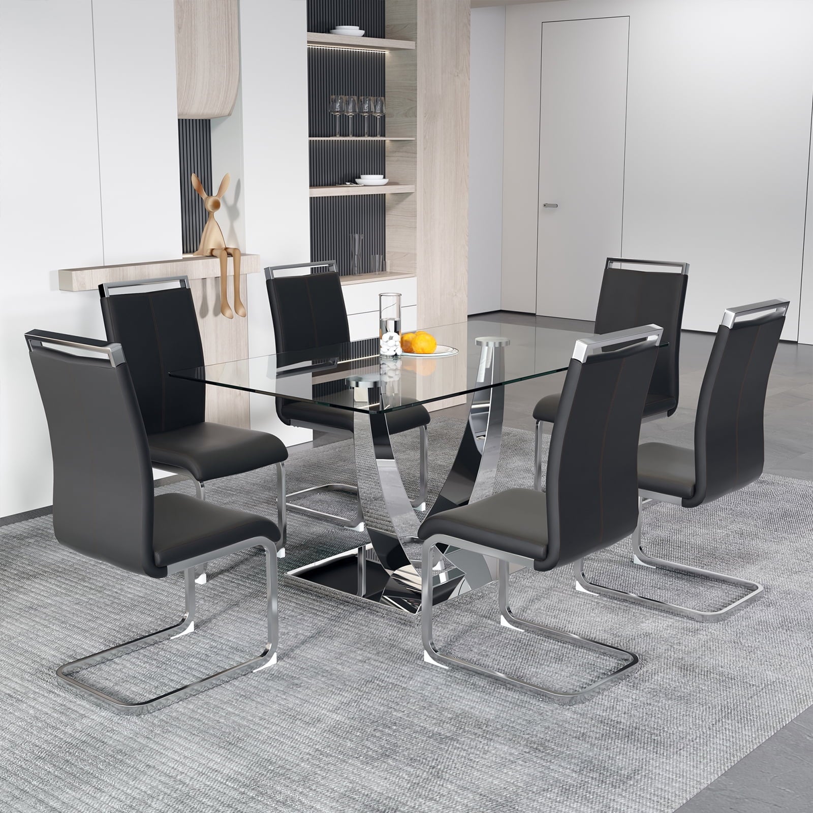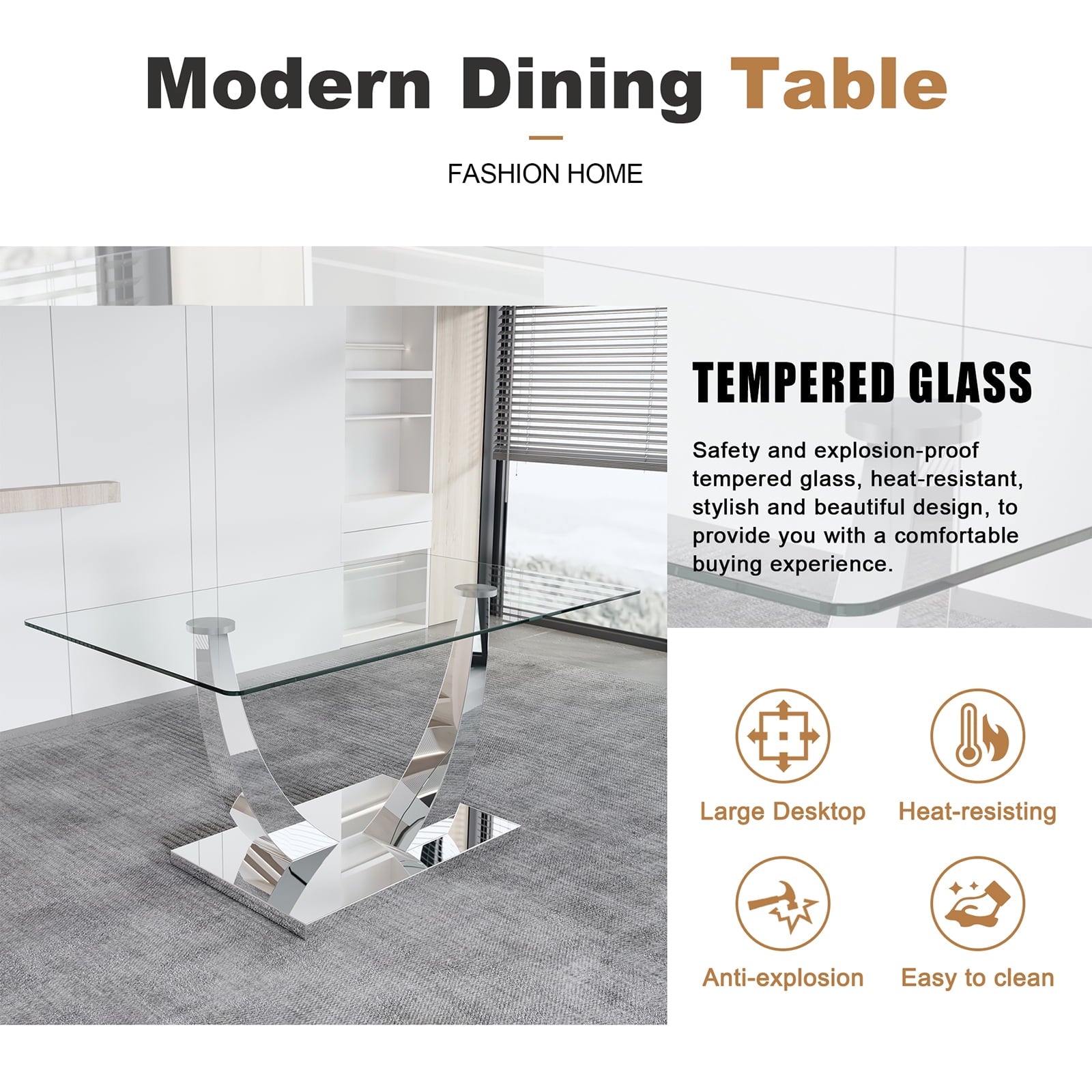- ¡¾Modern Dining Table Set¡¿ This contemporary kitchen dining table set includes 4/6 dining chairs and a glass dining table. It features mirrored stainless steel brackets with a unique U shape, making it rust-resistant and durable. The table is made with durable tempered glass for long-lasting use. It comfortably seats 4-8 people and has smooth edges and rounded corners, ensuring both beauty and safety by reducing accidental collisions with elderly or children.