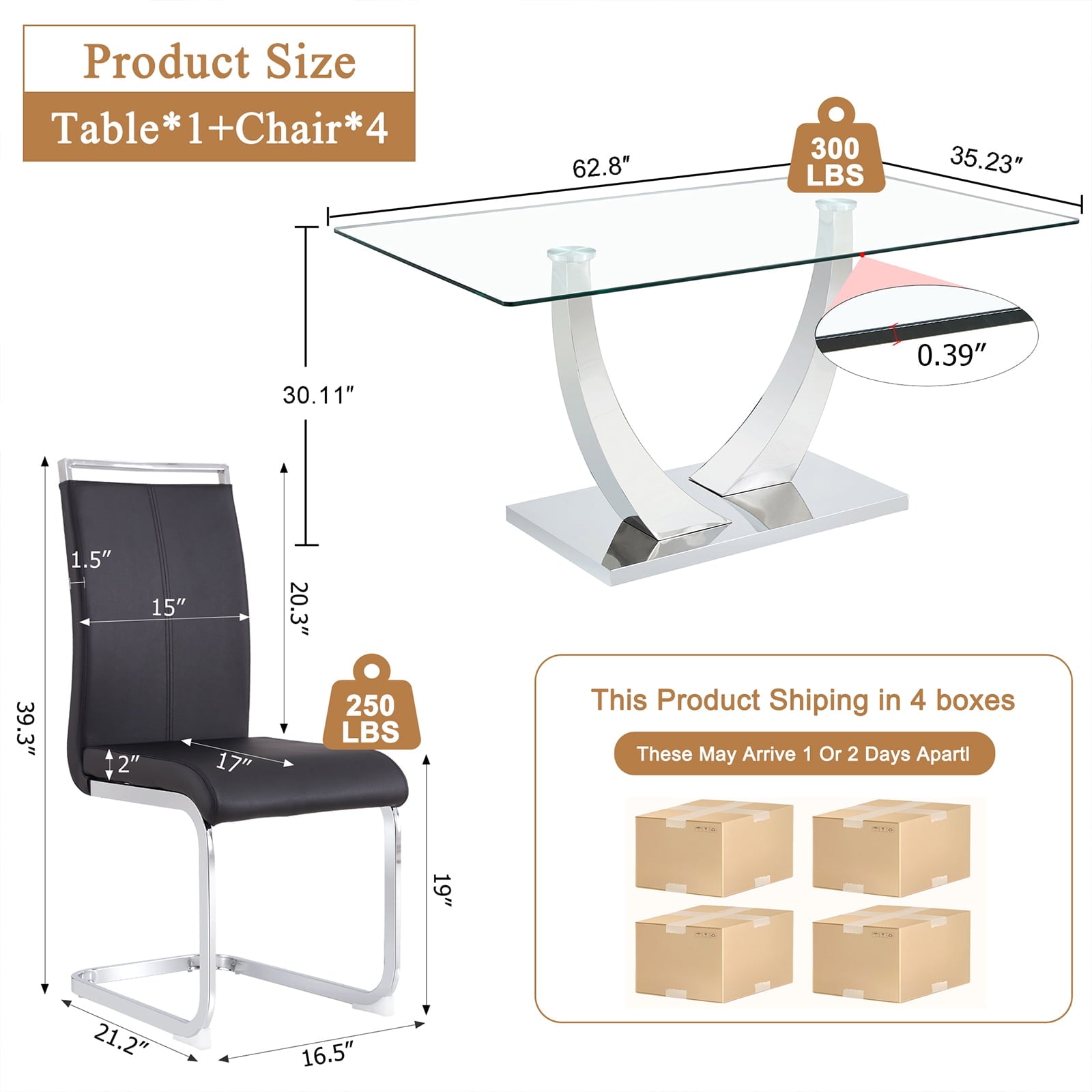 - ¡¾0.39" Thick Durable Tempered Glass Tabletop¡¿ This glass table can bear weight up to 300LBS and is easy to clean. Its glossy smooth surface adds elegance to its simplistic design. The chair is made of premium PU leather, sponge, and sturdy chrome-plated iron legs.