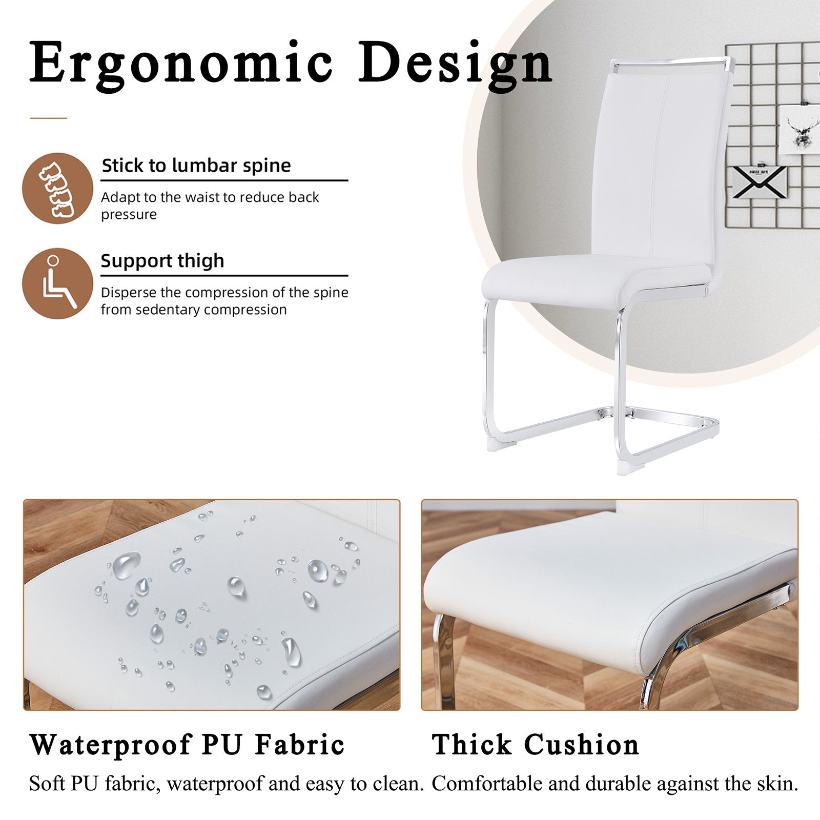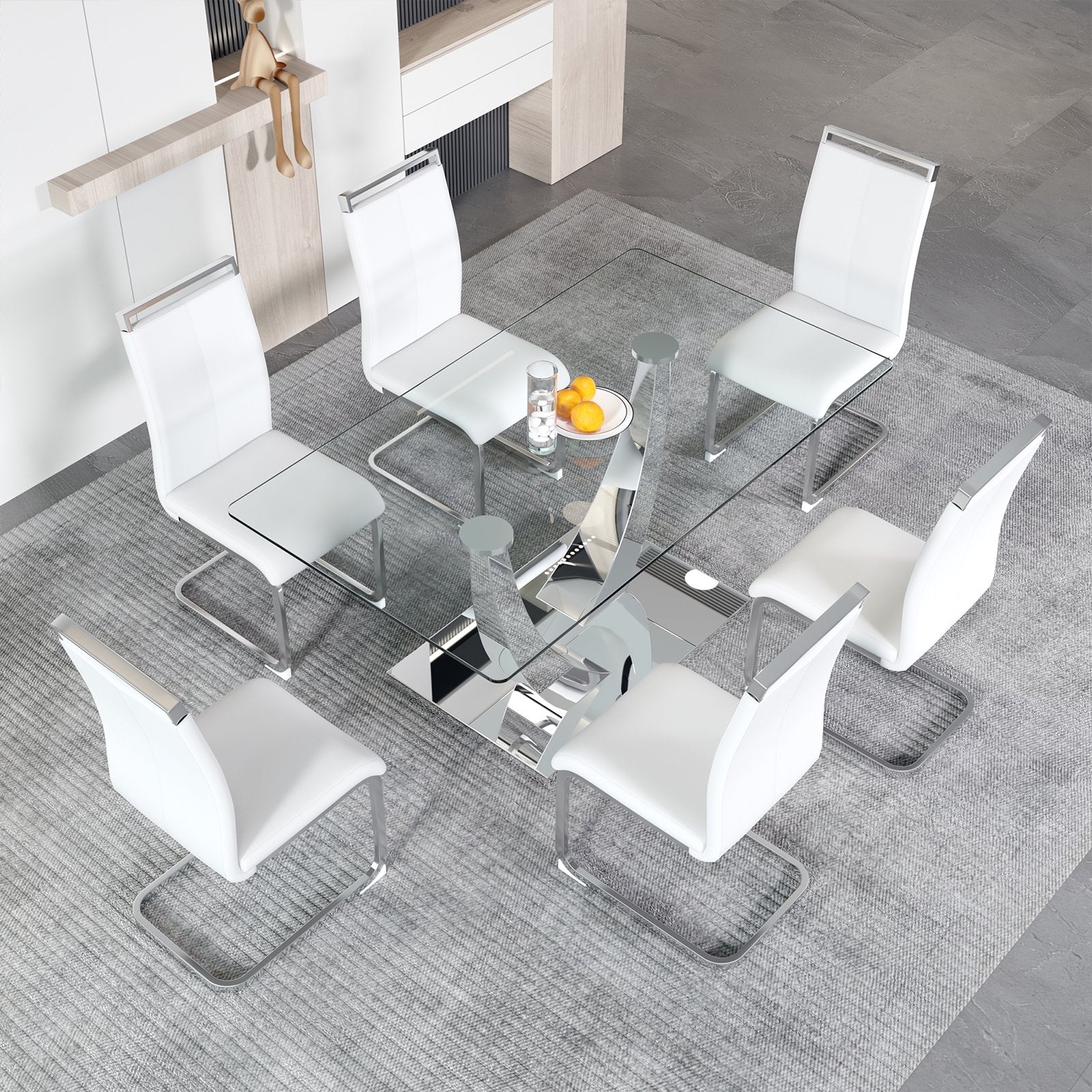 Our glass dining table and chair set combines simplicity and elegance. The table is made of durable tempered glass that resists heat and scratches.The transparent top is sturdy and safe, breaking into harmless pieces if it ever shatters. The chairs feature comfortable seats upholstered in easy-to-clean, waterproof PU leather. With sturdy U shap metal legs, this set offers a stylish and cozy dining experience.