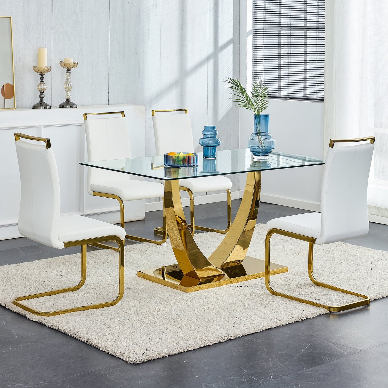 Glass Dining Table Set for 4, Sudica 63"Rectangular Dining Room Table and Leather Dining Chairs Set with Chrome Gold Legs, White