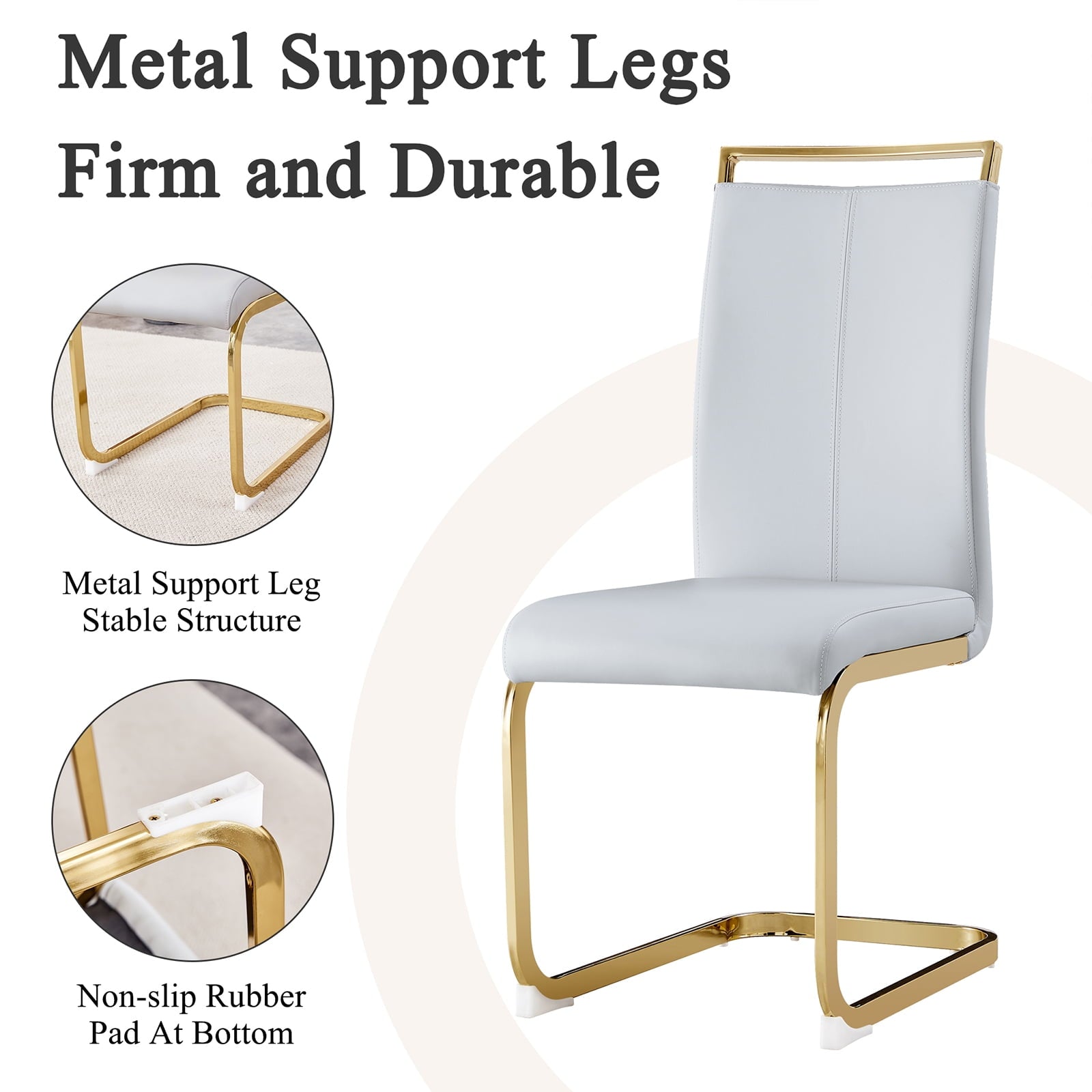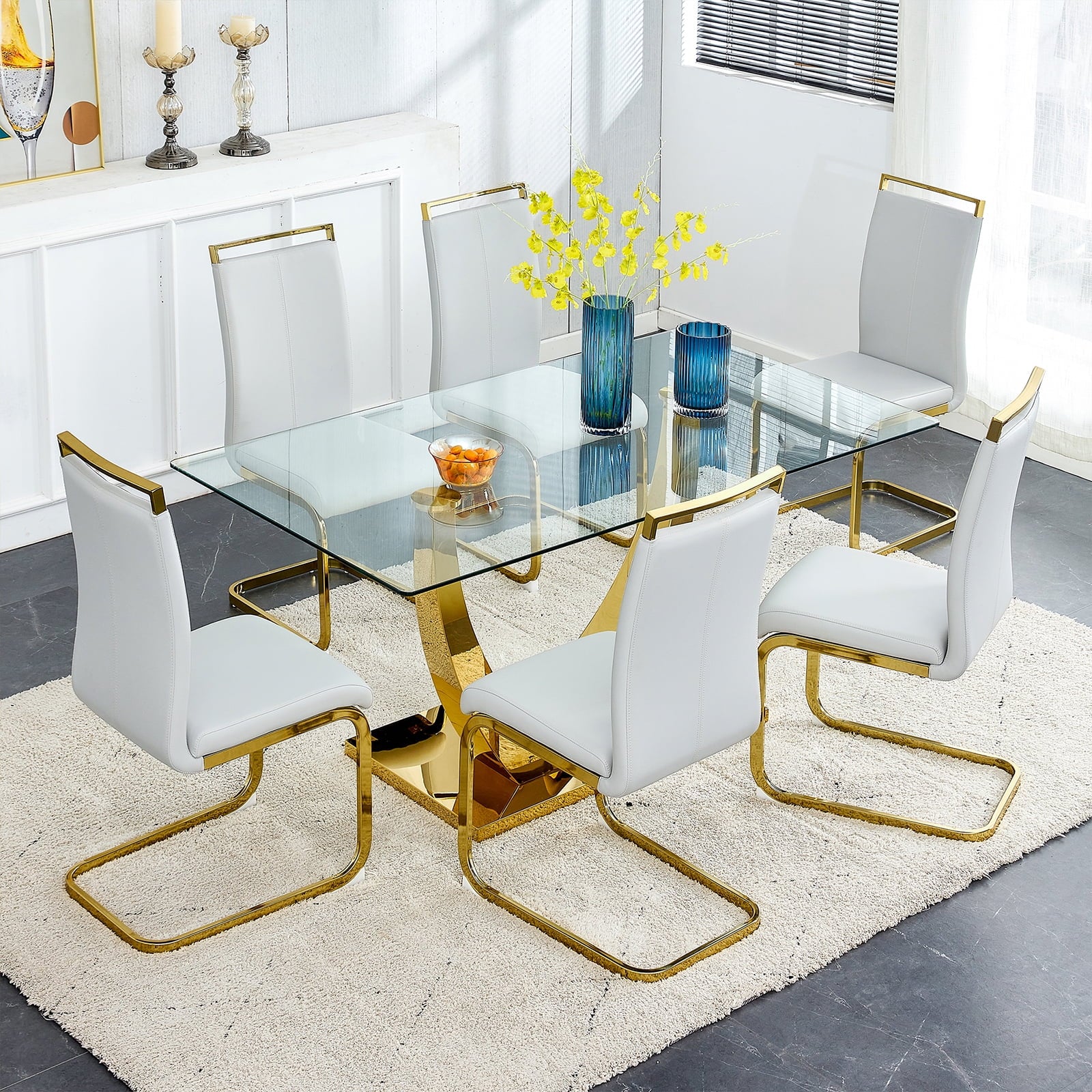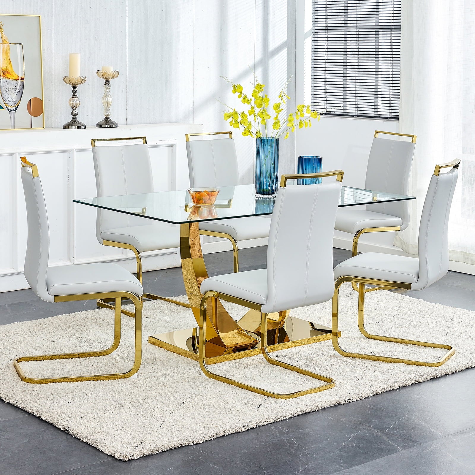 Glass Dining Table Set for 6, Sudica 63"Rectangular Dining Room Table and Leather Dining Chairs Set with Chrome Gold Legs, Light Gray