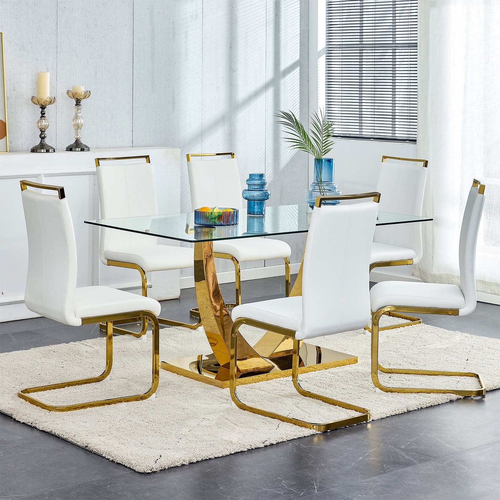 Glass Dining Table Set for 6, Sudica 63"Rectangular Dining Room Table and Leather Dining Chairs Set with Chrome Gold Legs, White
