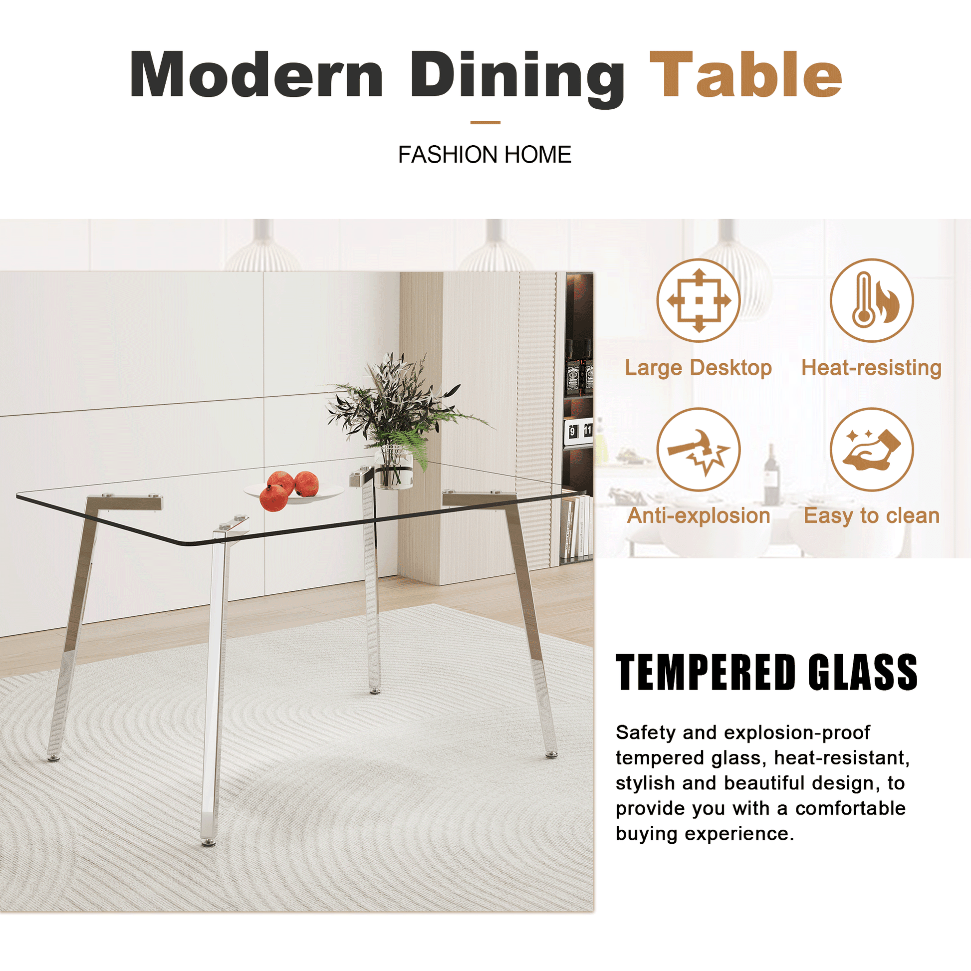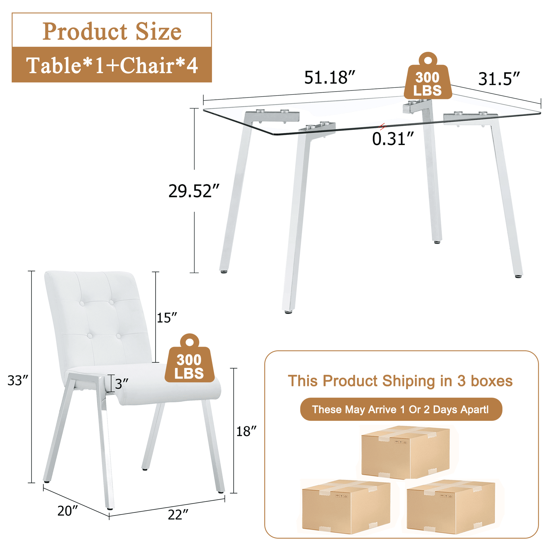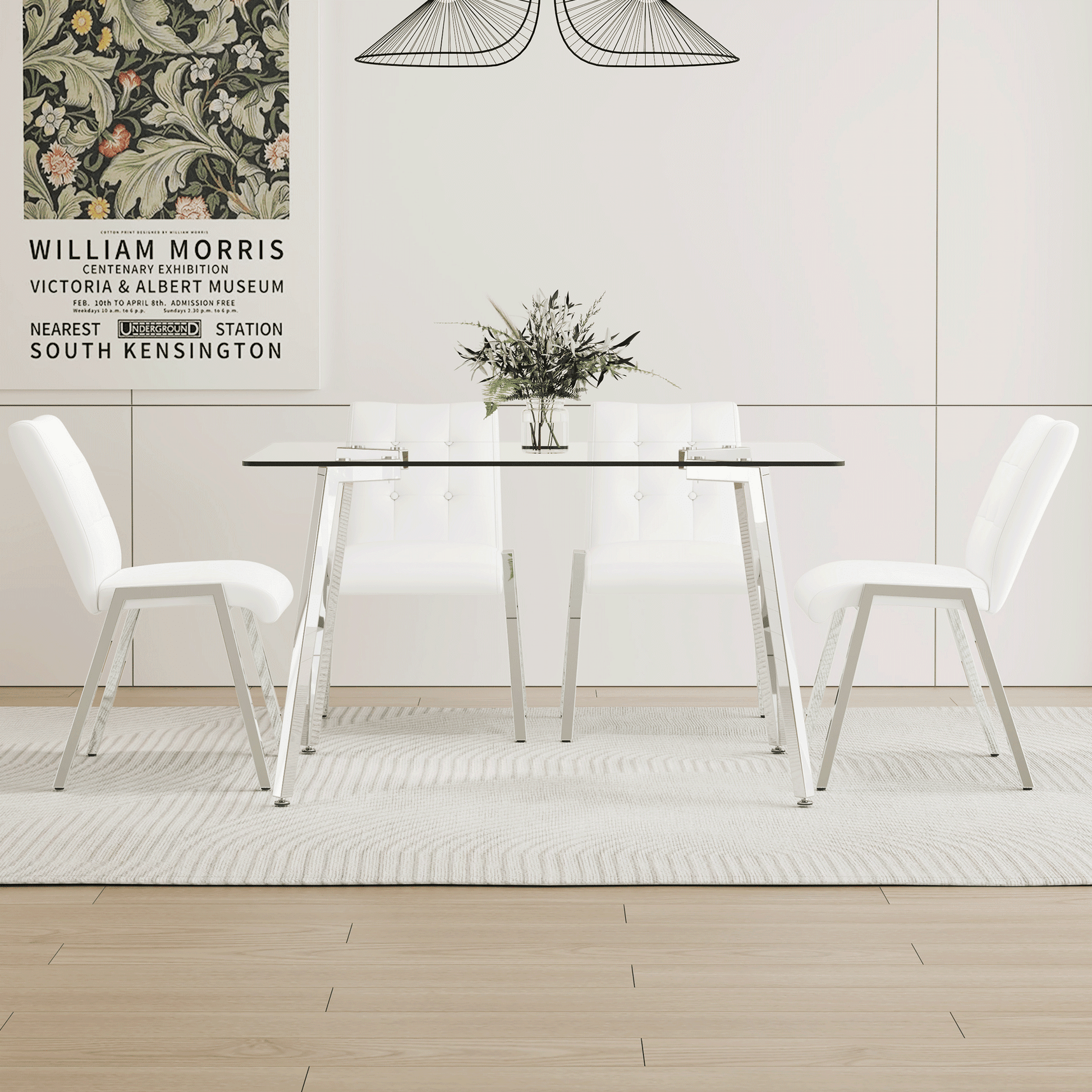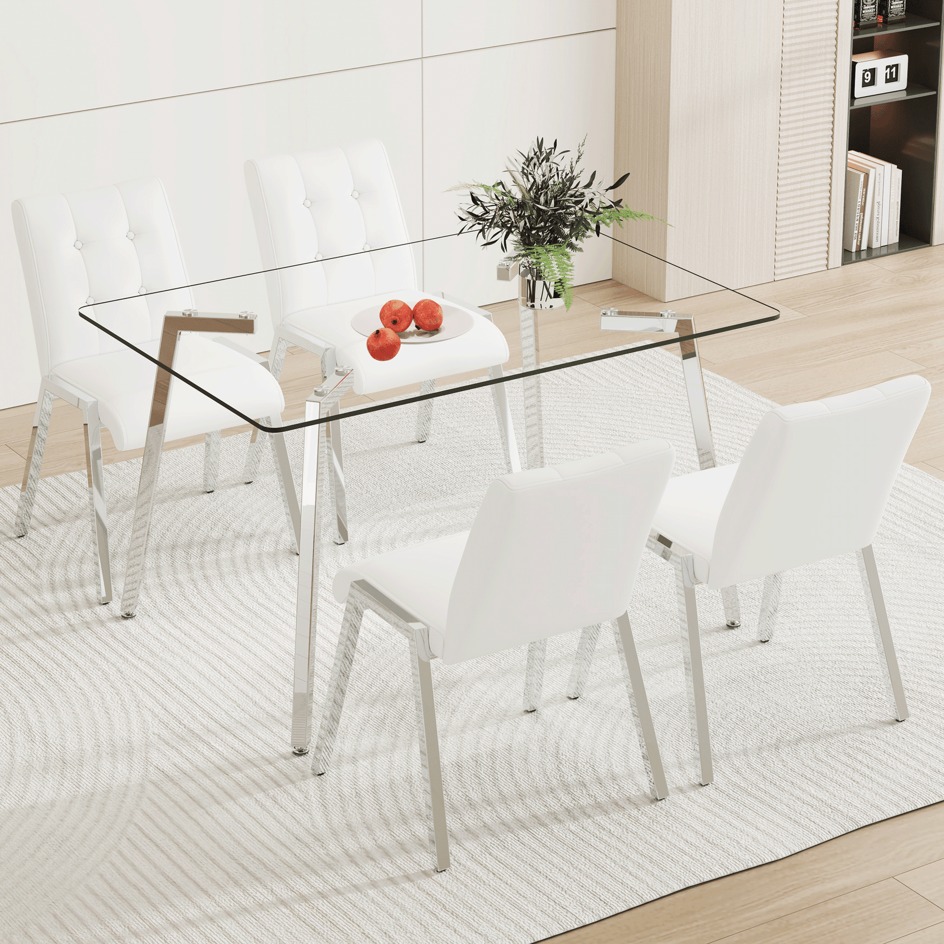Our glass dining table and chair set combines simplicity and elegance. The glass kitchen table is made of durable tempered glass that resists heat and scratches.The transparent top is sturdy and safe. The dining room chairs feature comfortable seats upholstered in easy-to-clean, waterproof PU leather. With silver chromo legs, this dining set offers a stylish and cozy dining experience.