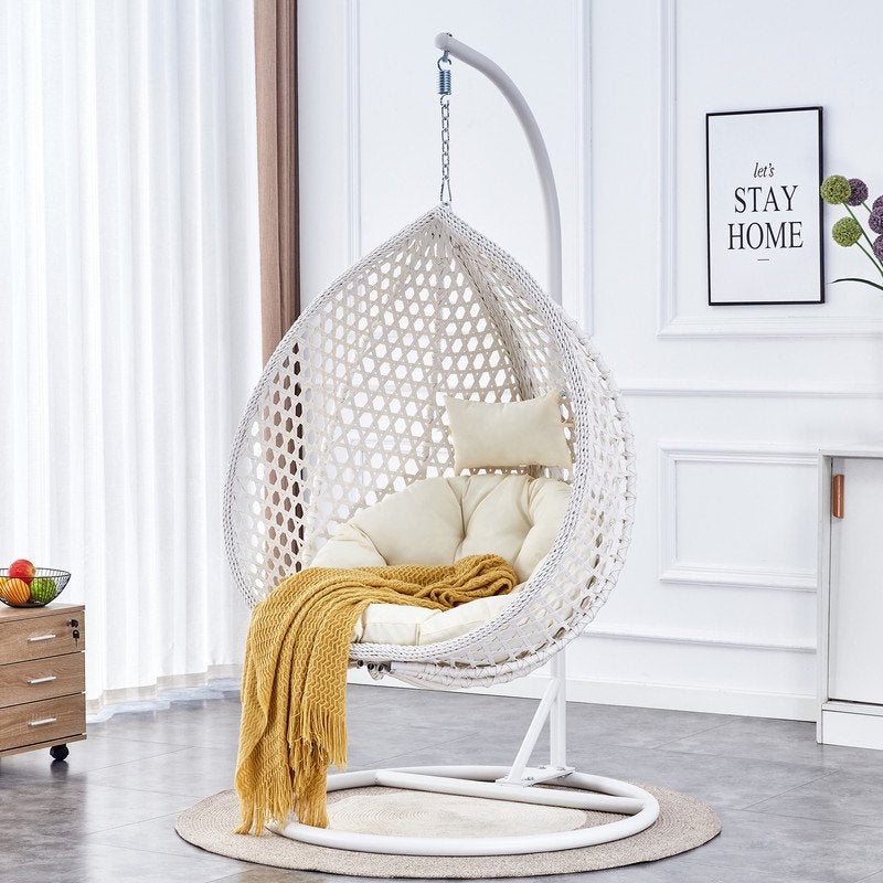 Our Sudica Egg Swing Chair with Stand - is a stylish, comfortable, and durable addition to your patio or garden. Made with high-quality PVC rattan, this swing chair is built to last and can withstand any weather condition. It has a 350lbs weight capacity, making it suitable for everyone in your family. The chair comes with a soft cushion and pillow for added comfort. It is easy to assemble with clear instructions and all necessary hardware included. Versatile in design, it fits seamlessly into any space, adding a modern and chic element. Upgrade your relaxation experience today with the Sudica Egg Swing Chair with Stand.