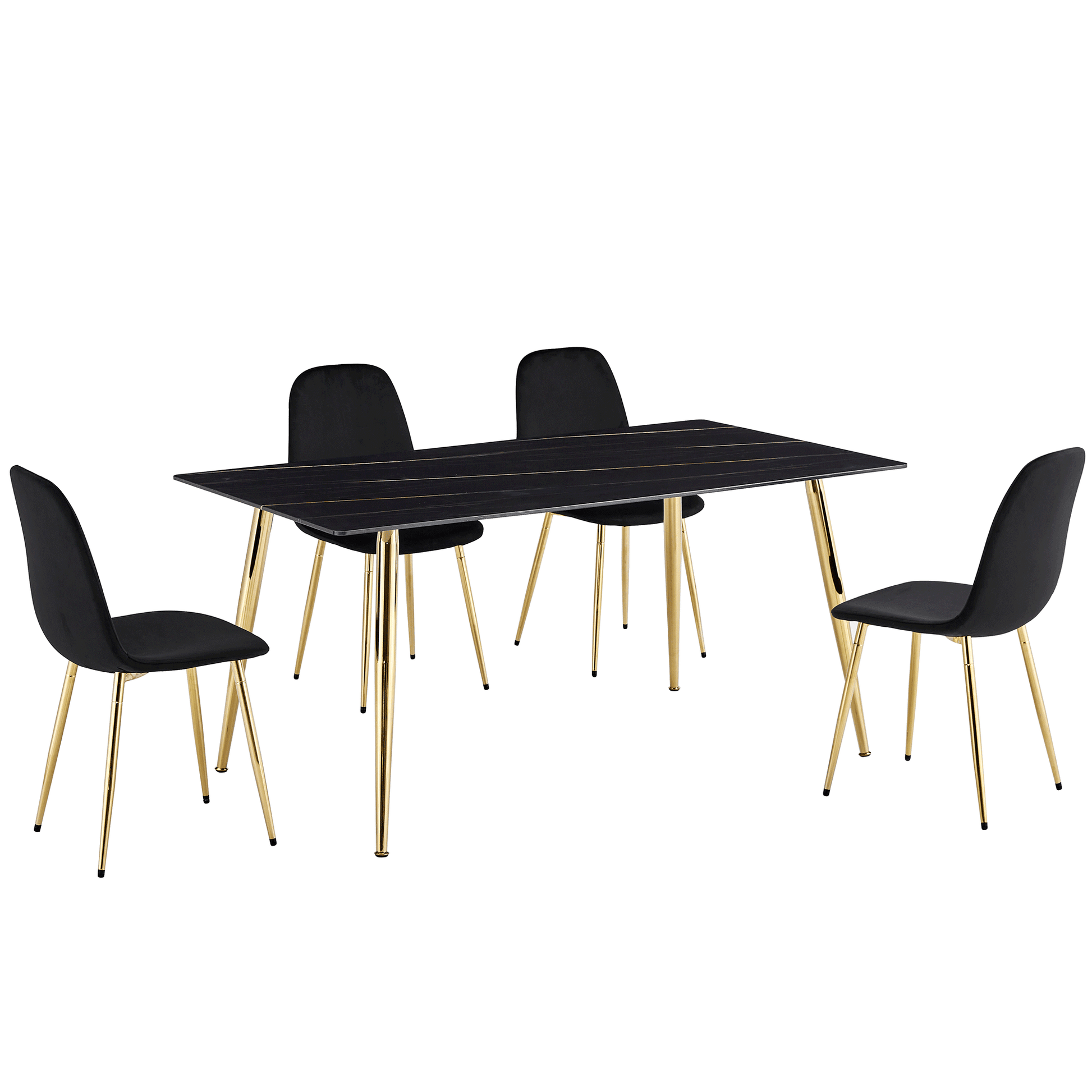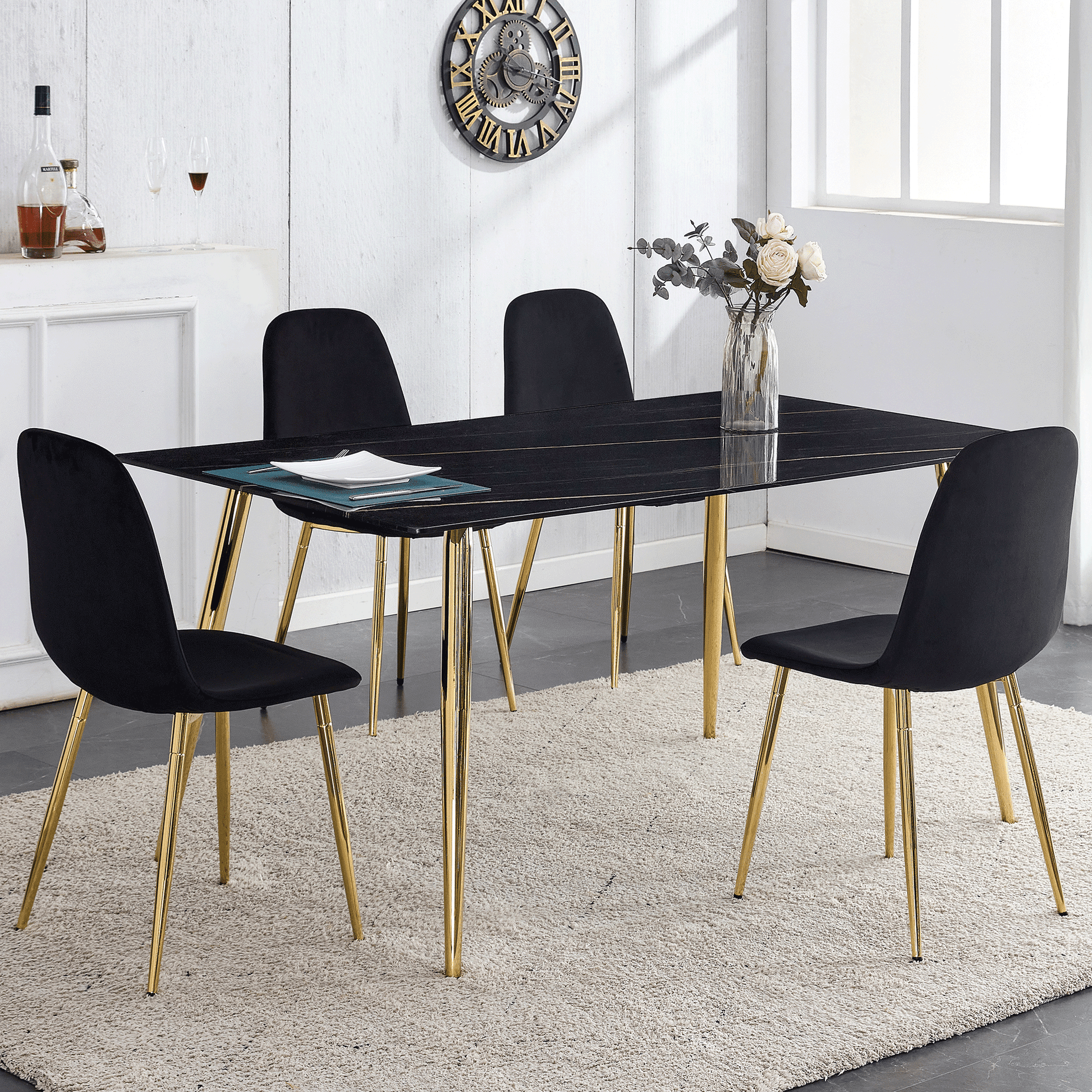 Our elegant 5-piece dining table set are prefect for compact dining room. This dining room set features a black faux marble dining table with sturdy gold metal legs. The marble top adds a touch of sophistication and allows for easy cleaning. The dining chairs are cover with soft black velvet, providing optimal comfort for extended periods. With a modern design, these gold metal legs kitchen chairs perfectly complement the marble table, creating a cohesive look in your space. Designed for small spaces, this set is ideal for apartments or cozy dining areas.