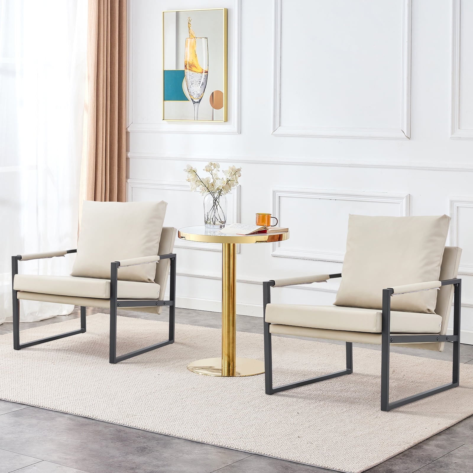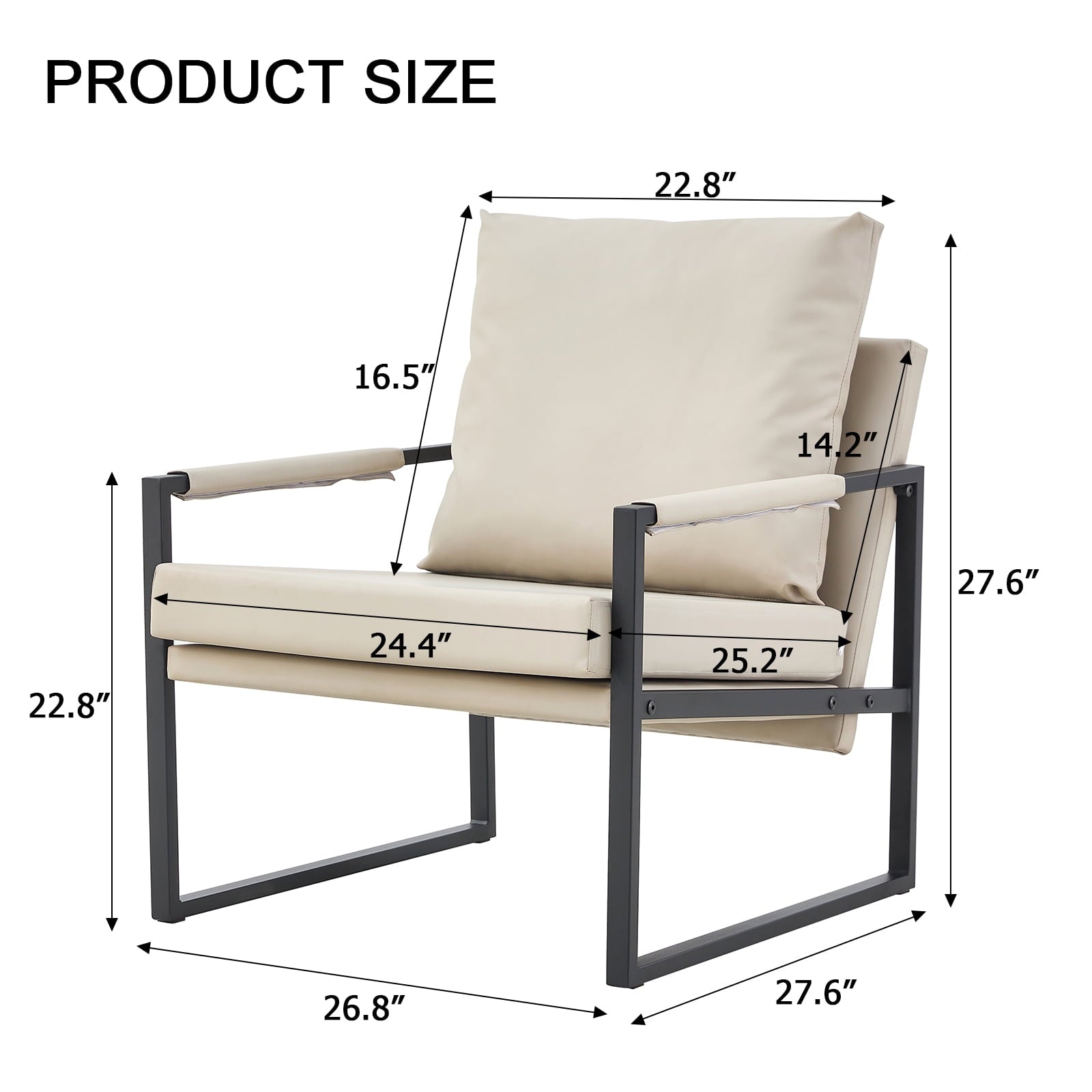 Mid-Century Accent Chair Metal Frame Faux Leather Reading Arm Chair for Living Room and Bedroom, Beige