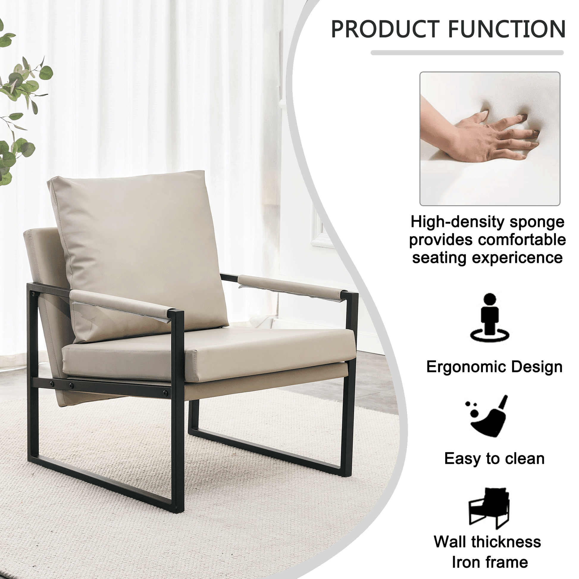 - Cozy Living Room Chair--Get ready to sink into pure comfort with our cozy armchair. Featuring a high-density foam cushion and a skin-friendly faux leather seat, this chair offers unparalleled relaxation. The proper high armrest and wide backrest provide optimal support for your body.