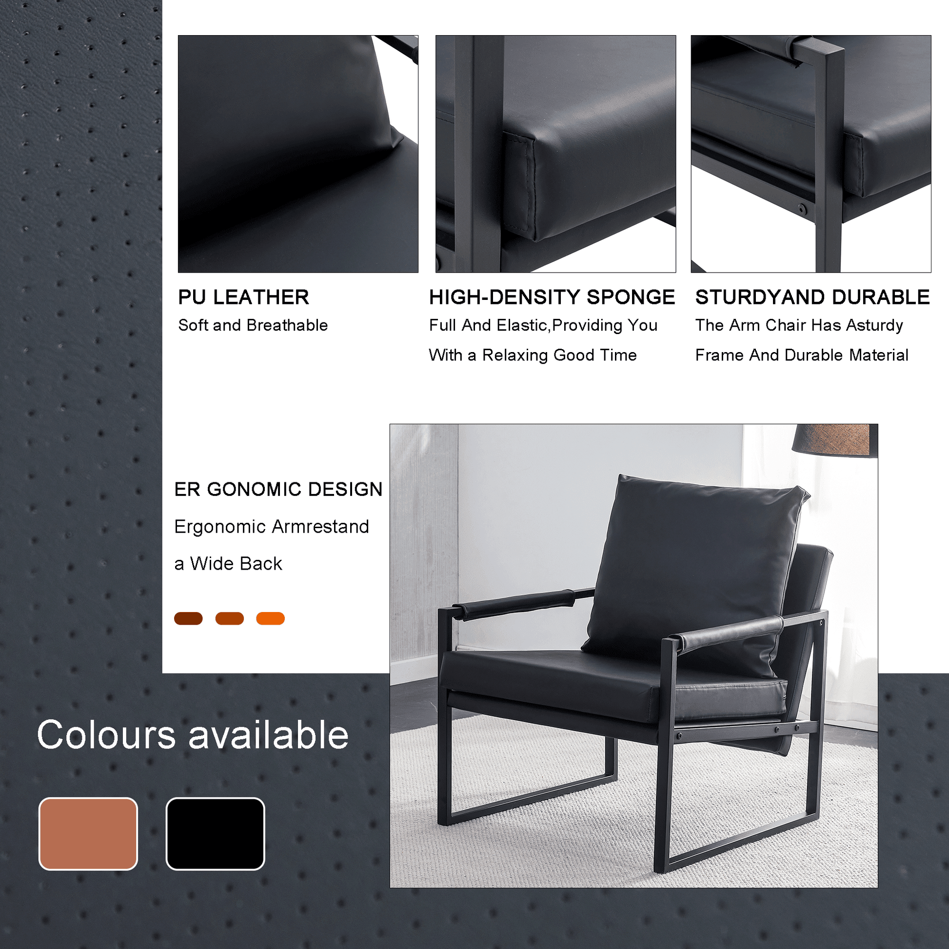 - Cozy Living Room Chair--Get ready to sink into pure comfort with our cozy armchair. Featuring a high-density foam cushion and a skin-friendly faux leather seat, this chair offers unparalleled relaxation. The proper high armrest and wide backrest provide optimal support for your body.