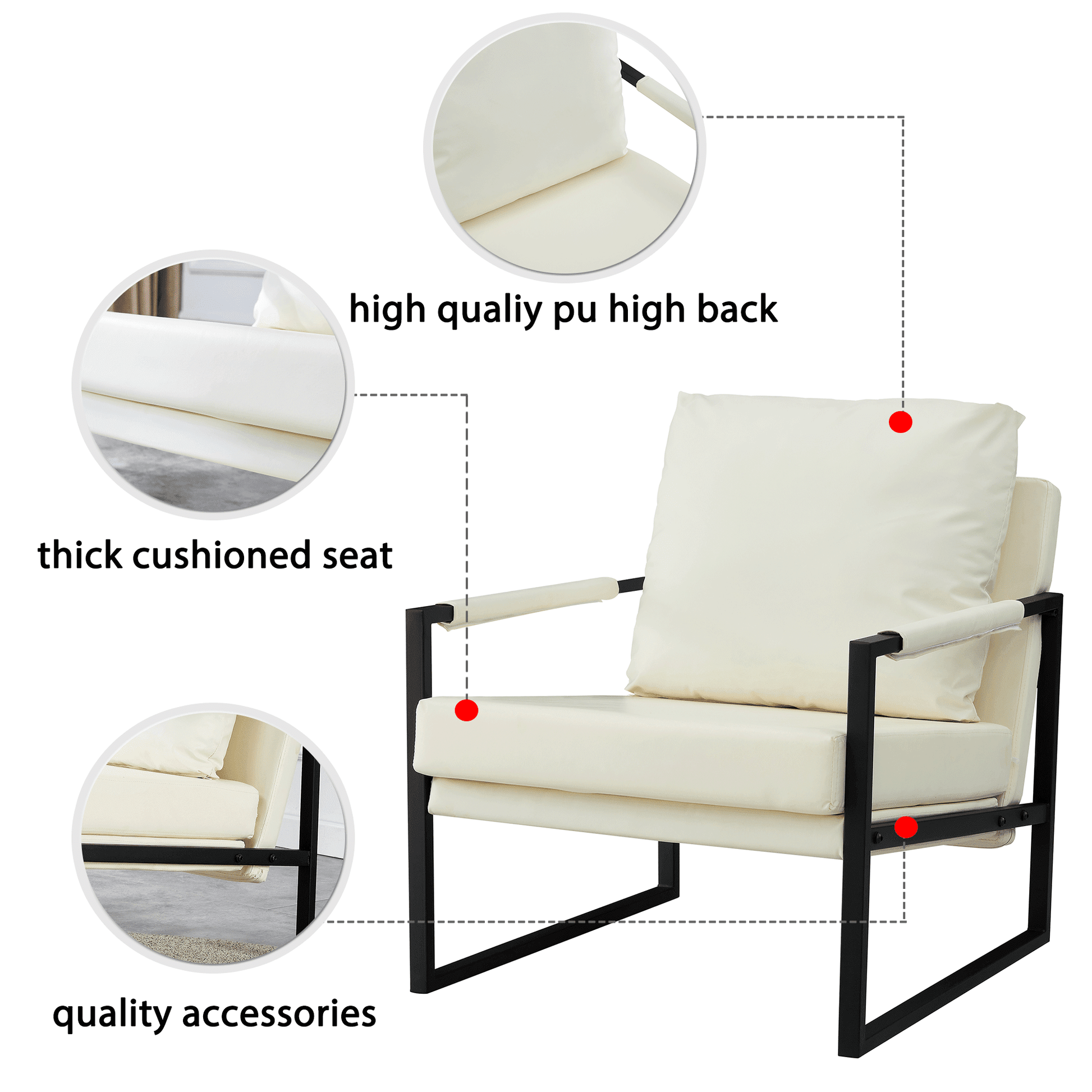 - Cozy Living Room Chair--Get ready to sink into pure comfort with our cozy armchair. Featuring a high-density foam cushion and a skin-friendly faux leather seat, this chair offers unparalleled relaxation. The proper high armrest and wide backrest provide optimal support for your body.