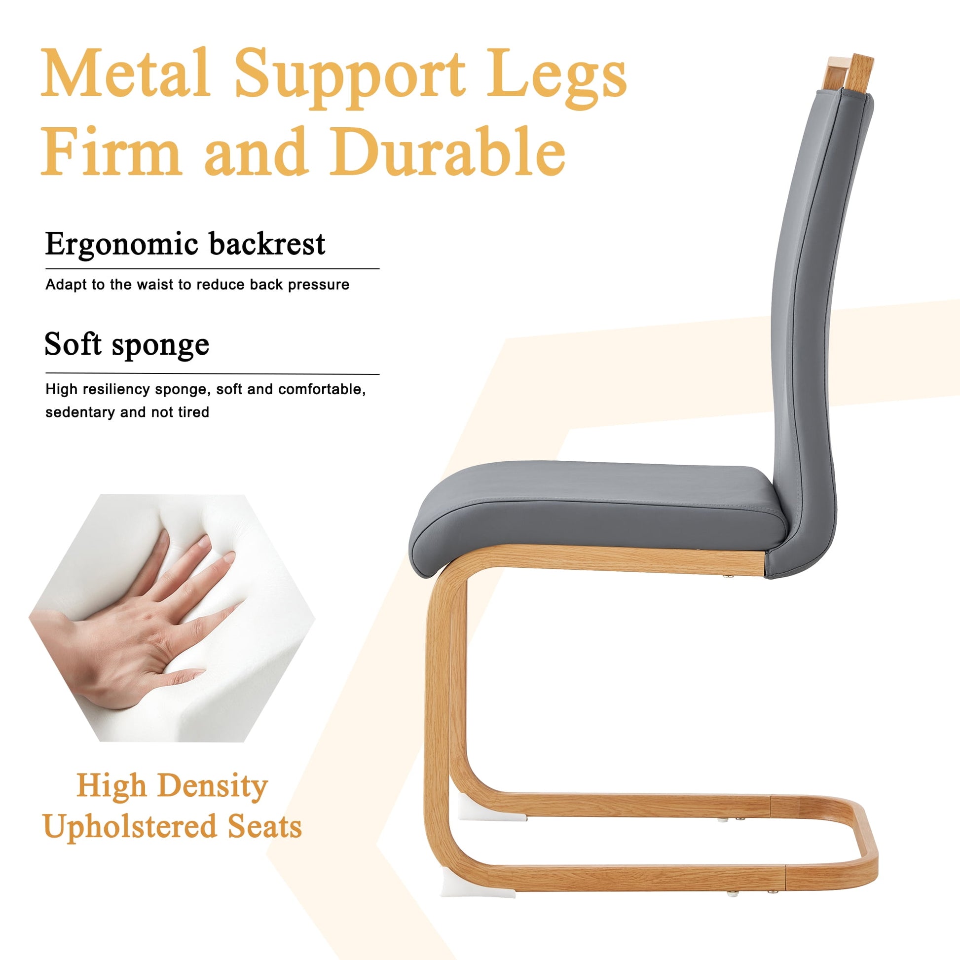 Indulge in ultimate comfort with our faux leather dining chair. Crafted with wood grain metal legs, it ensures durability and stability. The tall backrest gently soothes your back muscles, while the high-density elastic sponge guarantees a luxurious sitting experience. Wrapped in breathable faux leather, our kitchen chairs adds an extra layer of comfort and relaxation. Perfect for homes, restaurants, and cafes, this chair is a stylish and functional addition to any space.