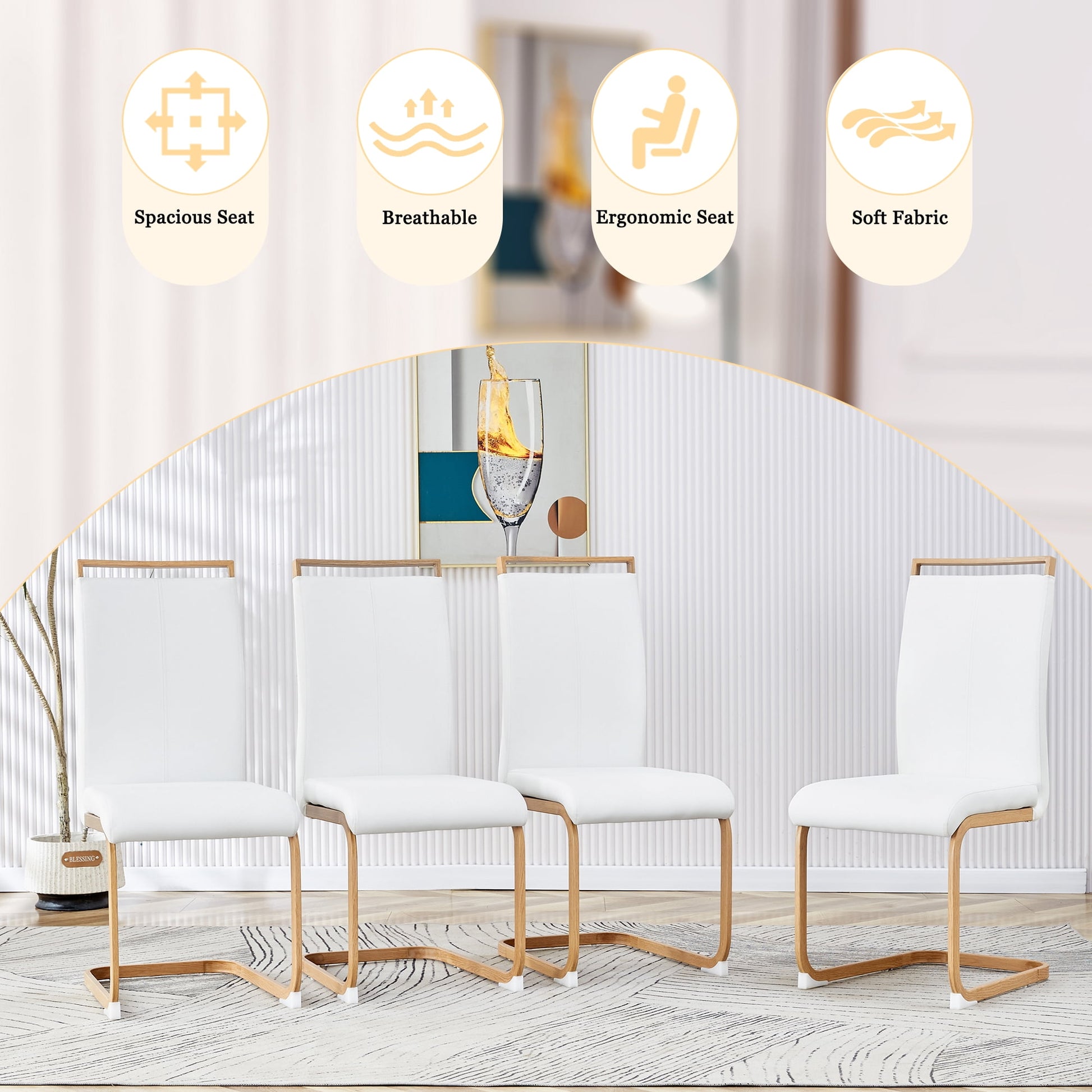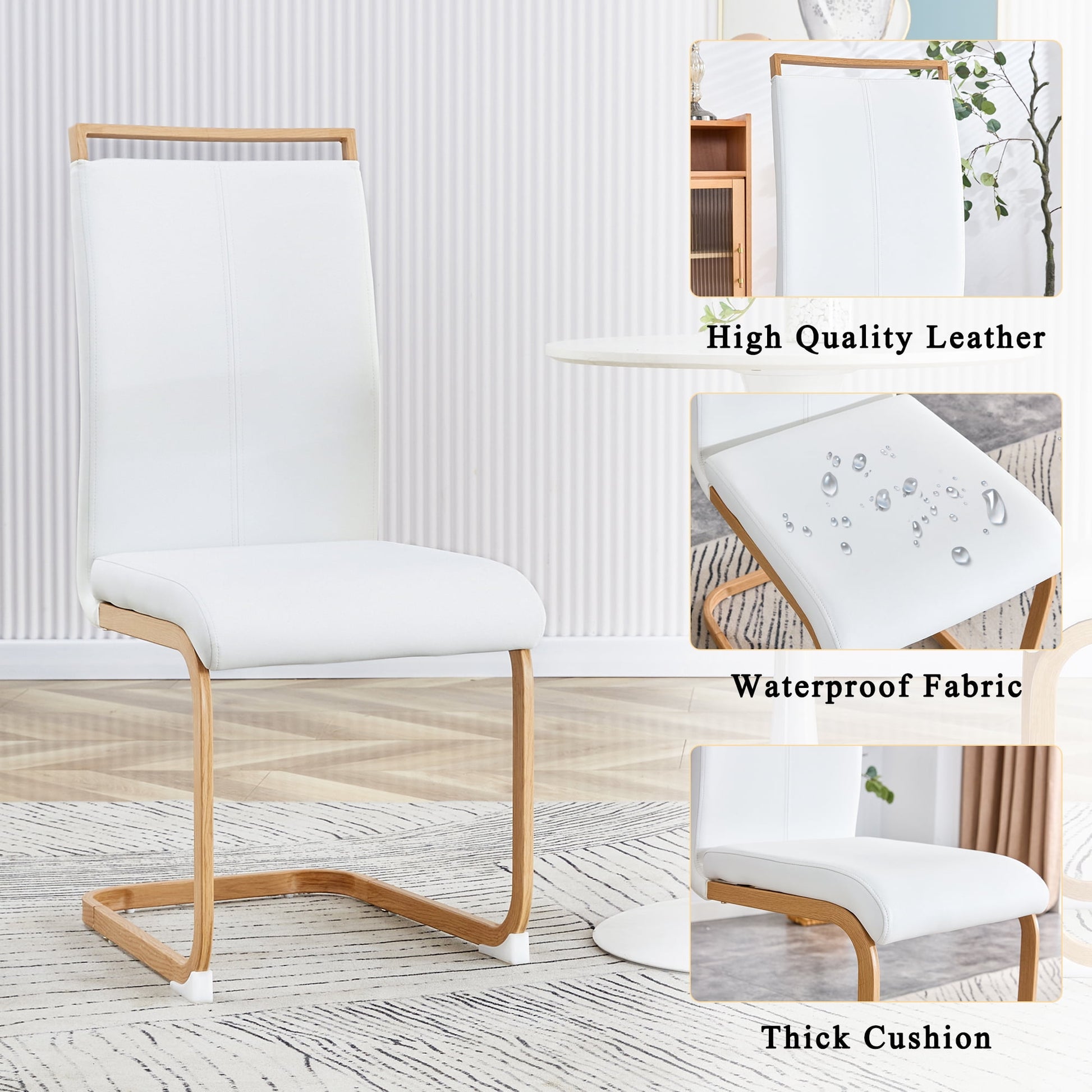 - ¡¾Robust and Stylish¡¿ Crafted with a sturdy frame, these dining room chairs offer durability and stability. The sleek C-shaped wood grain chrome base not only adds a traditional touch to your space but also ensures a strong foundation for years of reliable use. To protect your floors from scratches and scuffs, the chairs are thoughtfully equipped with anti-scratch plastic feet.