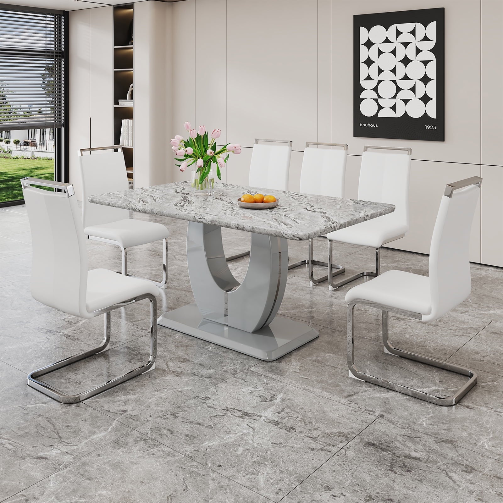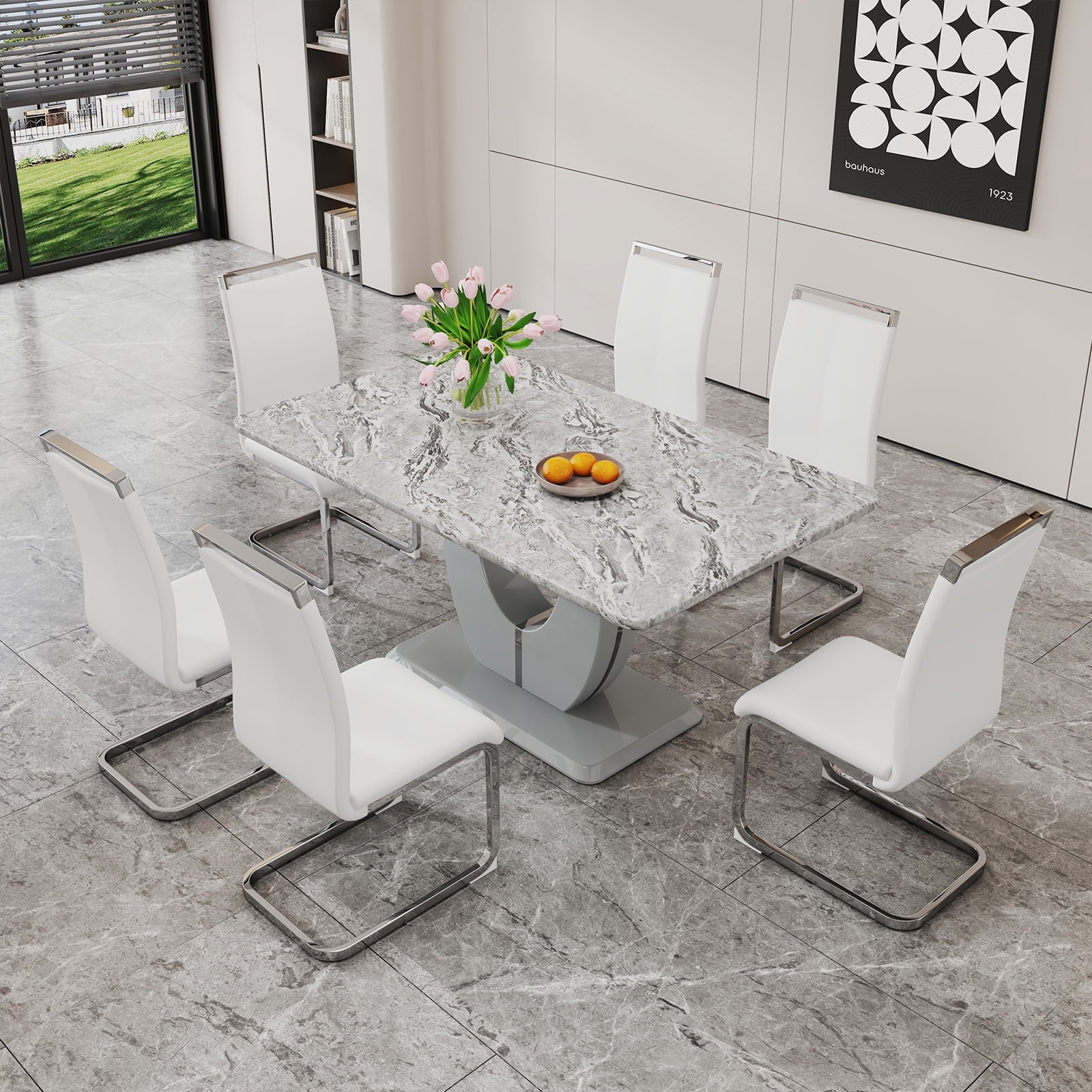 Modern Dining Table Set for 6,Sudica Rectangular Marble Kitchen Table Set with 6 PU Leather Upholstered Dining Room Chairs, White