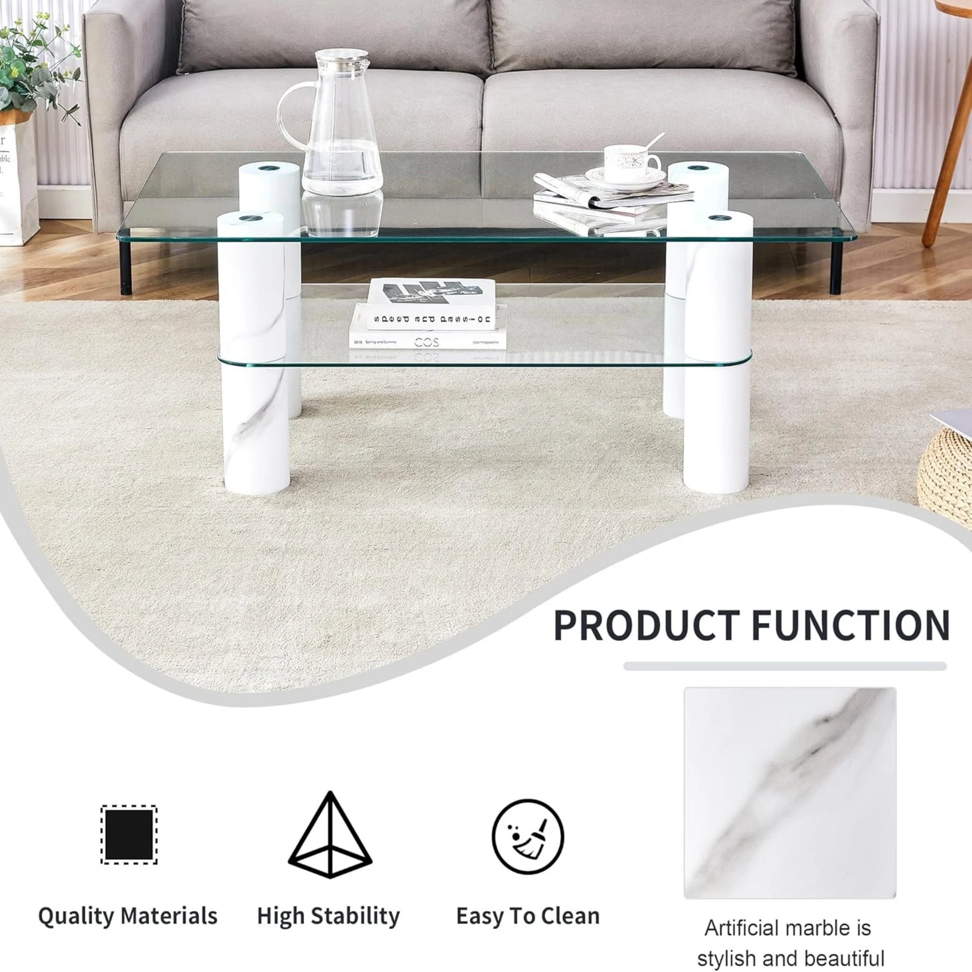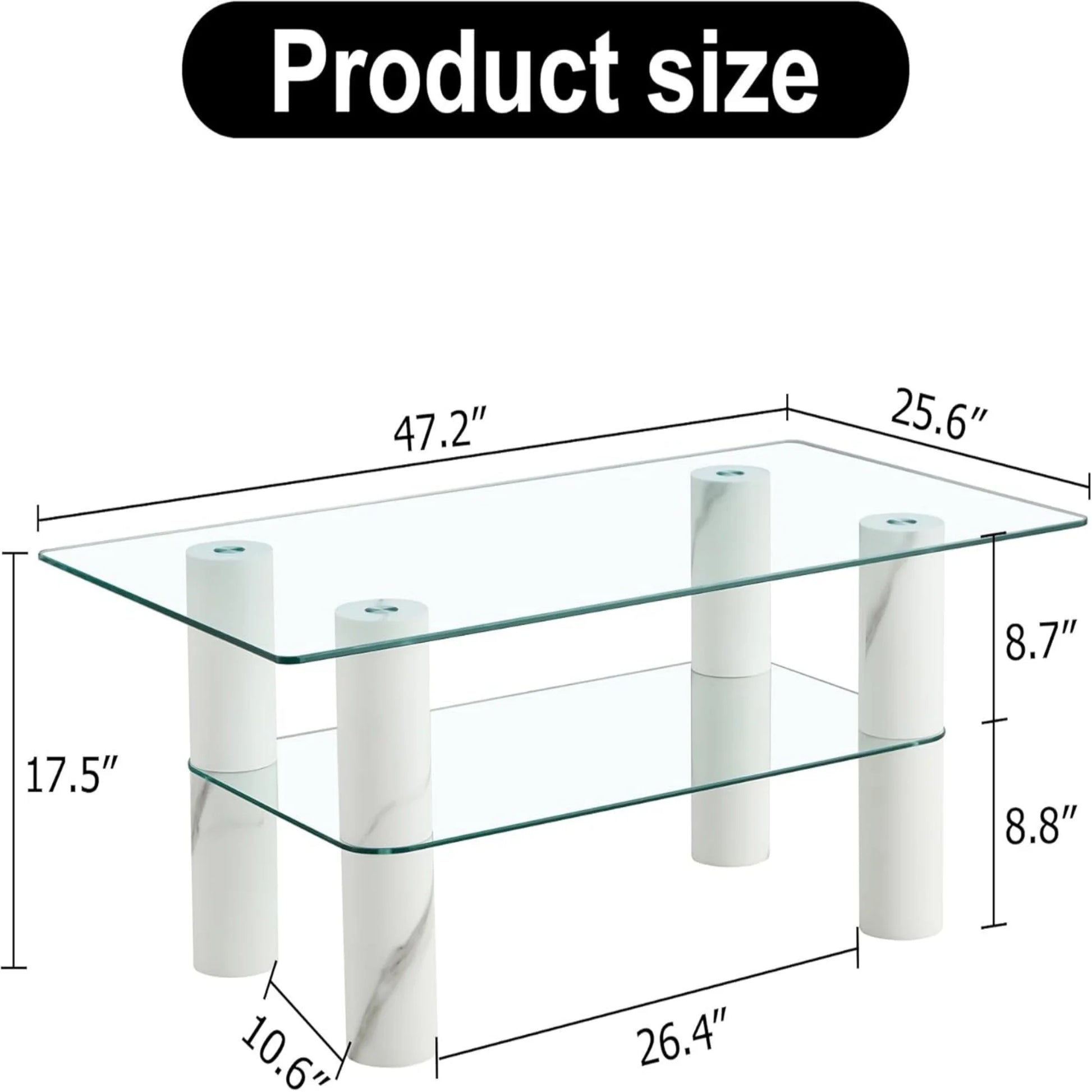 Modern Minimalist Double Layered Transparent Tempered Glass Coffee Table,47" Sudica Rectangular Tea Table with White Legs