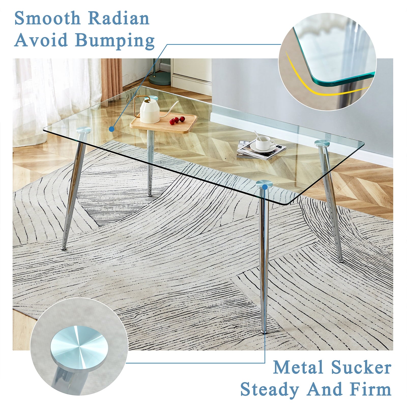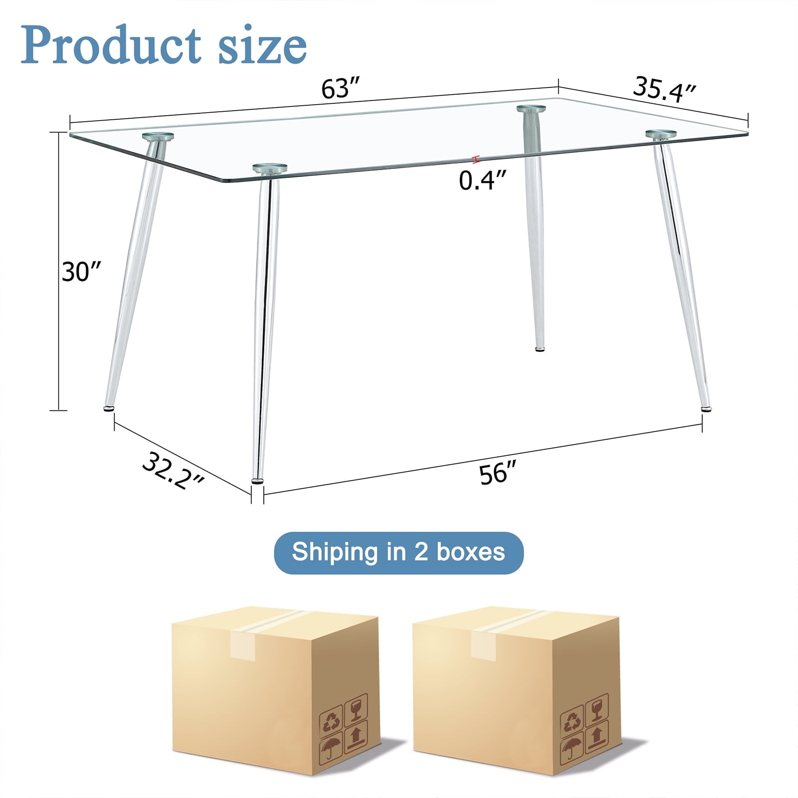 Tempered Glass Dining Table for 4, Sudica 63" Modern Rectangular Glass Kitchen Table with 4 Silver Plating Metal Legs